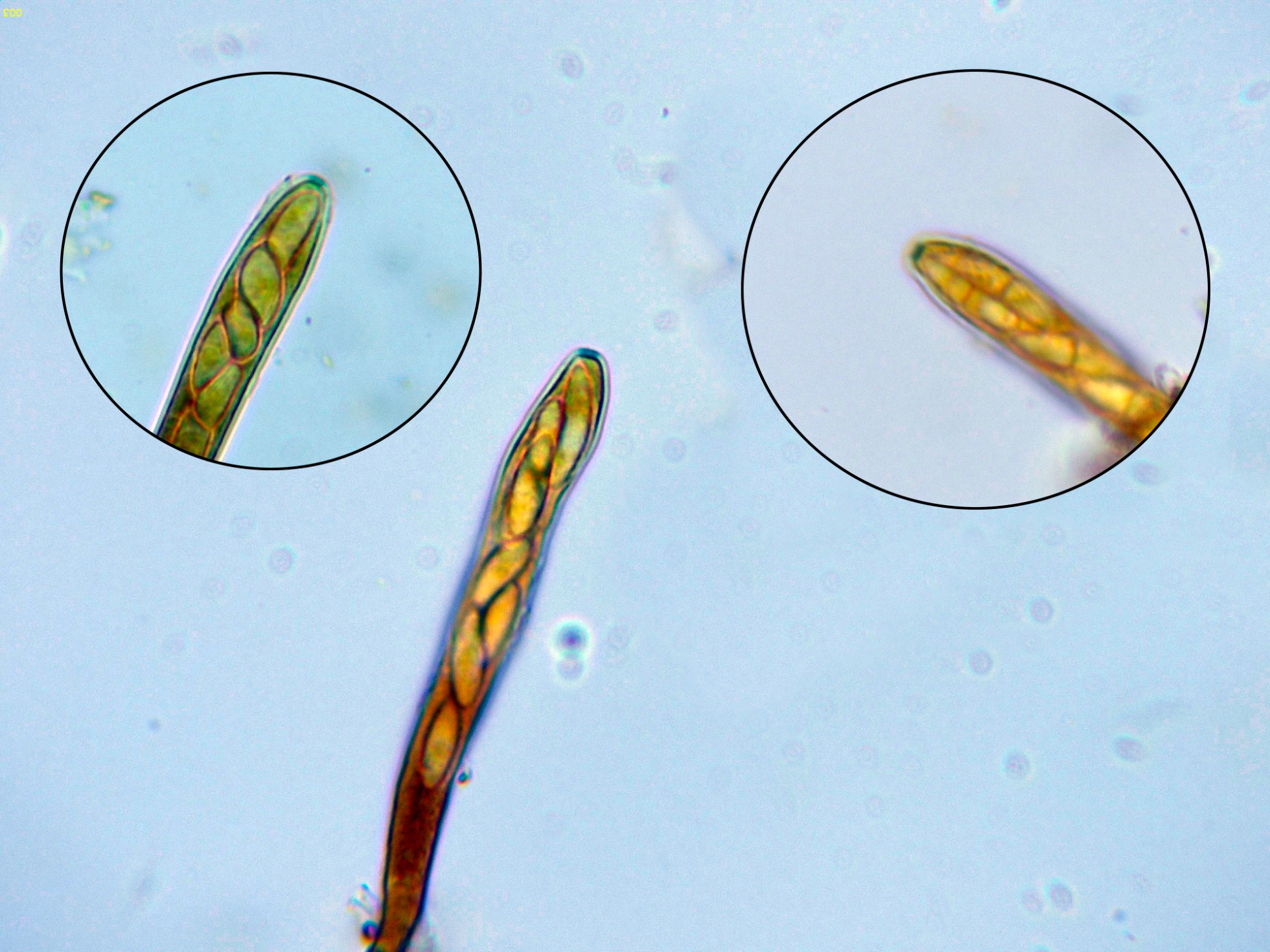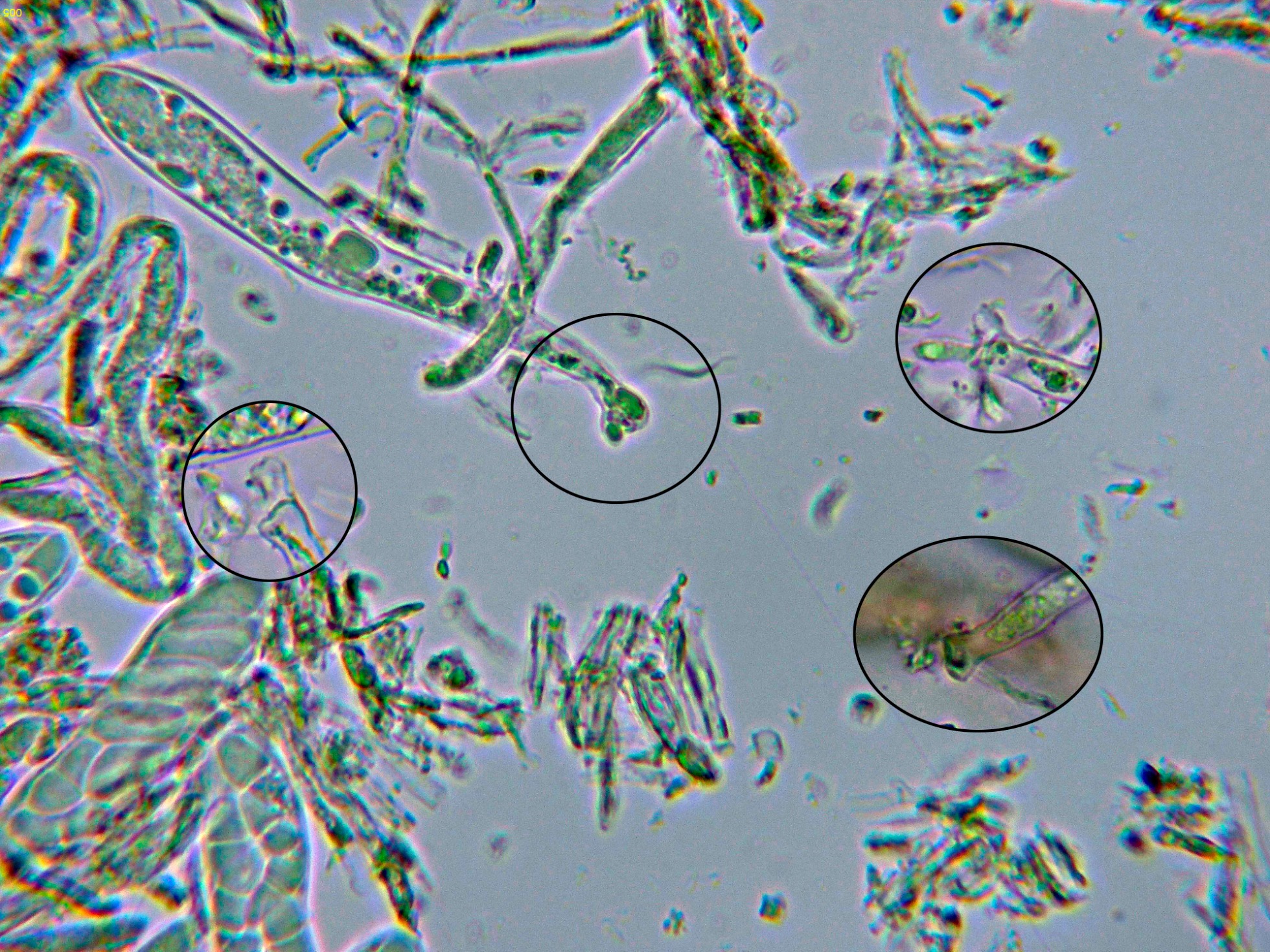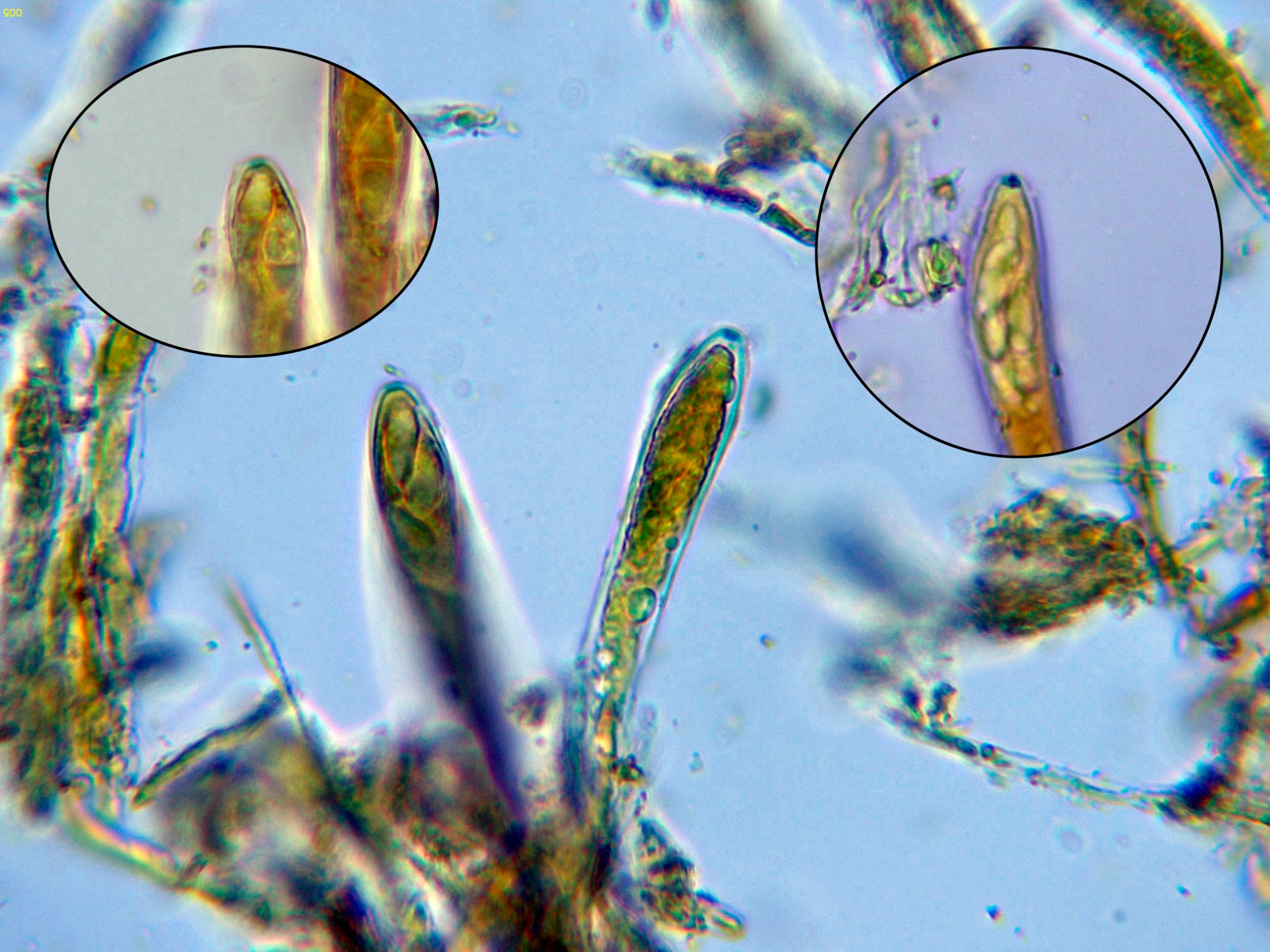 A nivel de microscopía la diferencia entre ambas estaría en la reacción amiloide del aparato apical en el caso de la Rodwayella sessilis y la no reacción en el caso del Claussenomyces prassinulus.