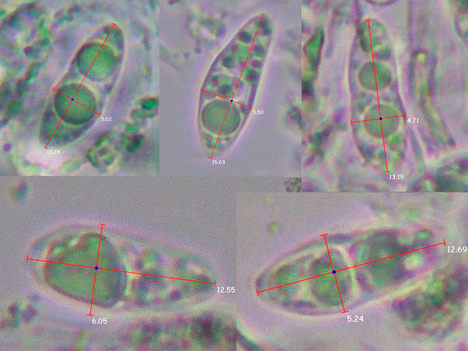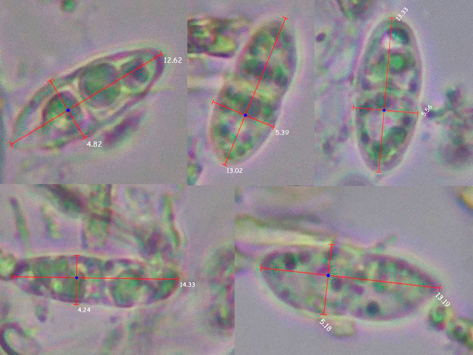 Ascosporas moriformes, con un septo central con un leve constreñimiento y con unas medidas de las esporas libres de (12.5) 12.6 - 14.3 (15.6) × (4.2) 4.7 - 5.6 (6) µm.