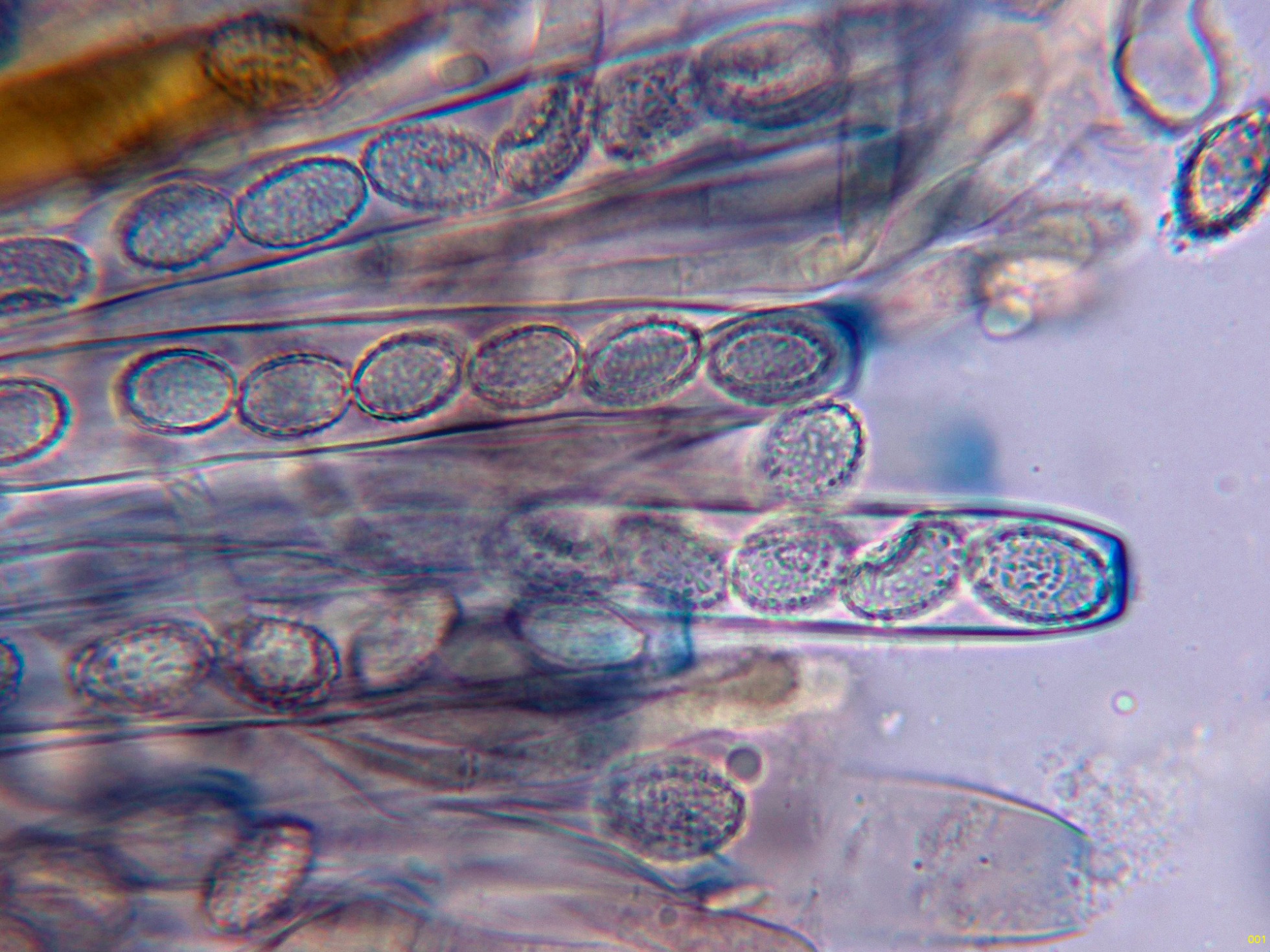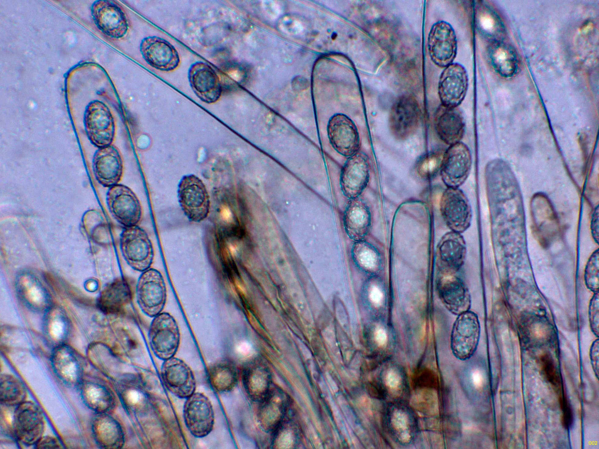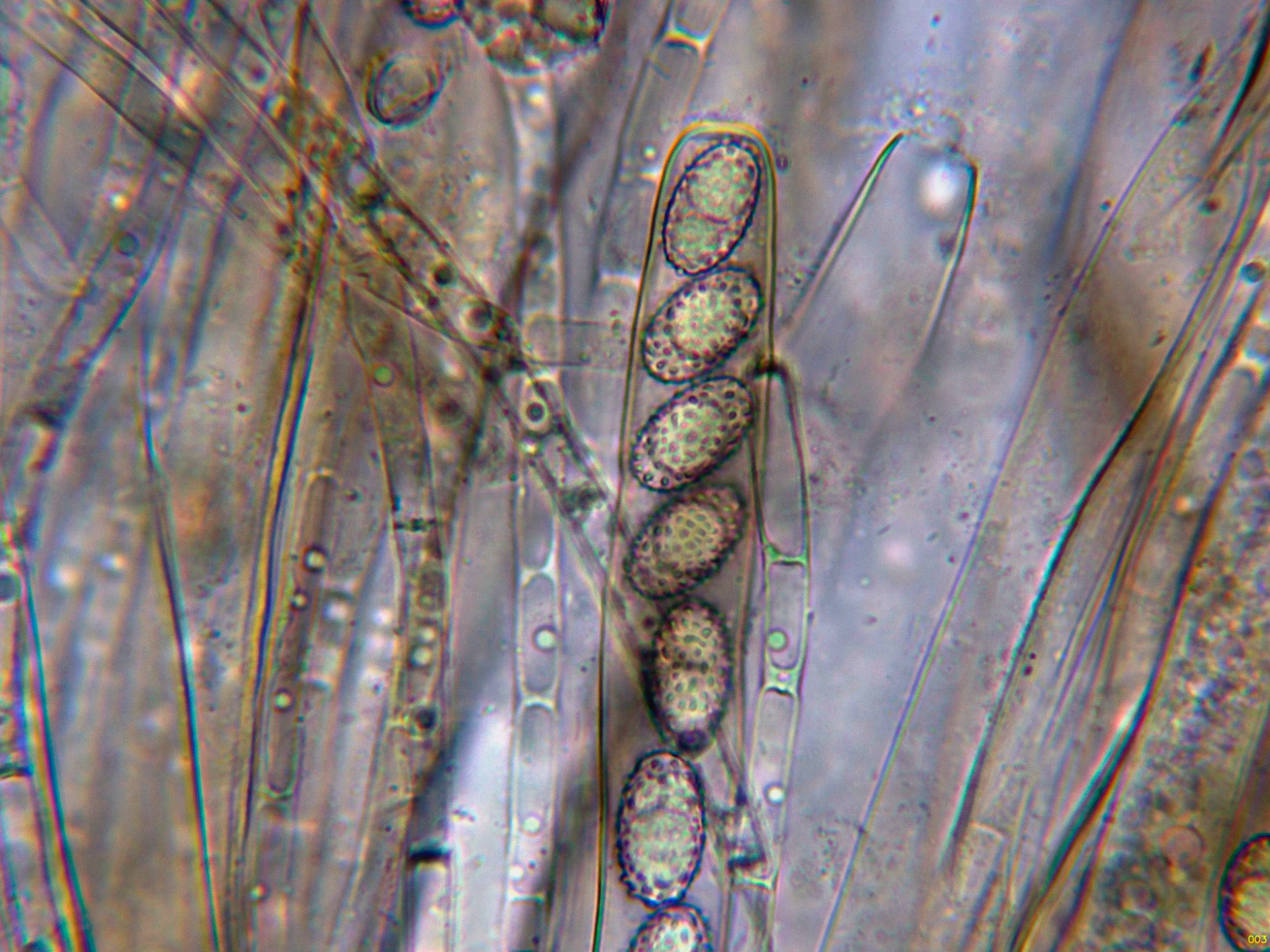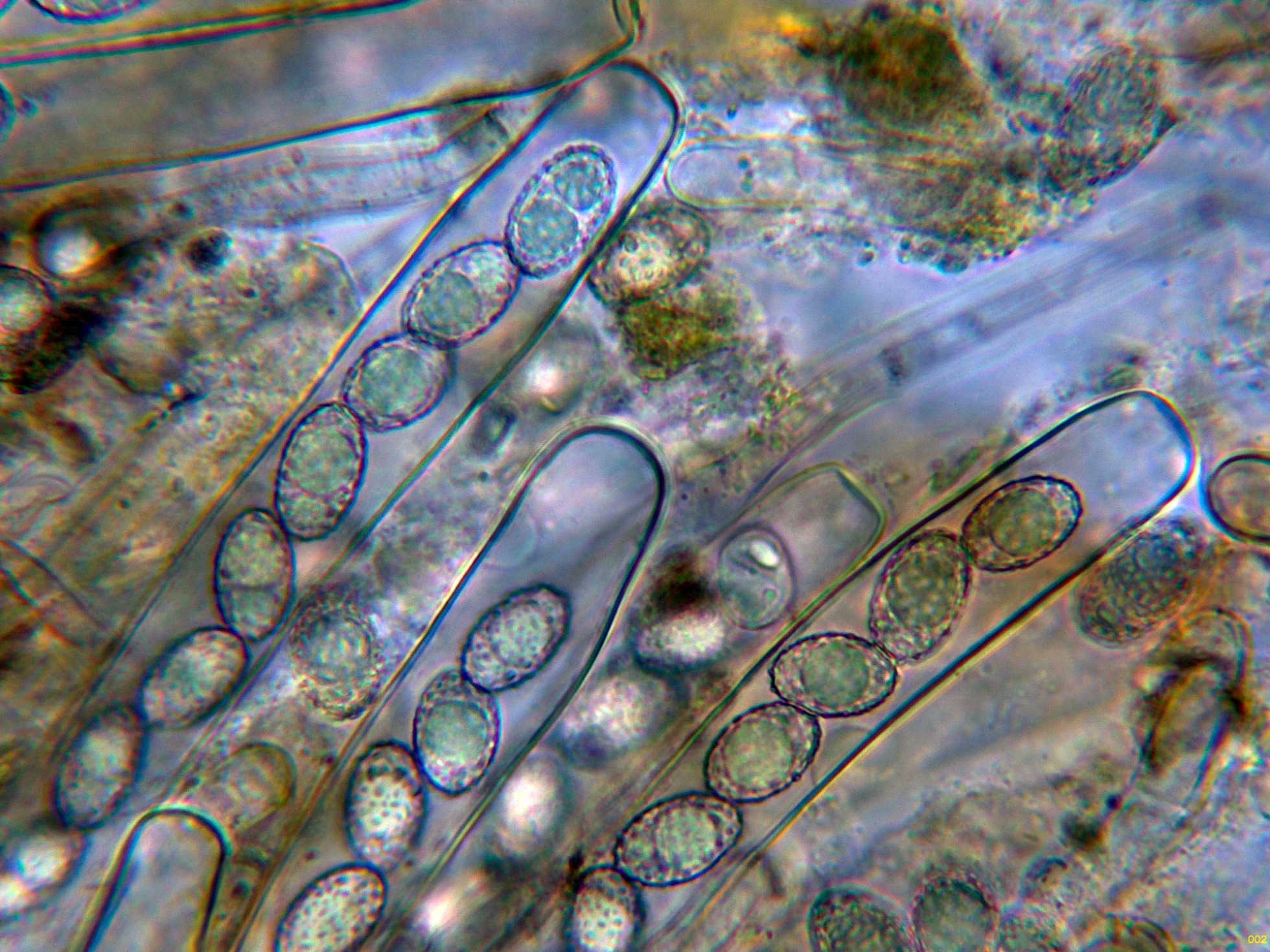 Ascos en Melzer a 400 aumentos, con reacción amiloide.
