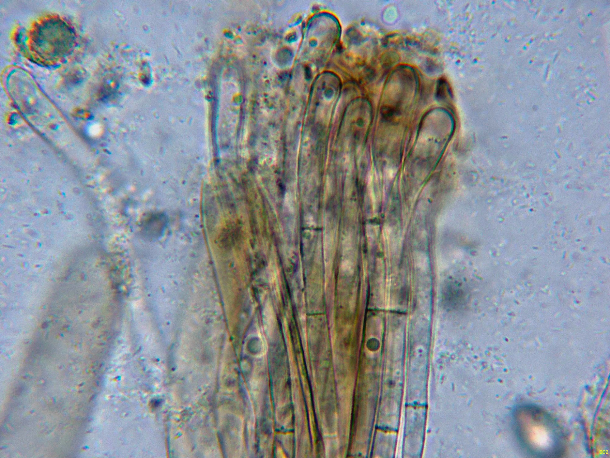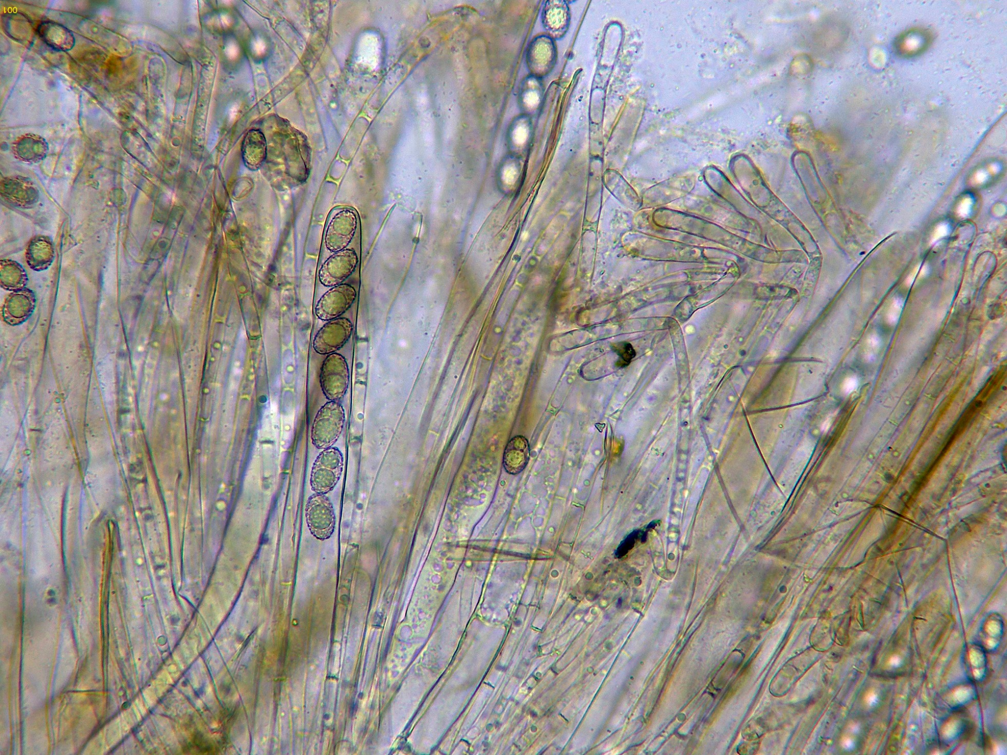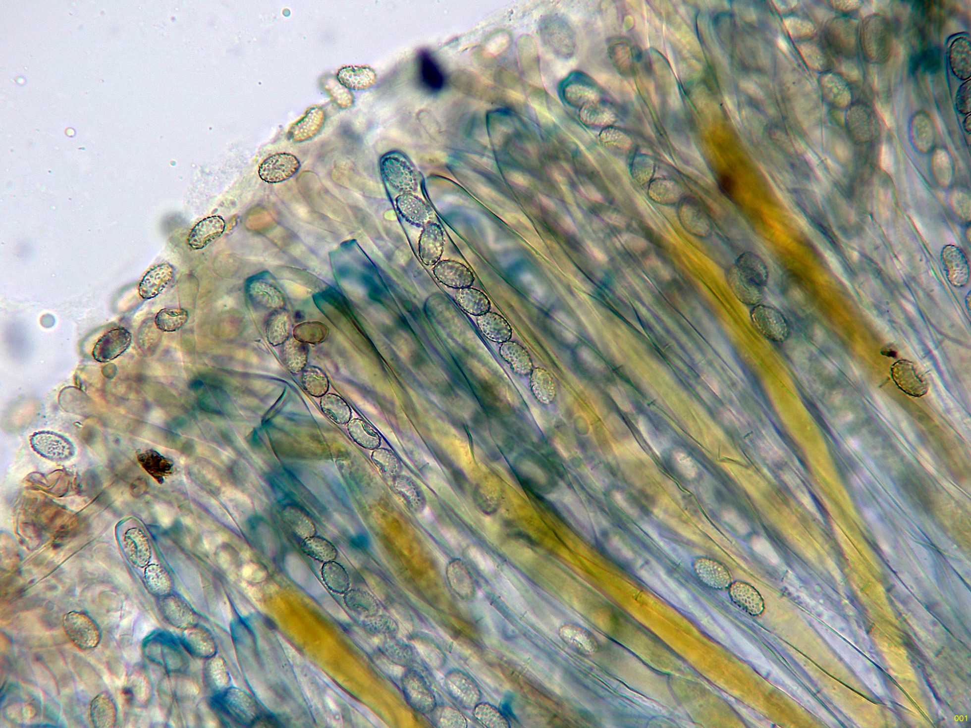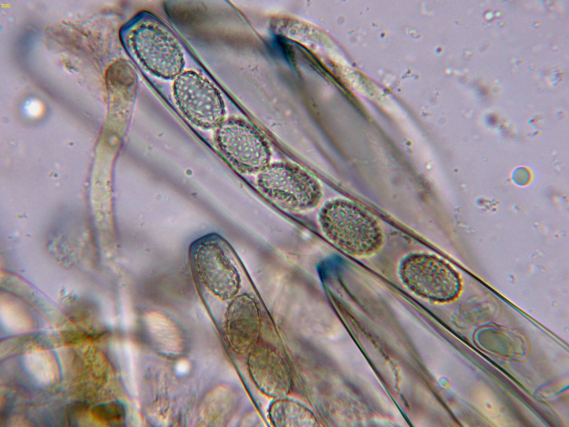 Ascos en Melzer a 400 aumentos, con reacción amiloide.
