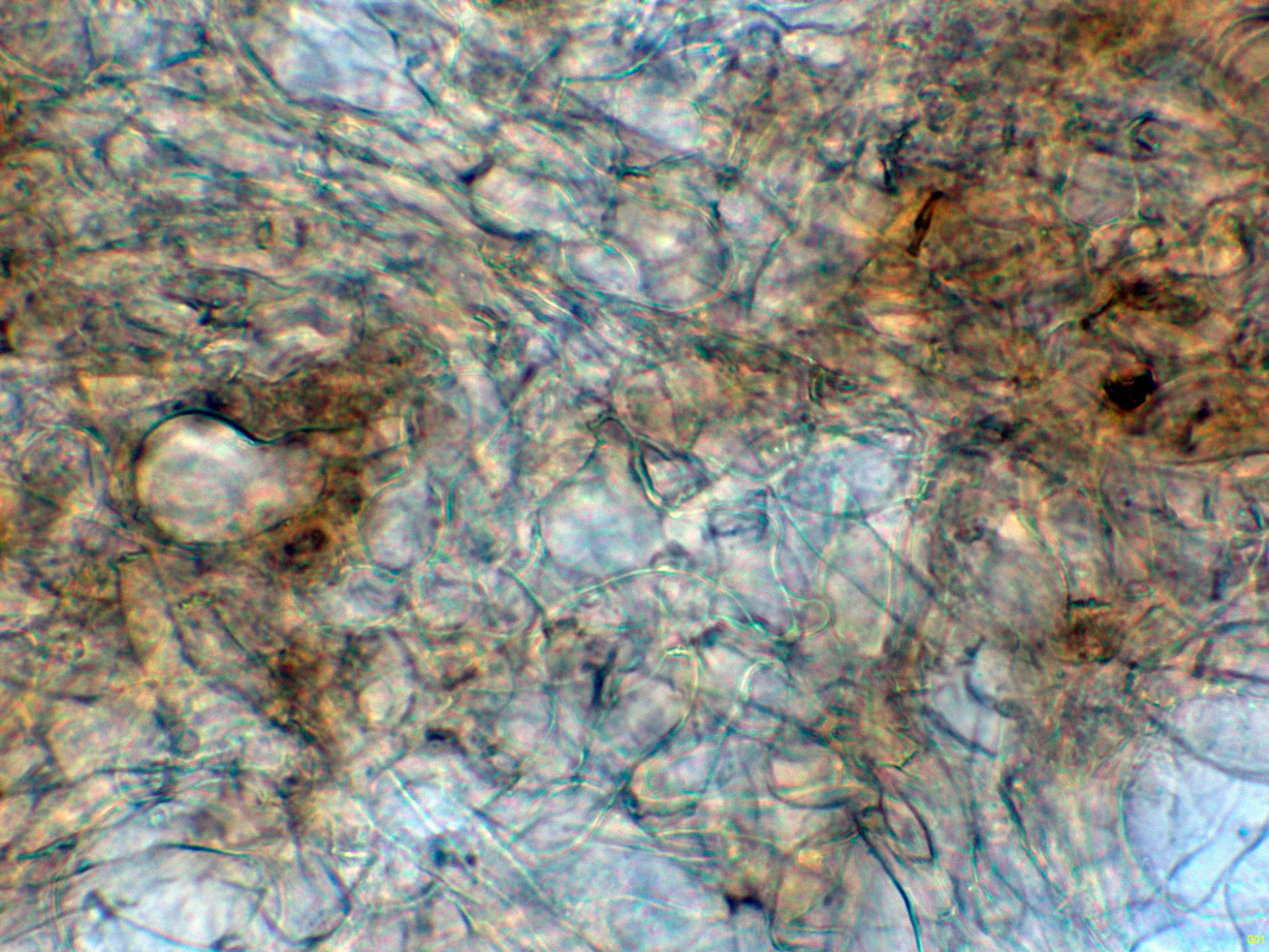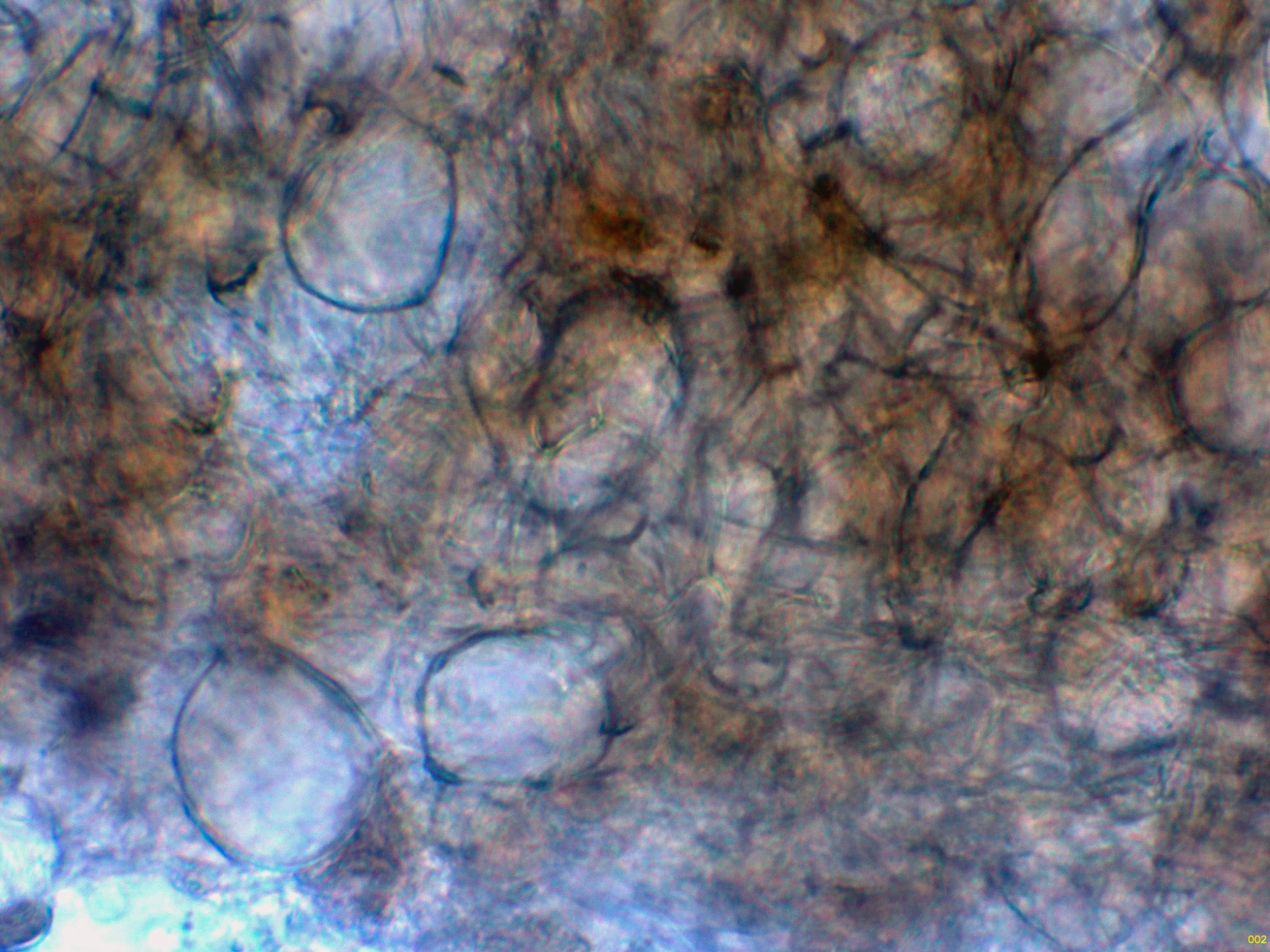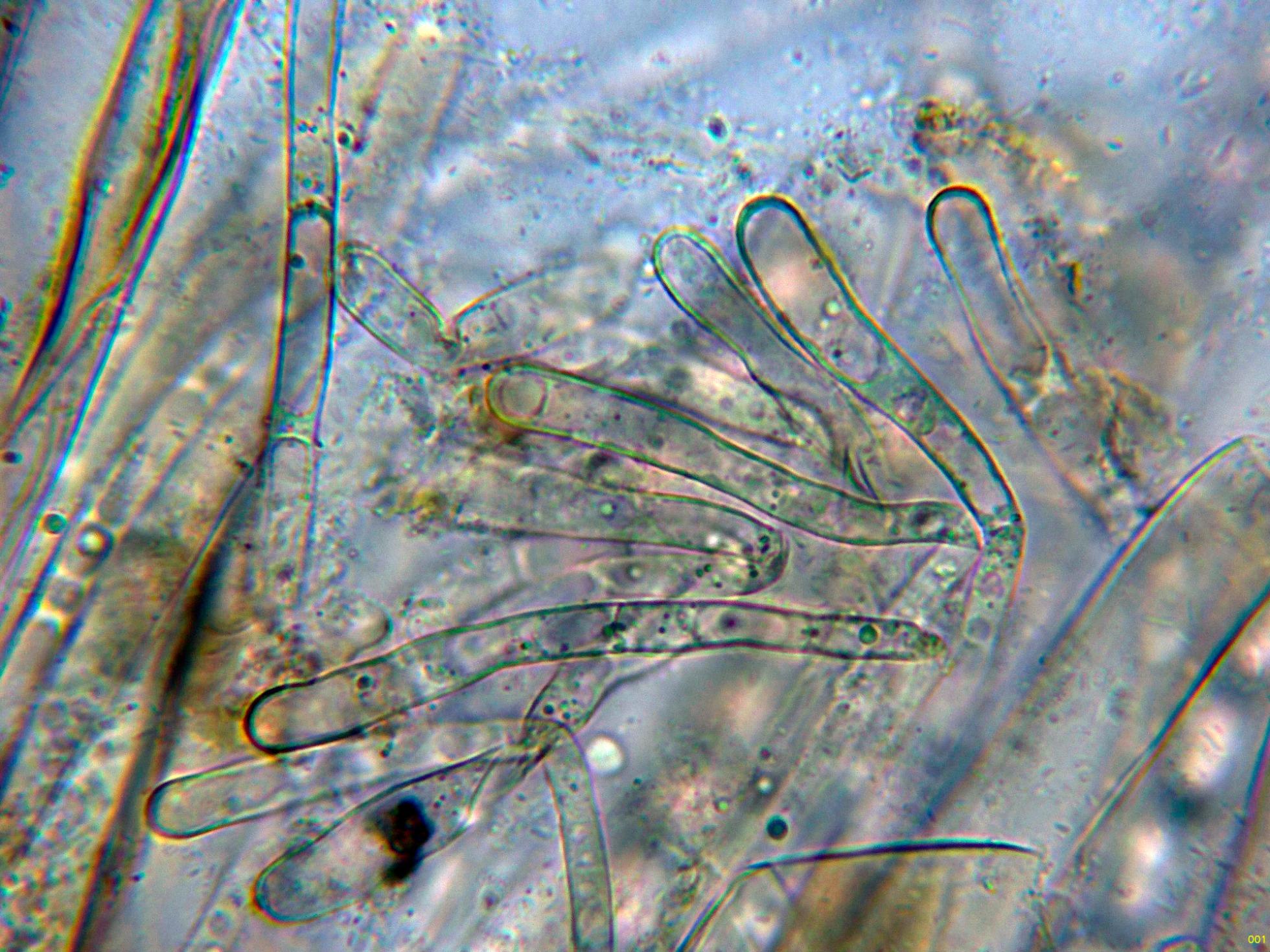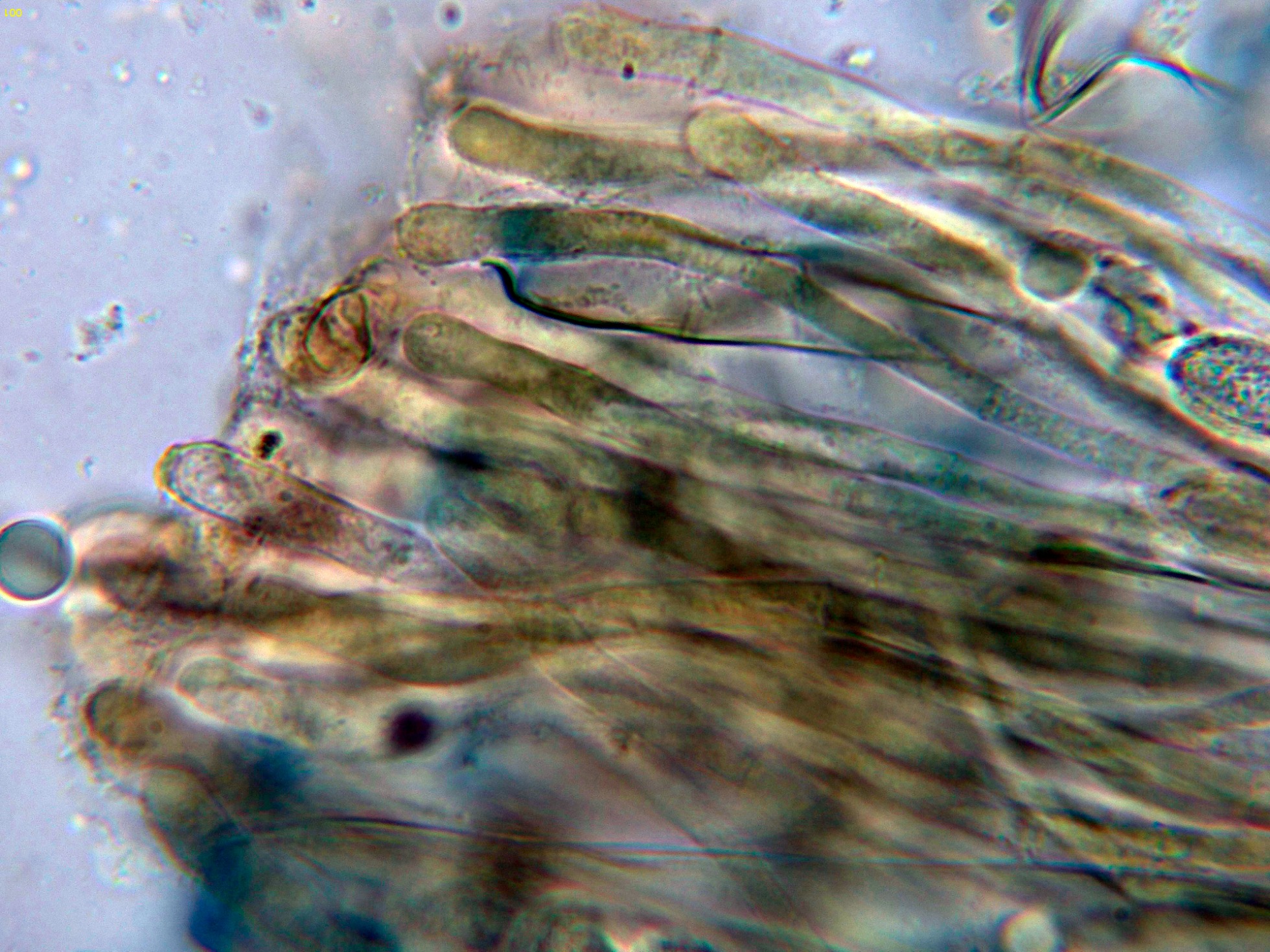 Ascos en Melzer a 400 aumentos, con reacción amiloide.