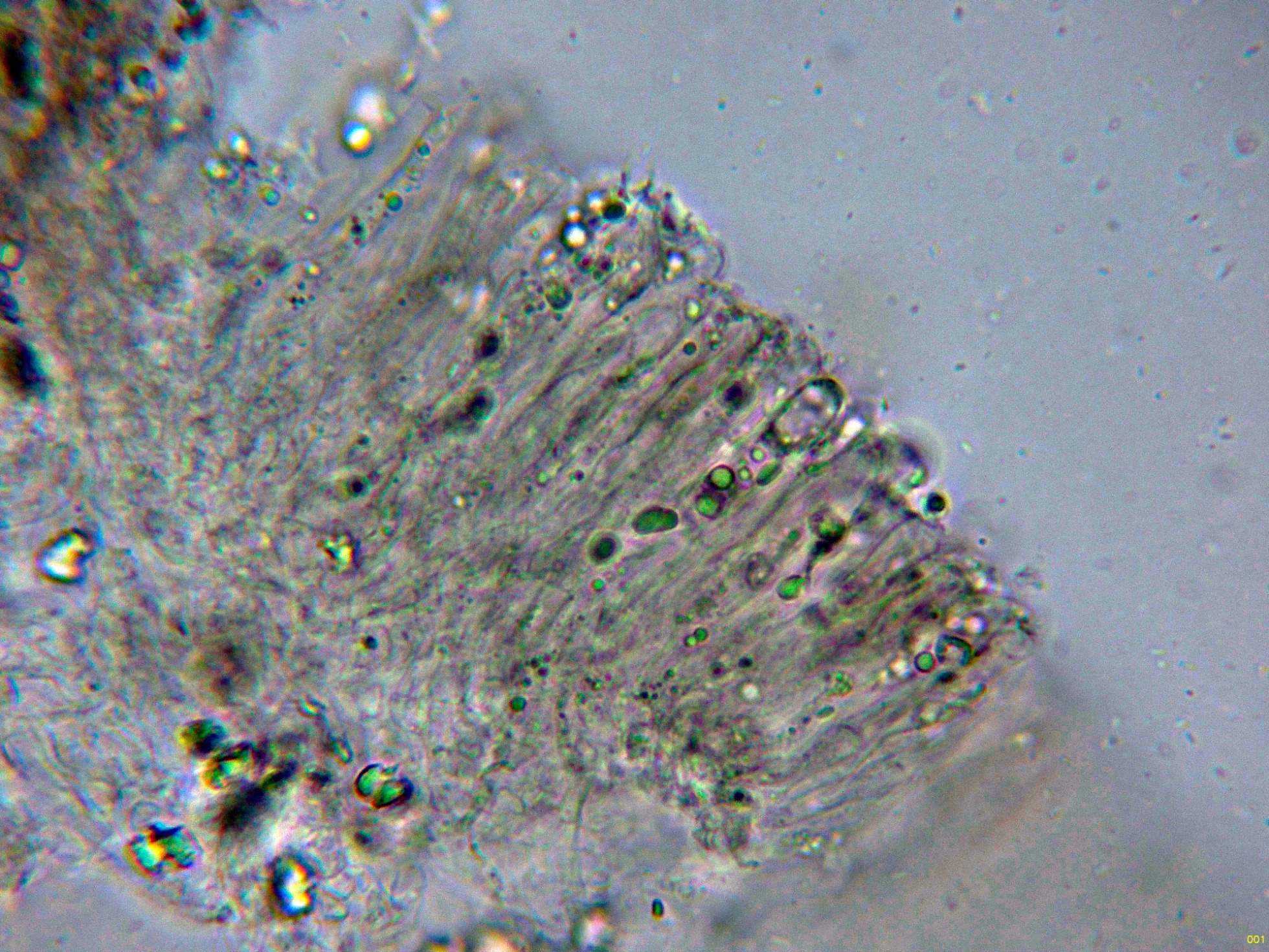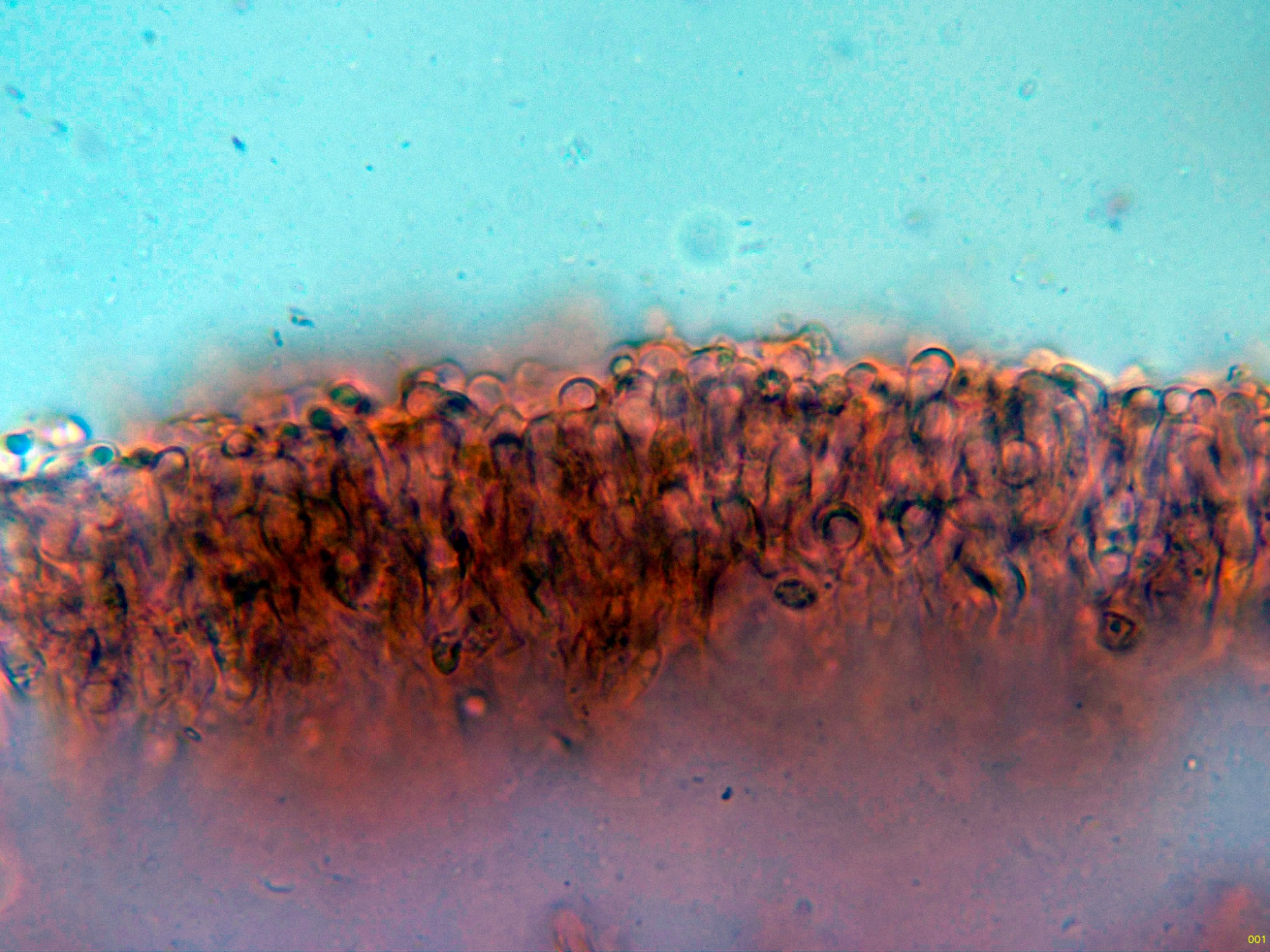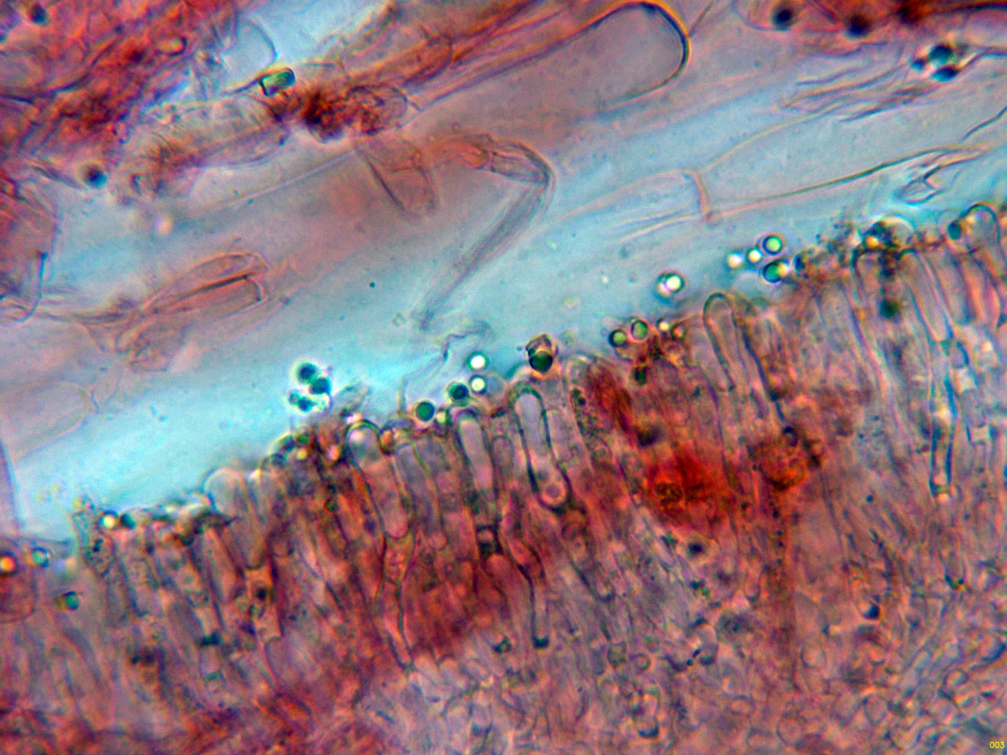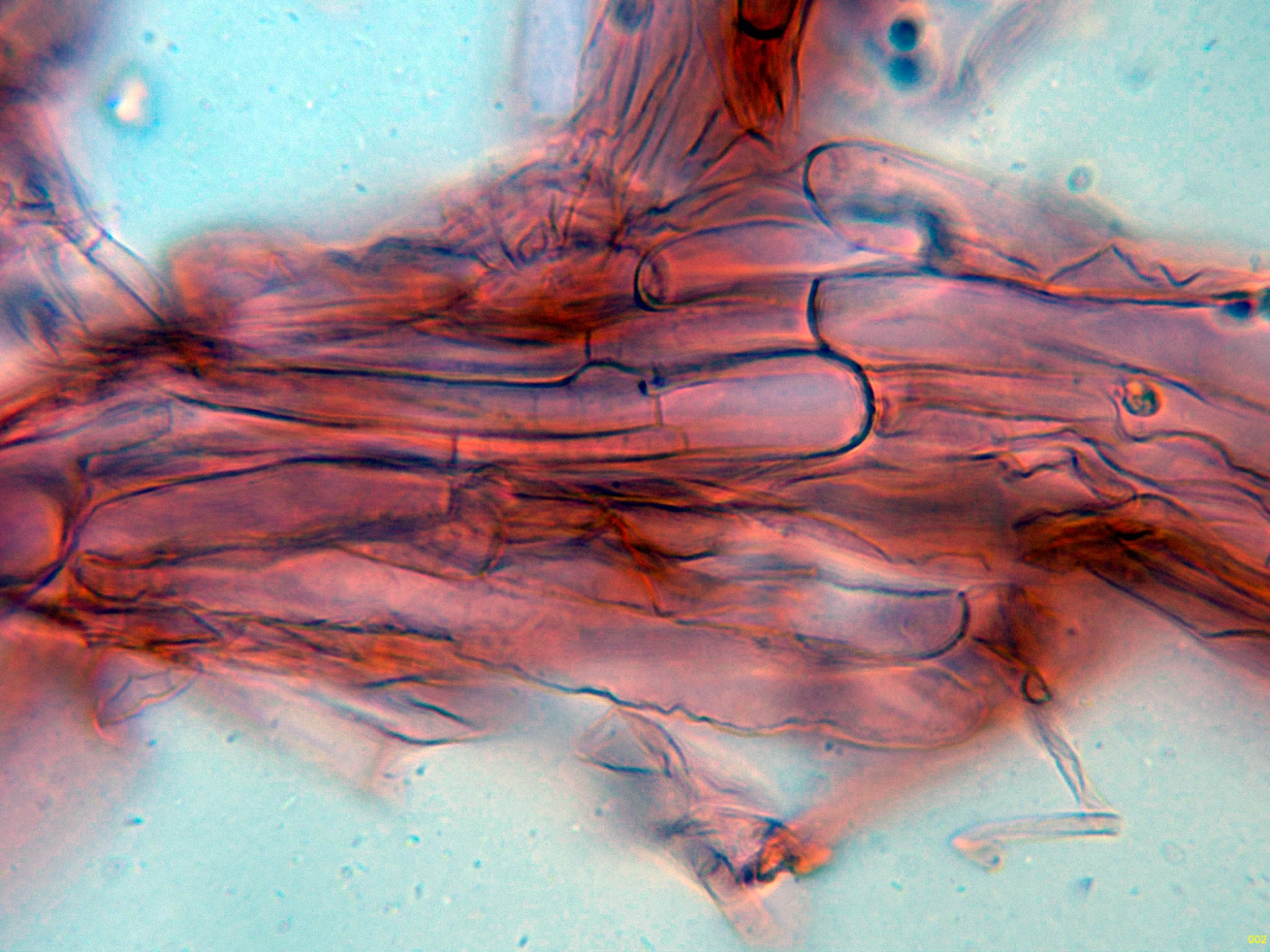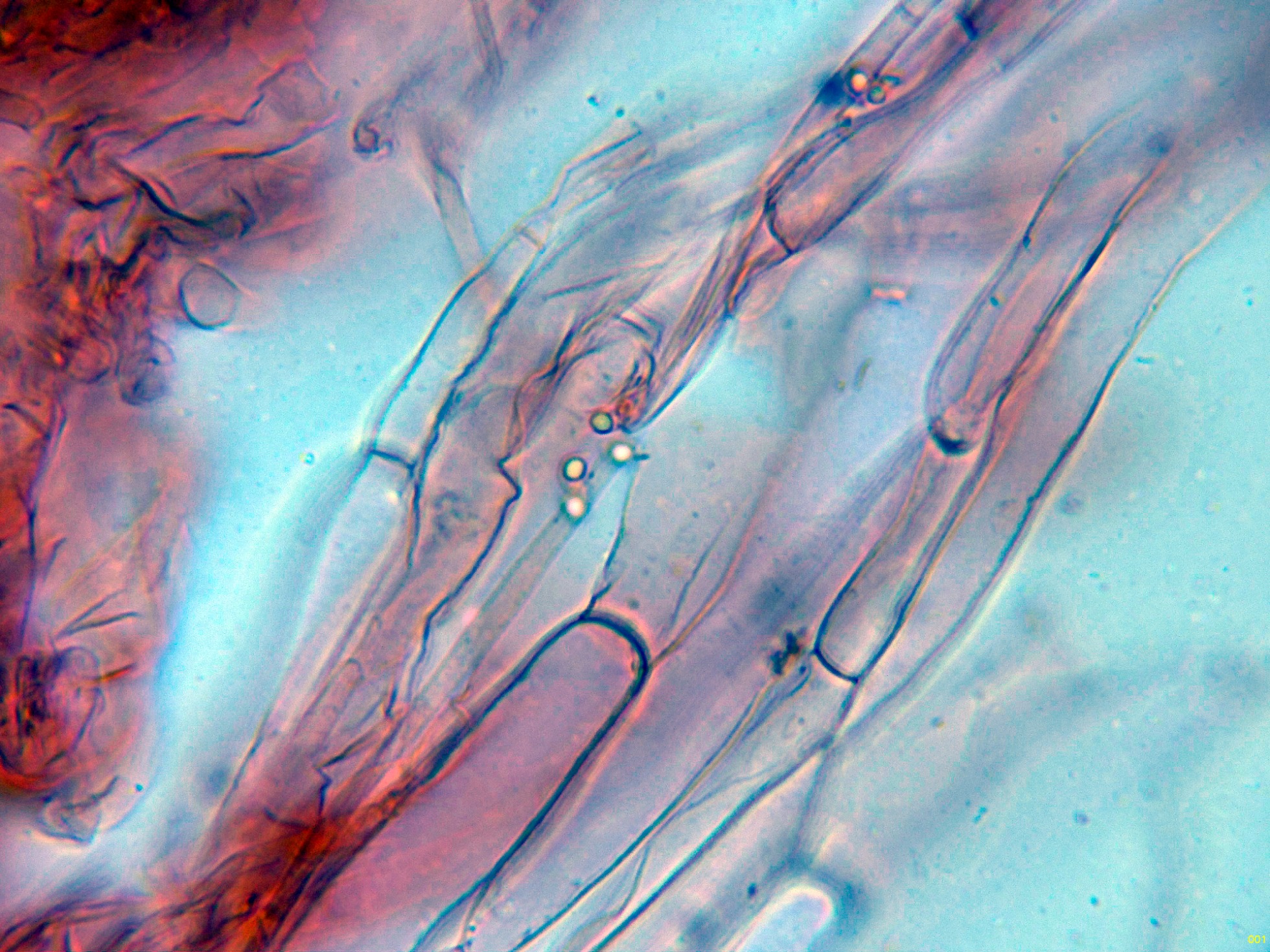 Hifas tramales en rojo Congo, con algunas fíbulas.