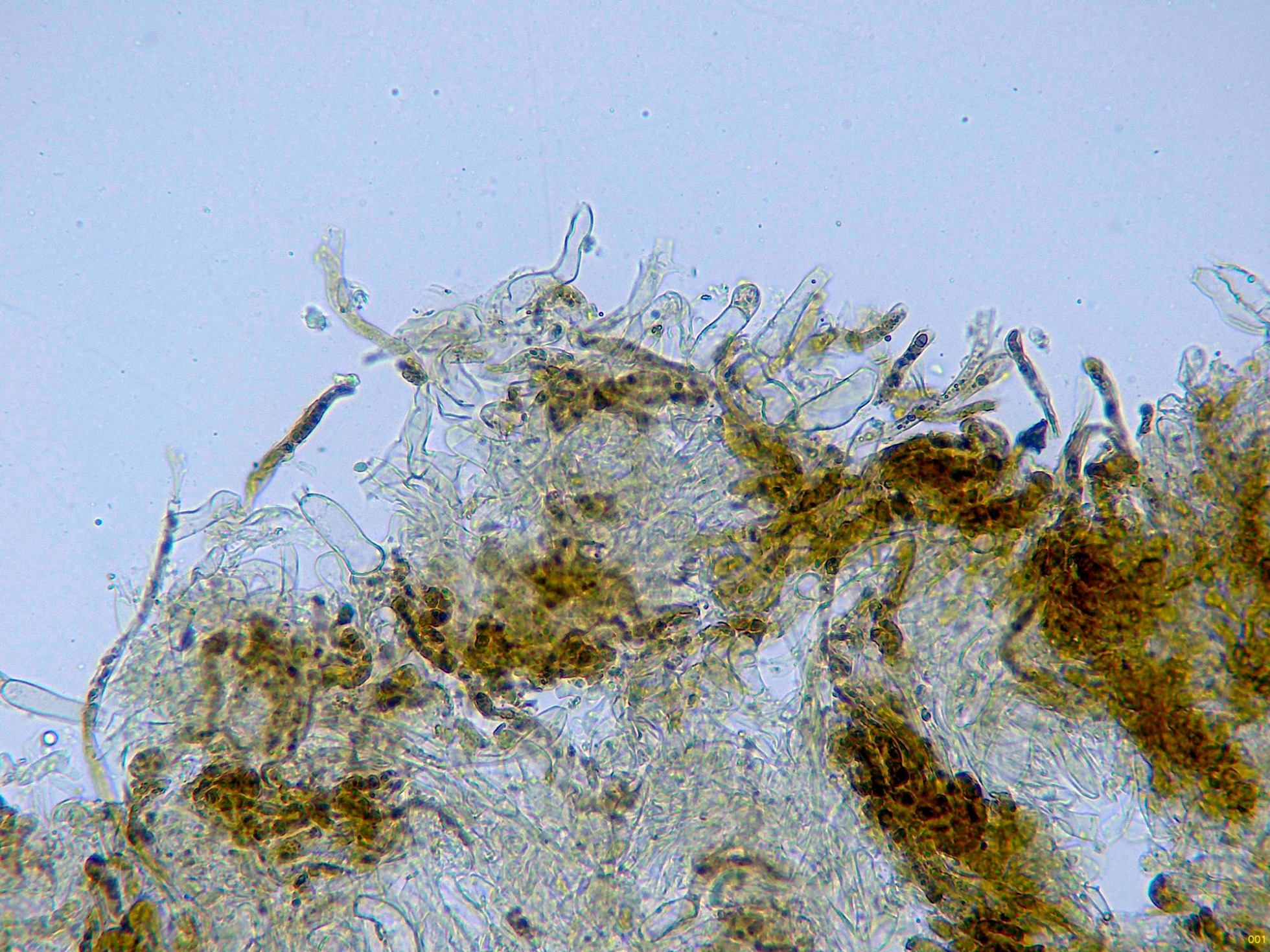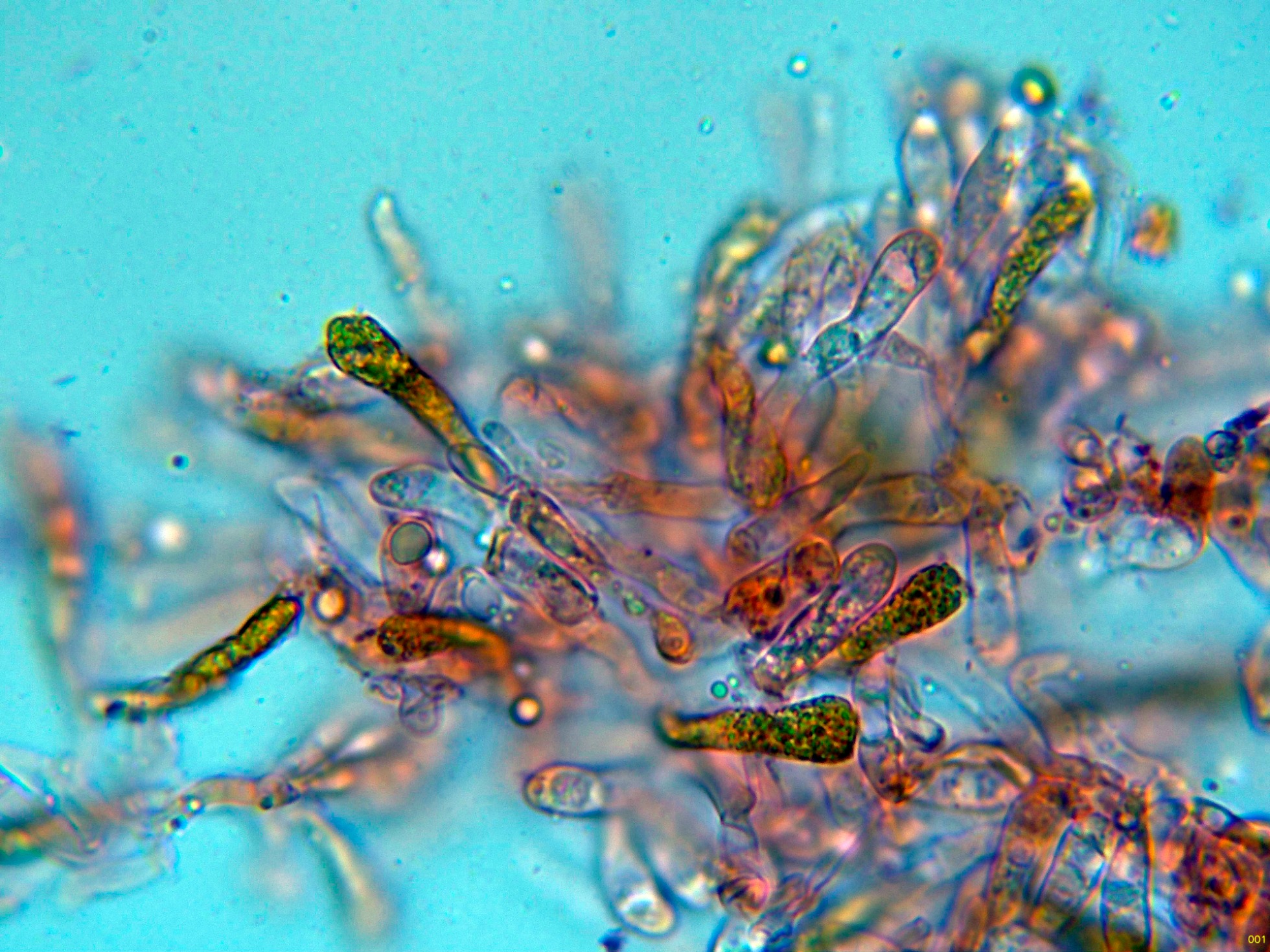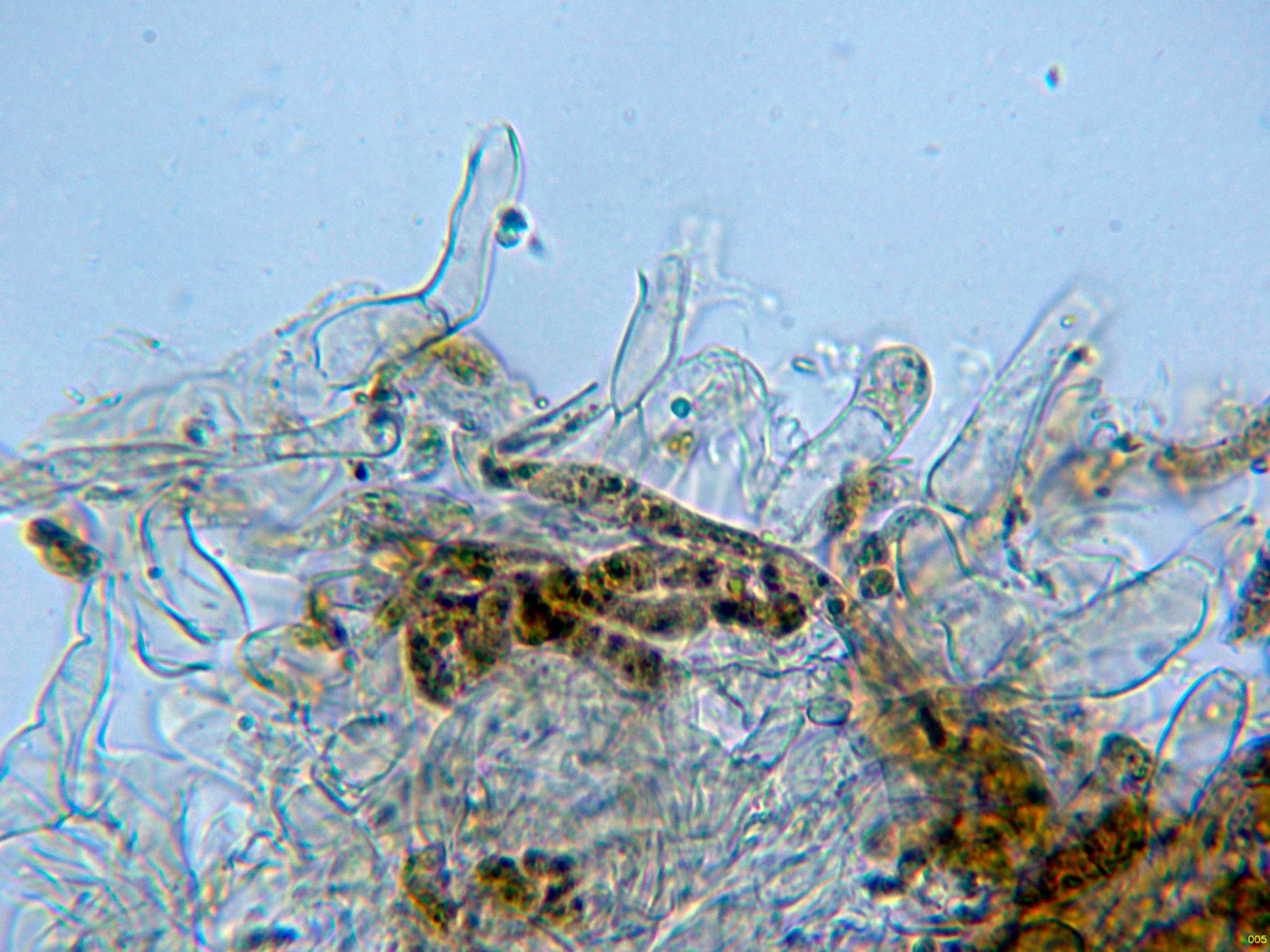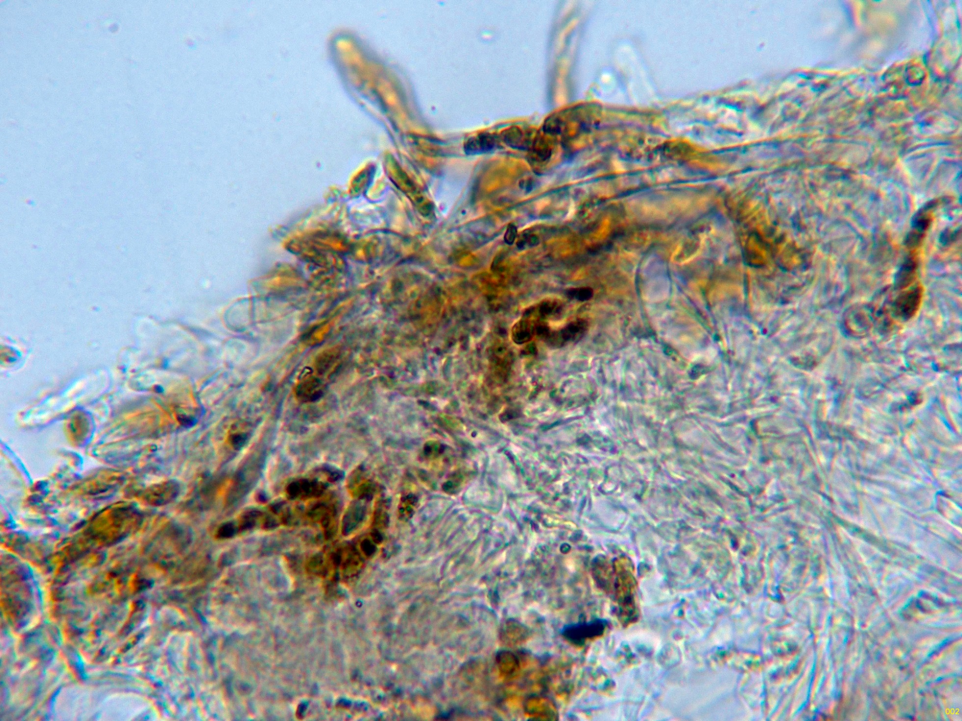 Hifas de la pileipellis filamentosas, fuertemente pigmentadas de color marrón, en las que no he podido observar fíbulas.