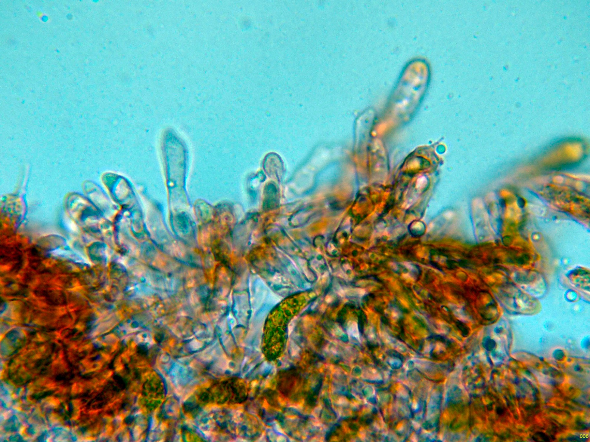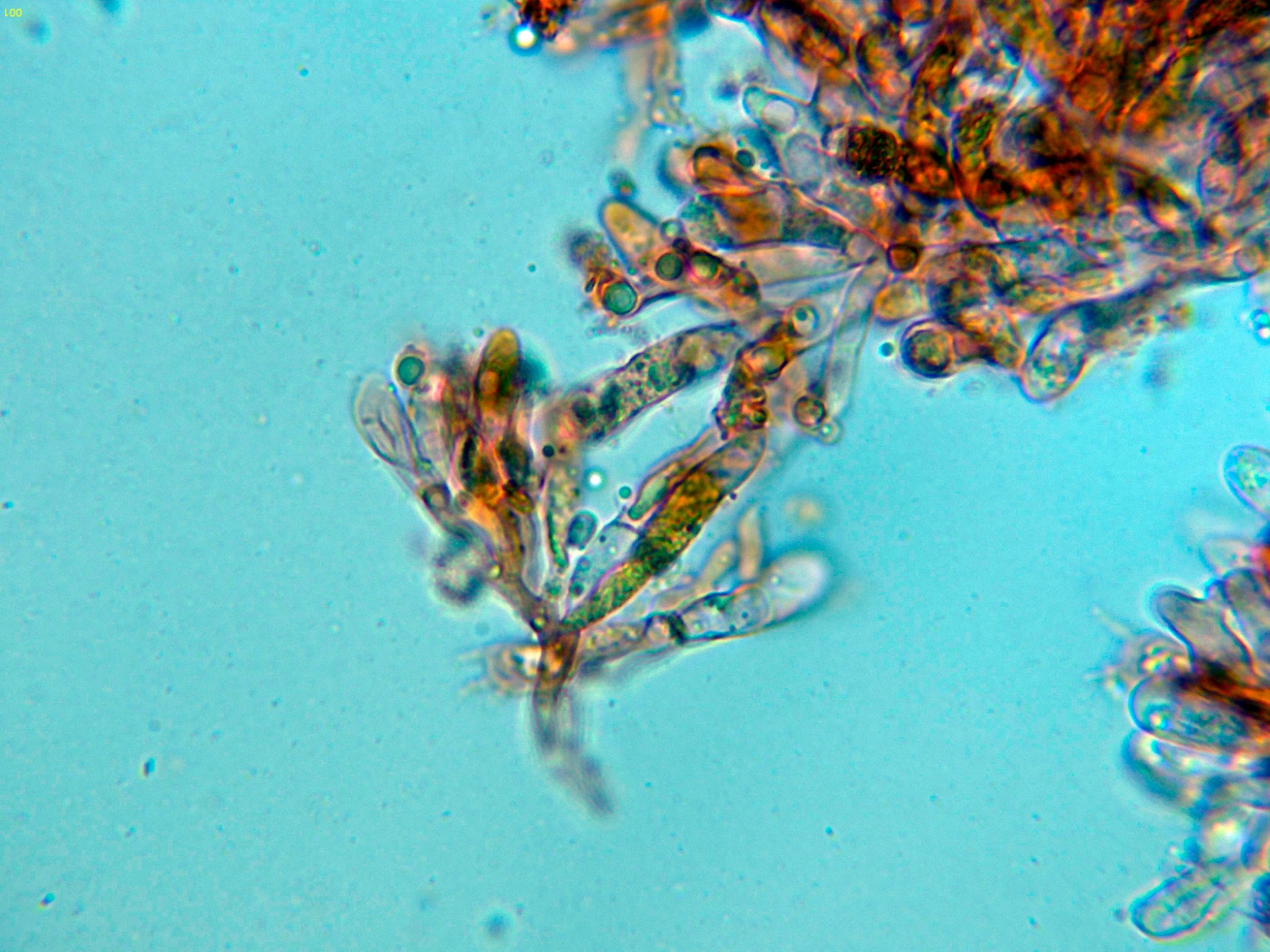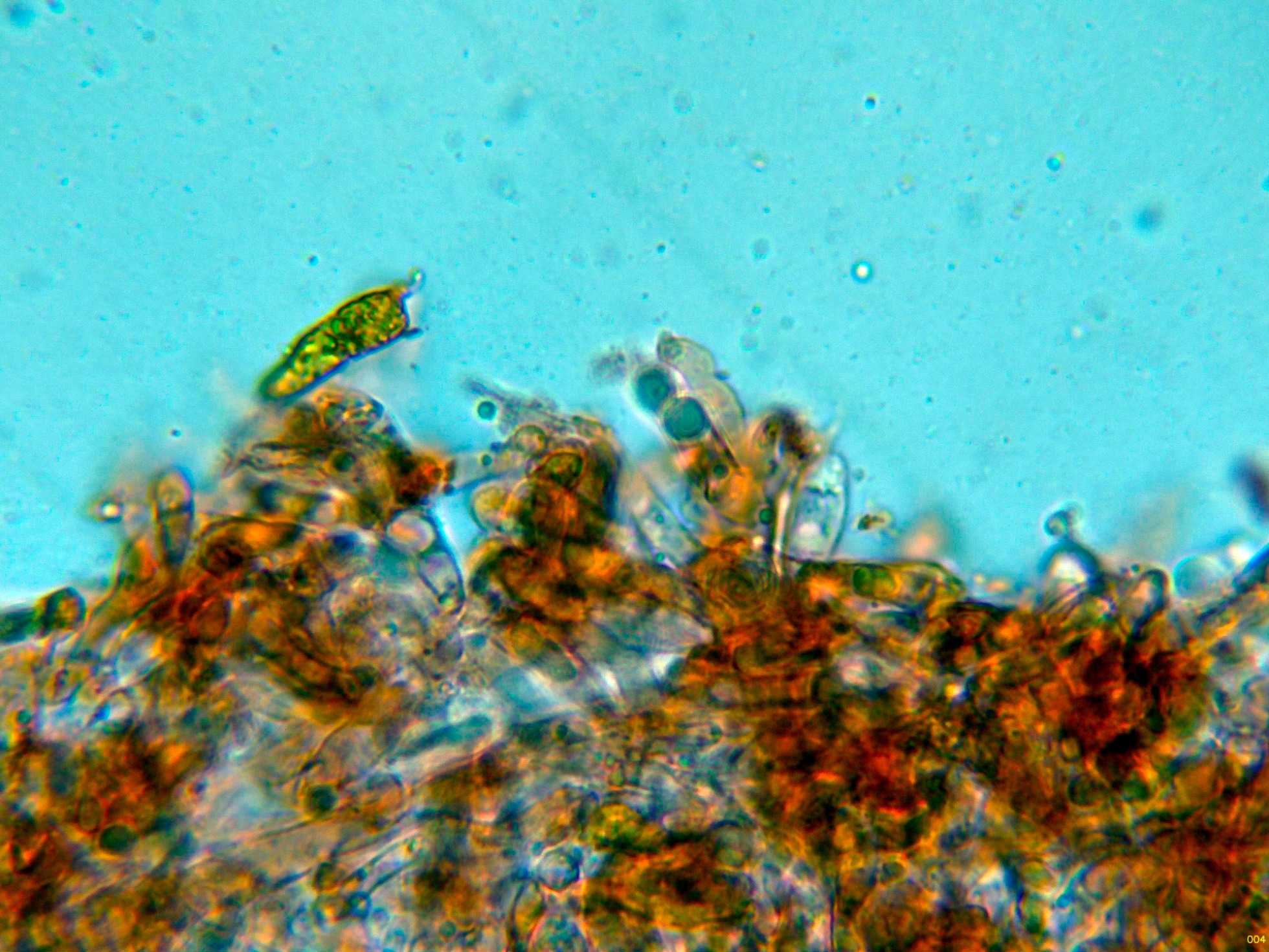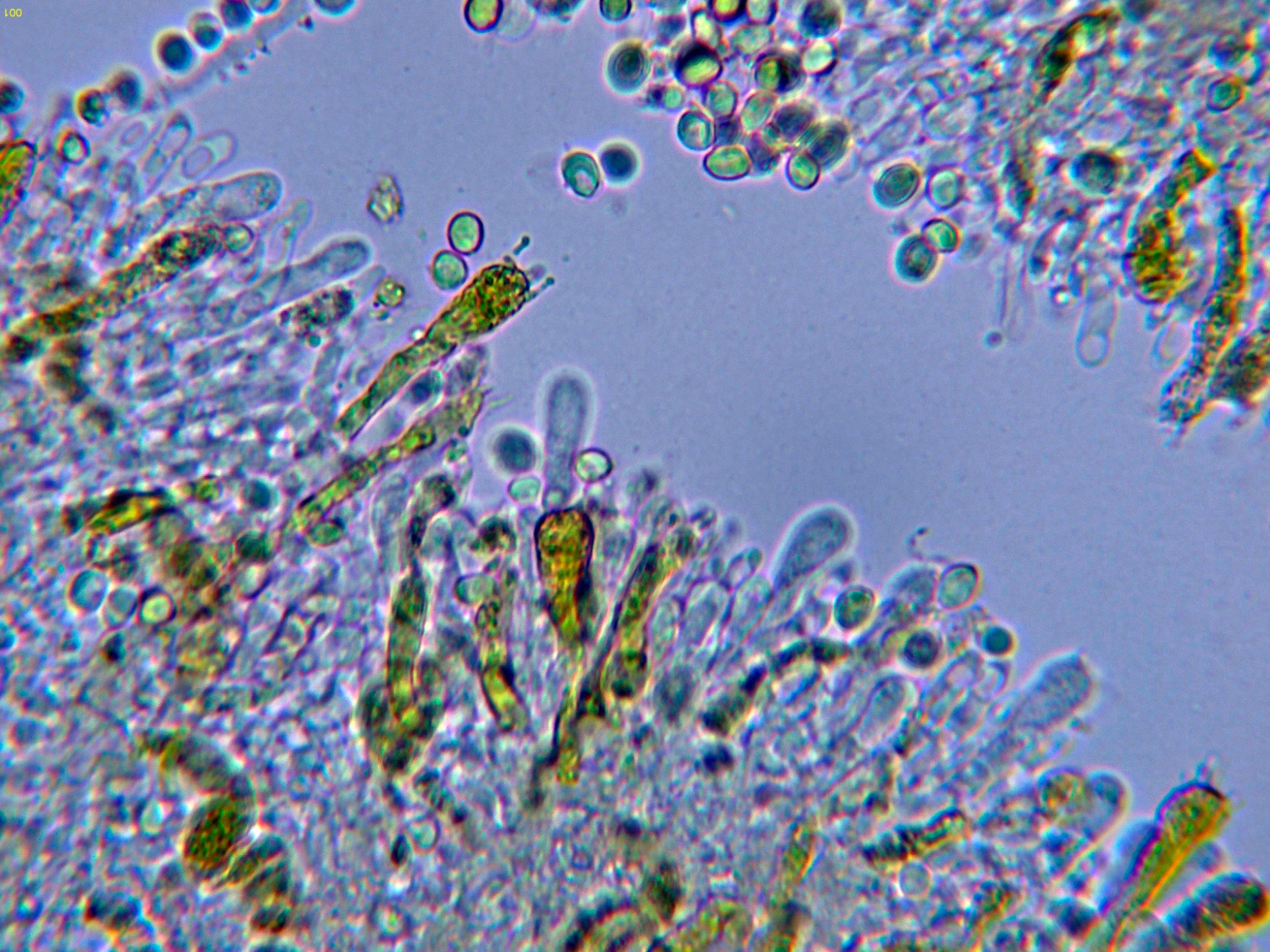 Arista laminar homomorfa, sin cistidios claramente diferenciados, pero con una buena cantidad de células terminales a modo de pelos cilíndricos, algo sinuosos, que se podrían corresponder a pequeños queilocistidios, observados además una gran cantidad de basidios con contenido intracelular amarillento a modo de crisocistidios, pero que por supuesto producen esporas, también observados otros basidios ya sin este contenido amarillento (solo con gránulos y gotas lípidas) que al igual que los otros producen esporas, todos los basidios observados tetraspóricos.