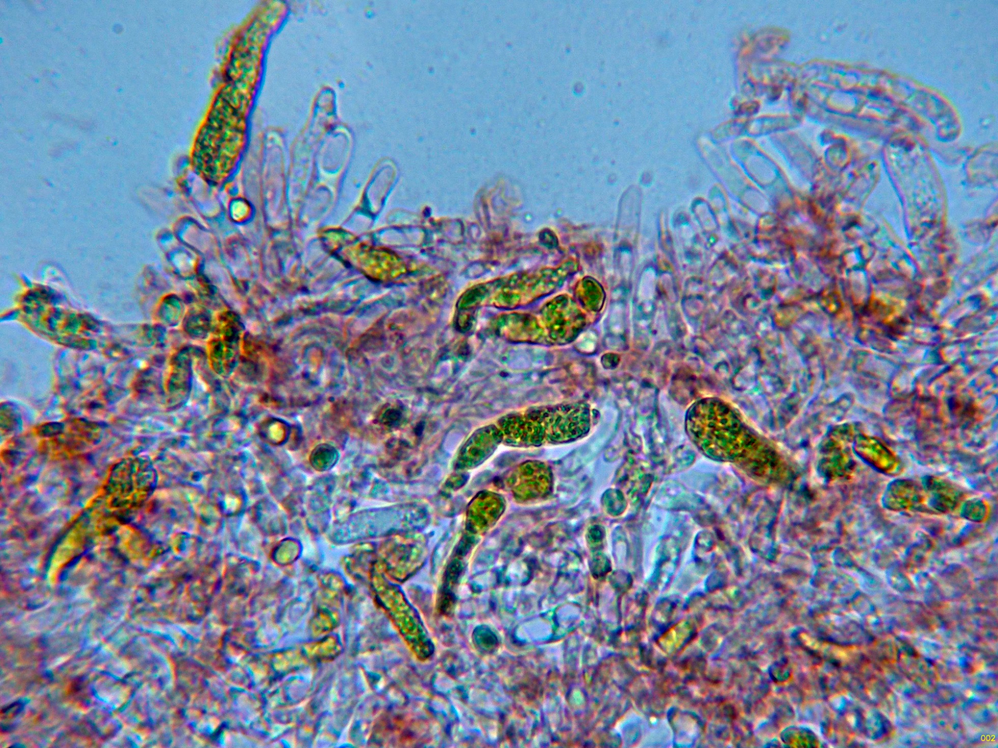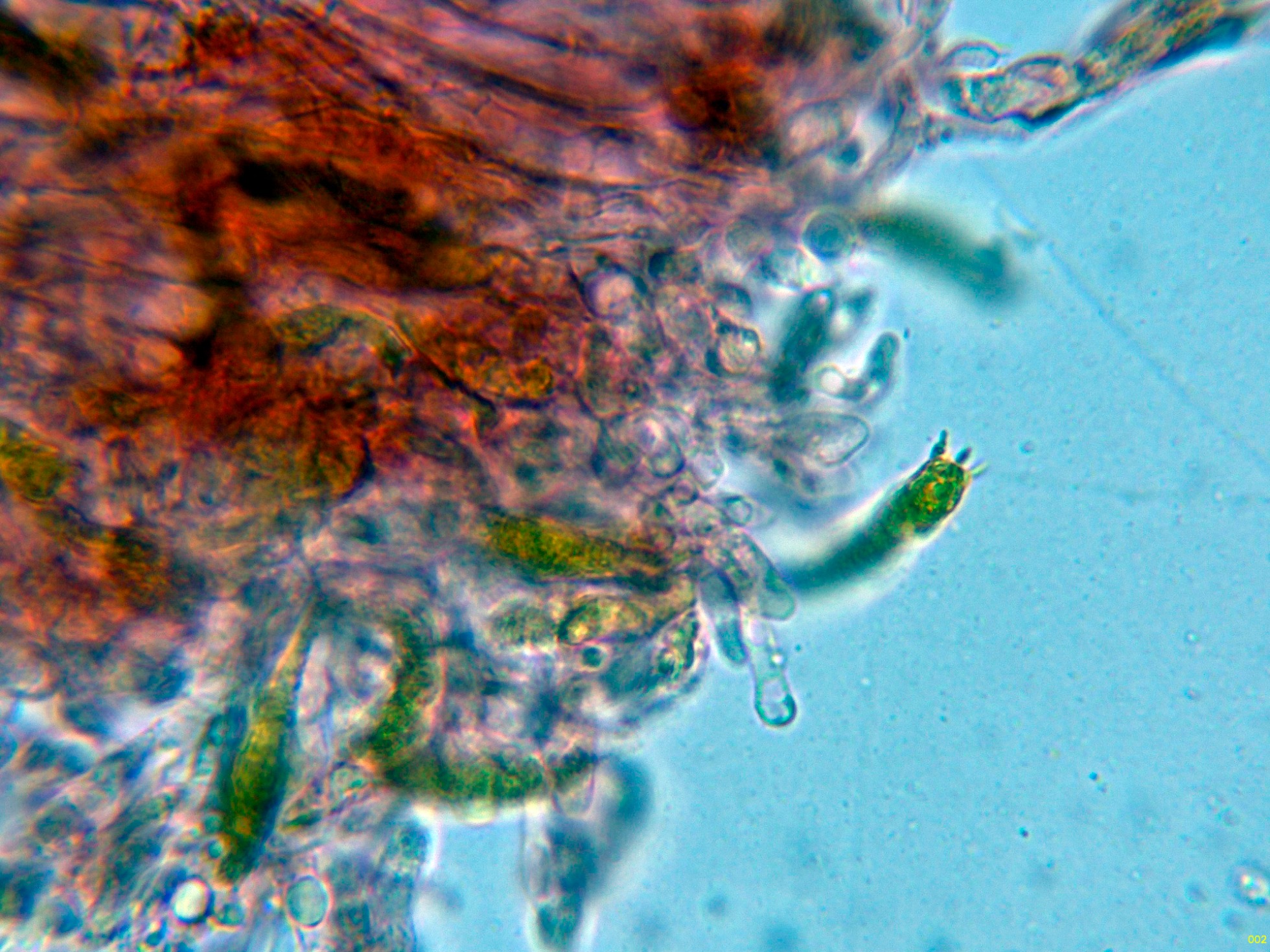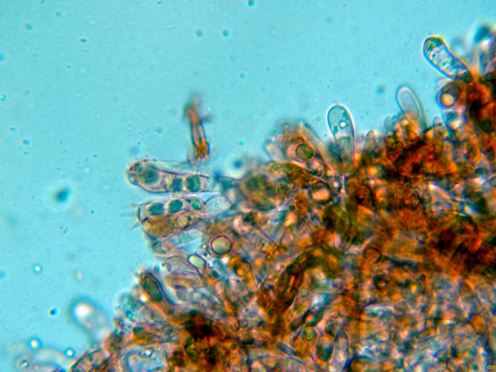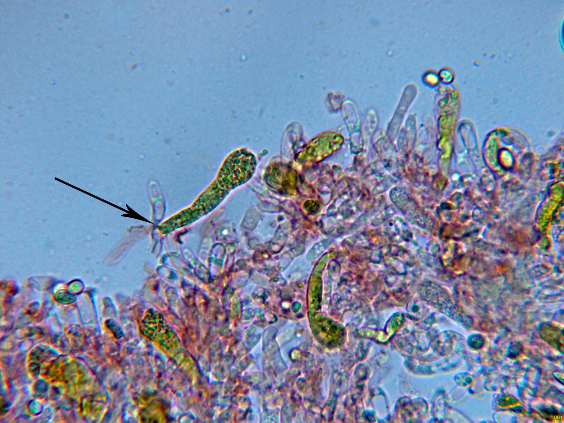 Arista laminar homomorfa, sin cistidios claramente diferenciados, pero con una buena cantidad de células terminales a modo de pelos cilíndricos, algo sinuosos, que se podrían corresponder a pequeños queilocistidios, observados además una gran cantidad de basidios con contenido intracelular amarillento a modo de crisocistidios, pero que por supuesto producen esporas, también observados otros basidios ya sin este contenido amarillento (solo con gránulos y gotas lípidas) que al igual que los otros producen esporas, todos los basidios observados tetraspóricos.