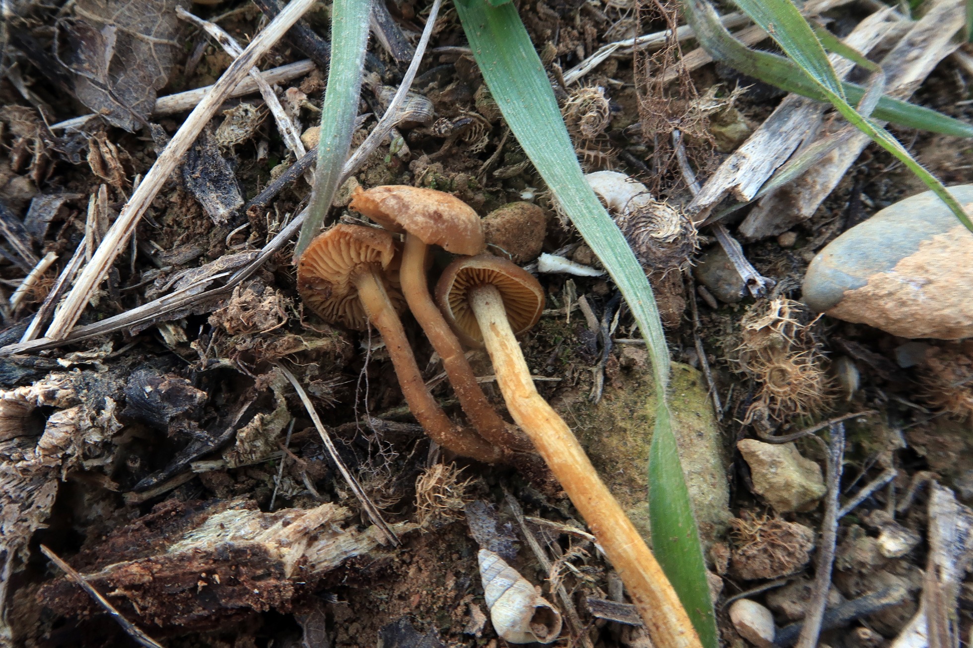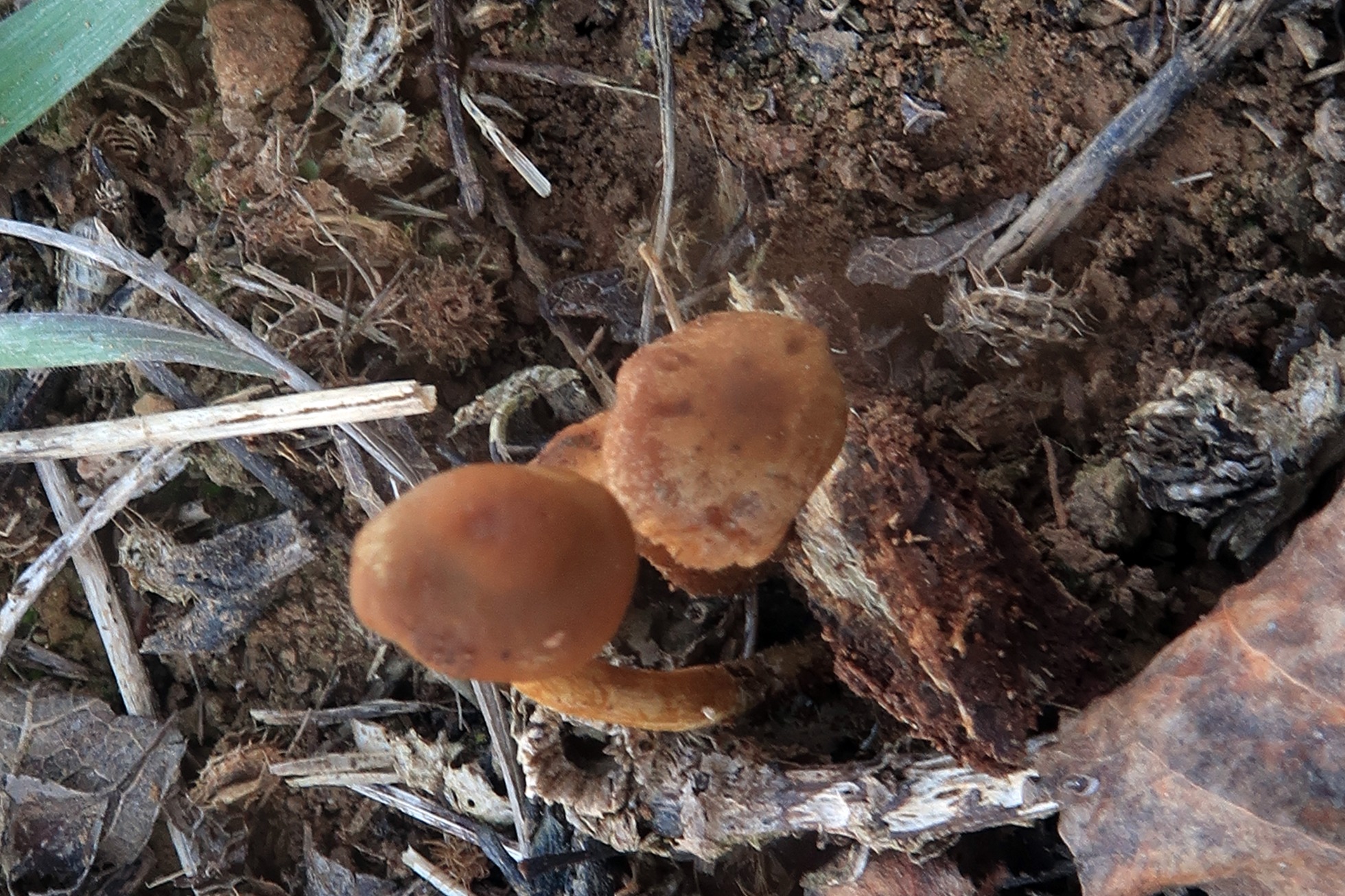 Sombrero de poco más de 1 cm. el mayor, convexo, de color marrón, más o menos uniforme, liso, con un ligero abultamiento en el centro pero sin un umbón claramente diferenciado.