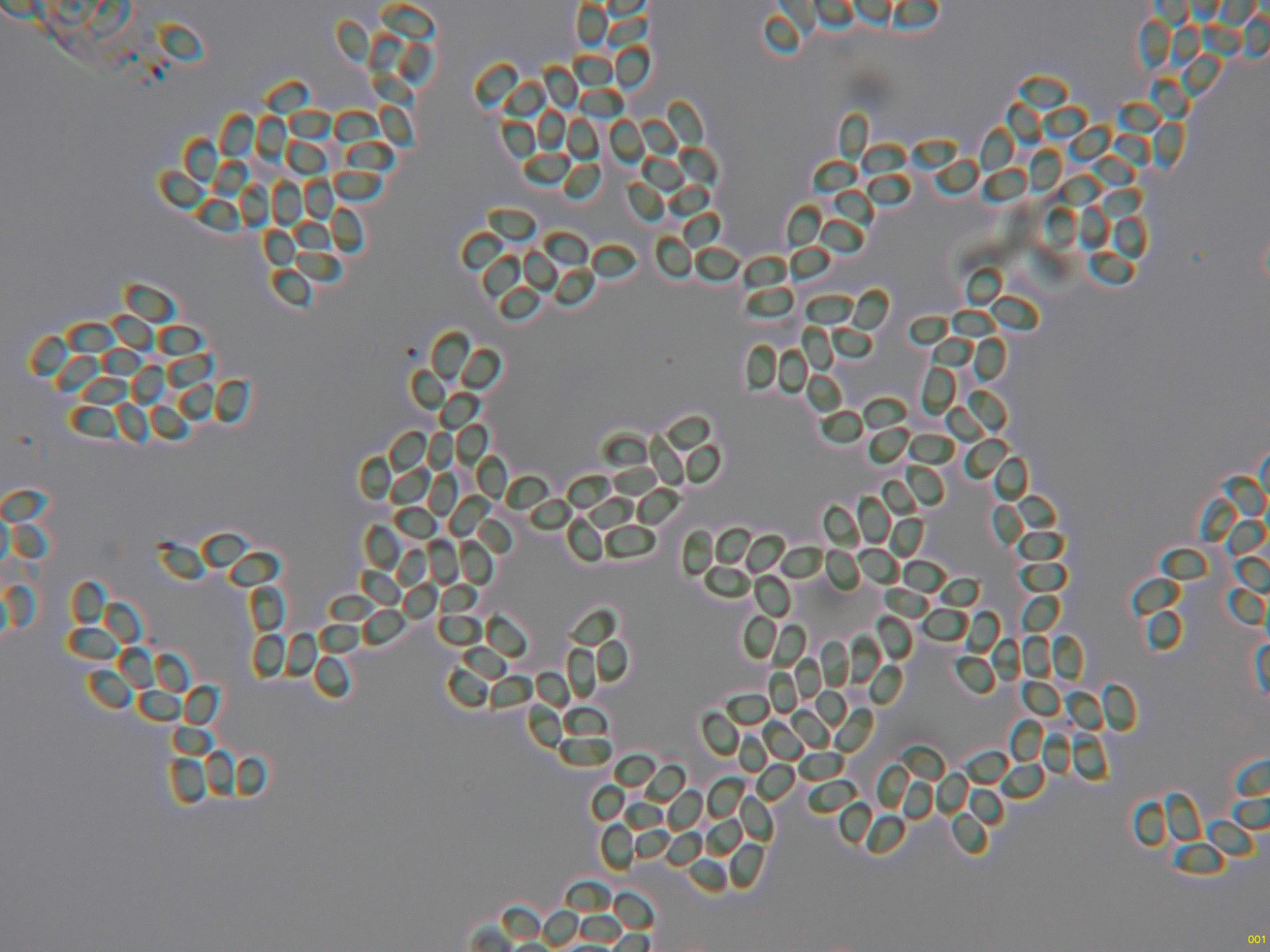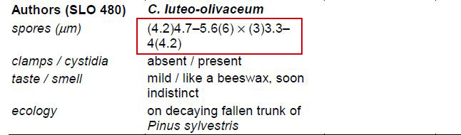 Contrastado asimismo con el documento de Micocharentes, en el que indican unas medidas esporales para la Callistosporium luteo-olivaceum de 4,5-7 x 3,5-4,5 μm.