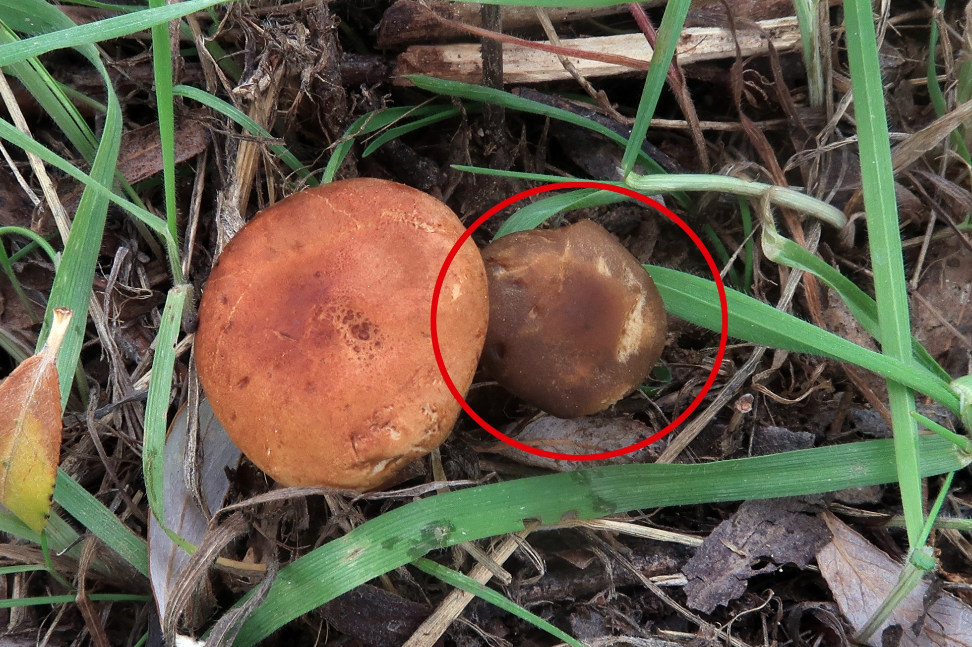 En la siguiente imágen solo el ejemplar pequeño pertenece a la especie aquí descrita, el ejemplar de mayor tamaño se corresponde a un ejemplar joven de probablemente un Gymnopus aún por determinar.