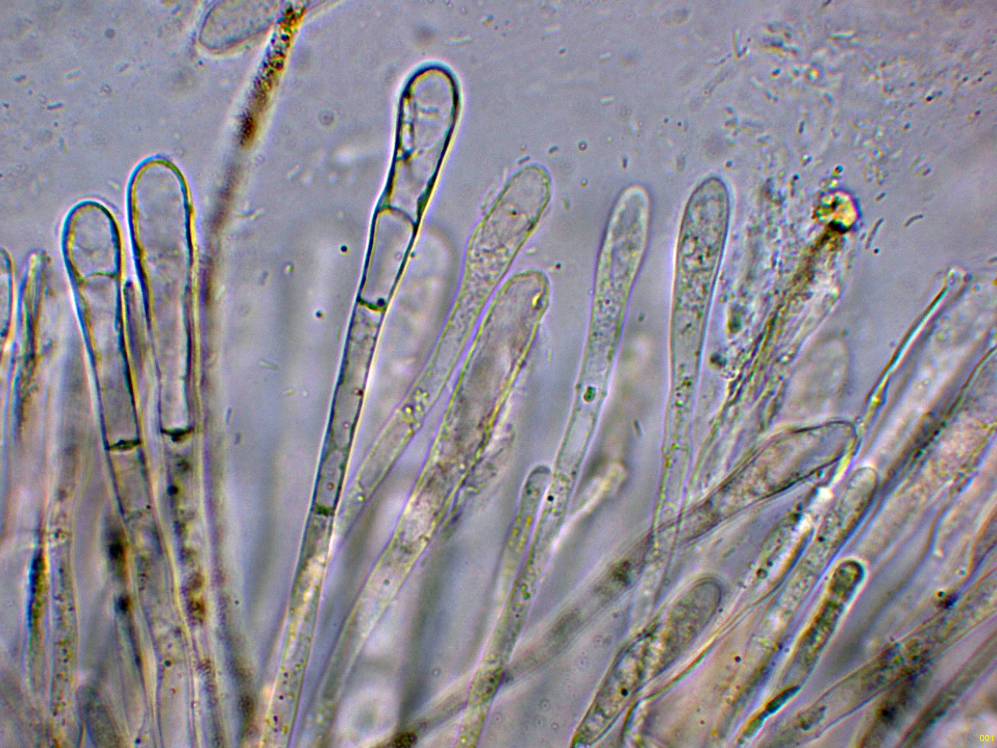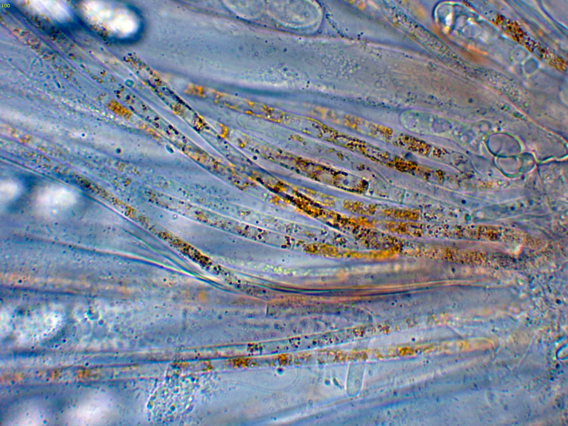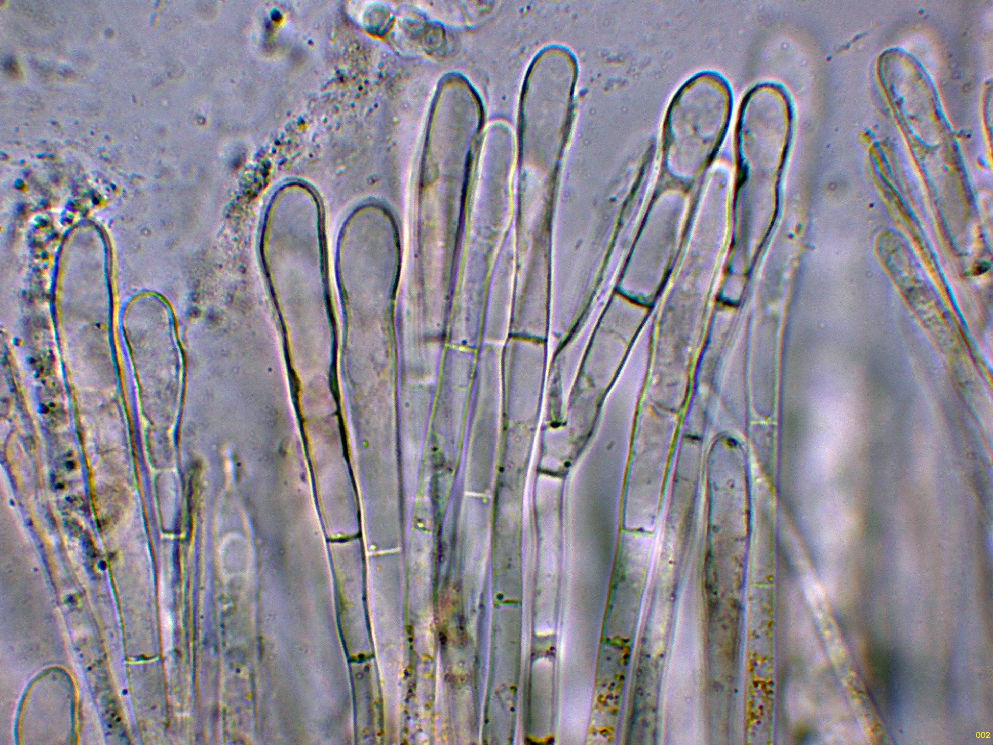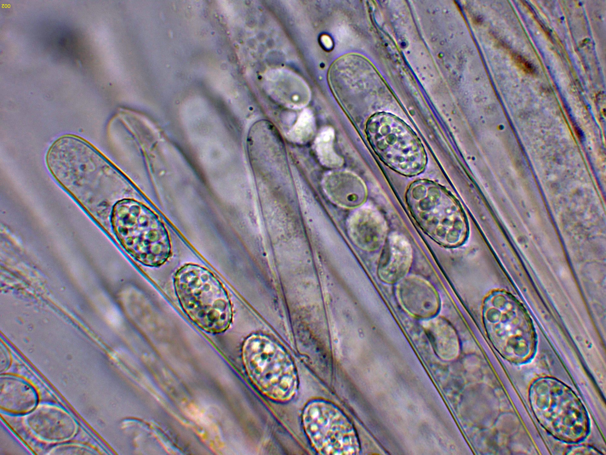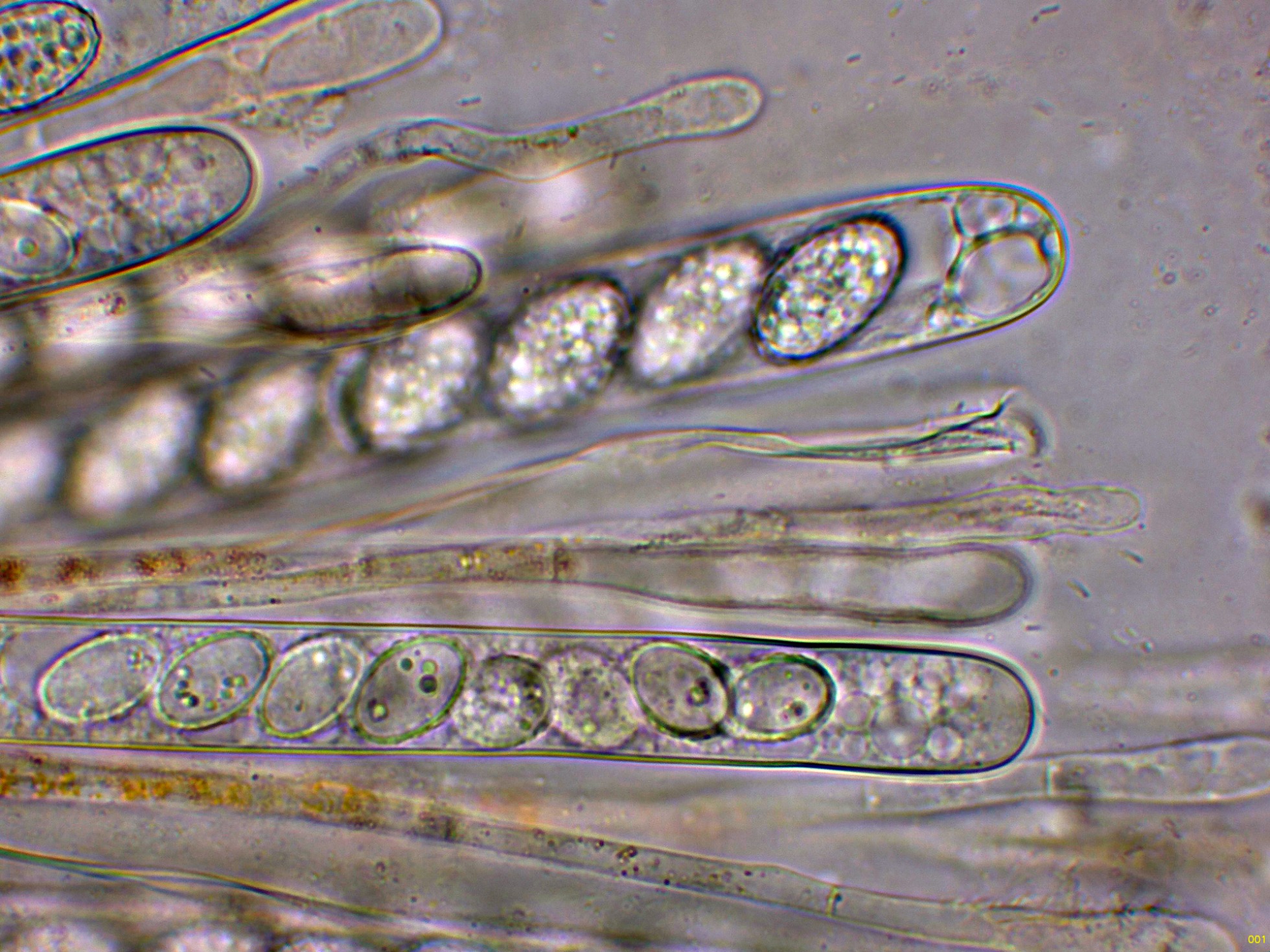 Paráfisis cilíndricas, septadas y ensanchadas en el ápice.