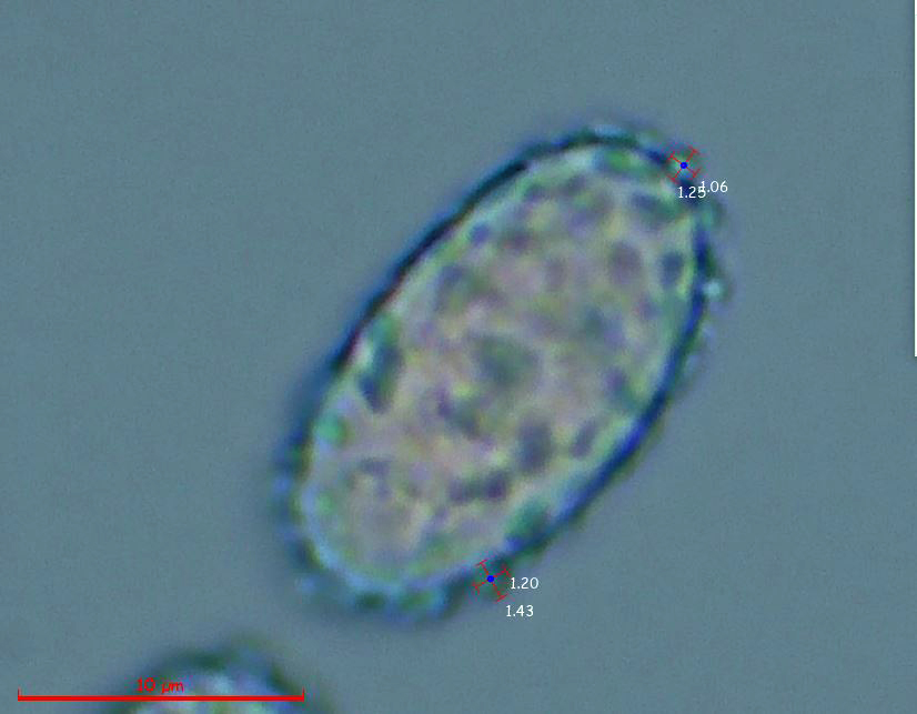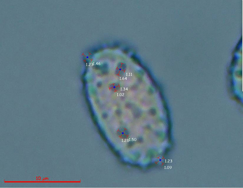 Como dato importante a nivel taxonómico, son las medidas de las verrugas que componen su ornamentación, un par de imágenes ampliadas con las medidas de estas verrugas.