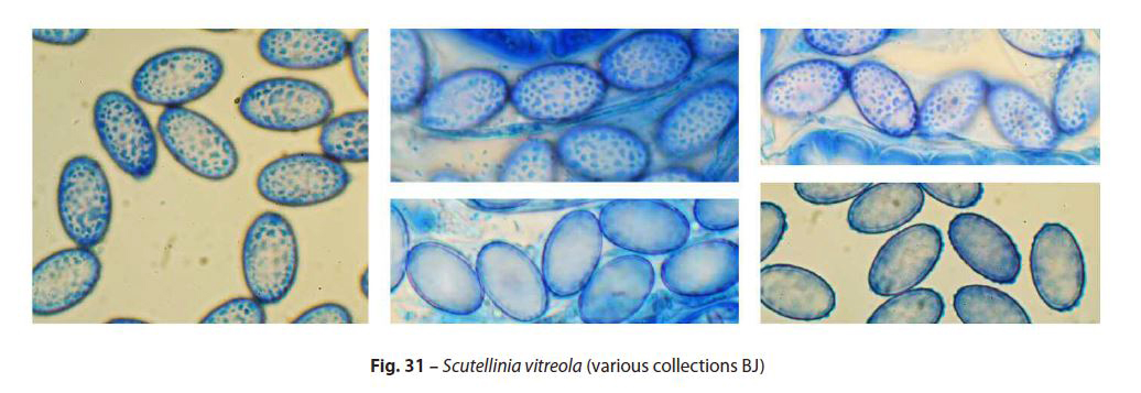 Determinación hecha siguiendo el criterio de las Claves de Ascomycete.org, que con esporas elipsoides, con un cociente Q superior a 1,2, pelos por debajo de 1,2 mm., cociente Q por encima de 1,4 y esporas con unas medidas de 15–20 × 9–12 μm, conducen a la Scutellinia vitreola propuesta.