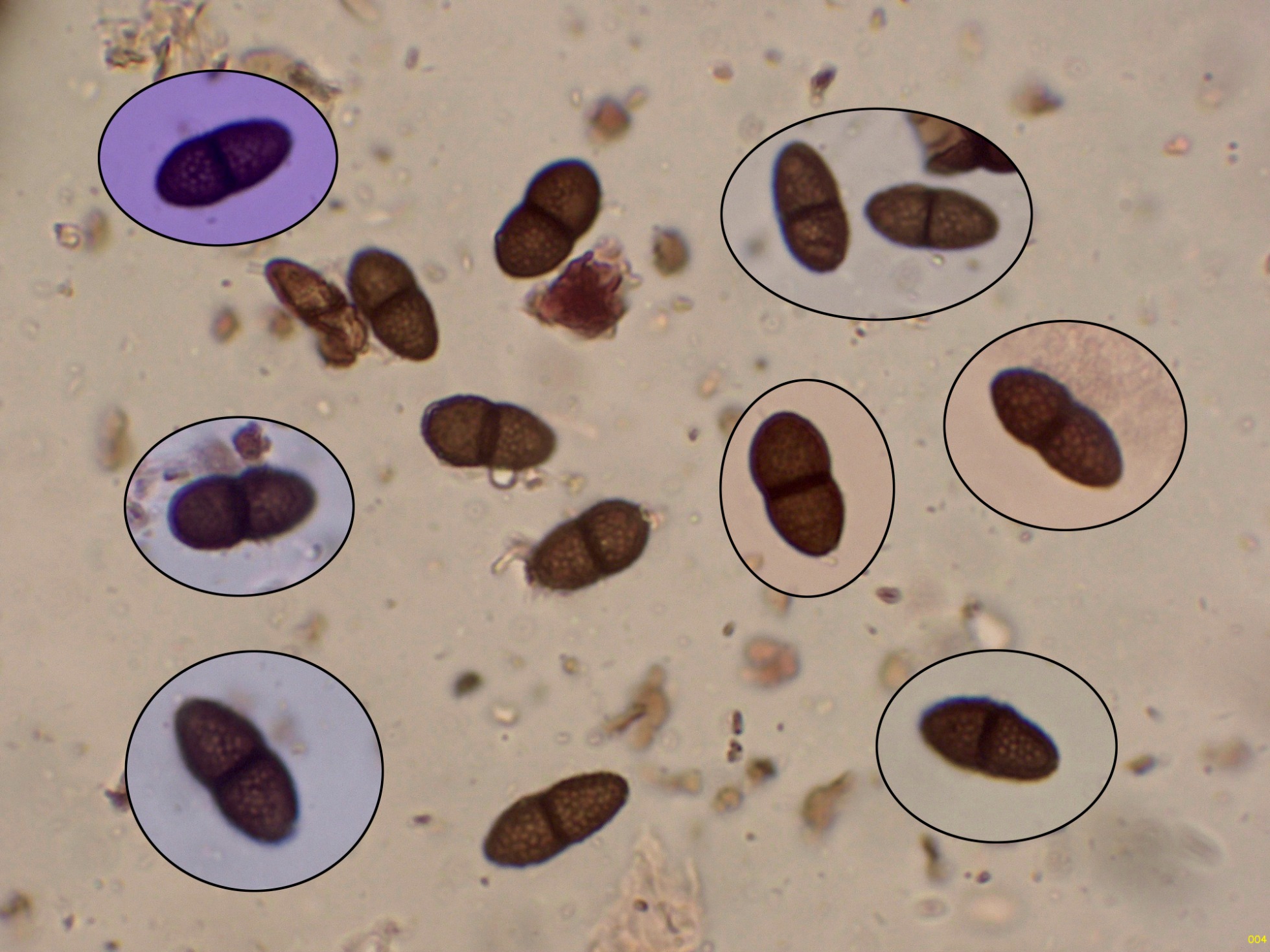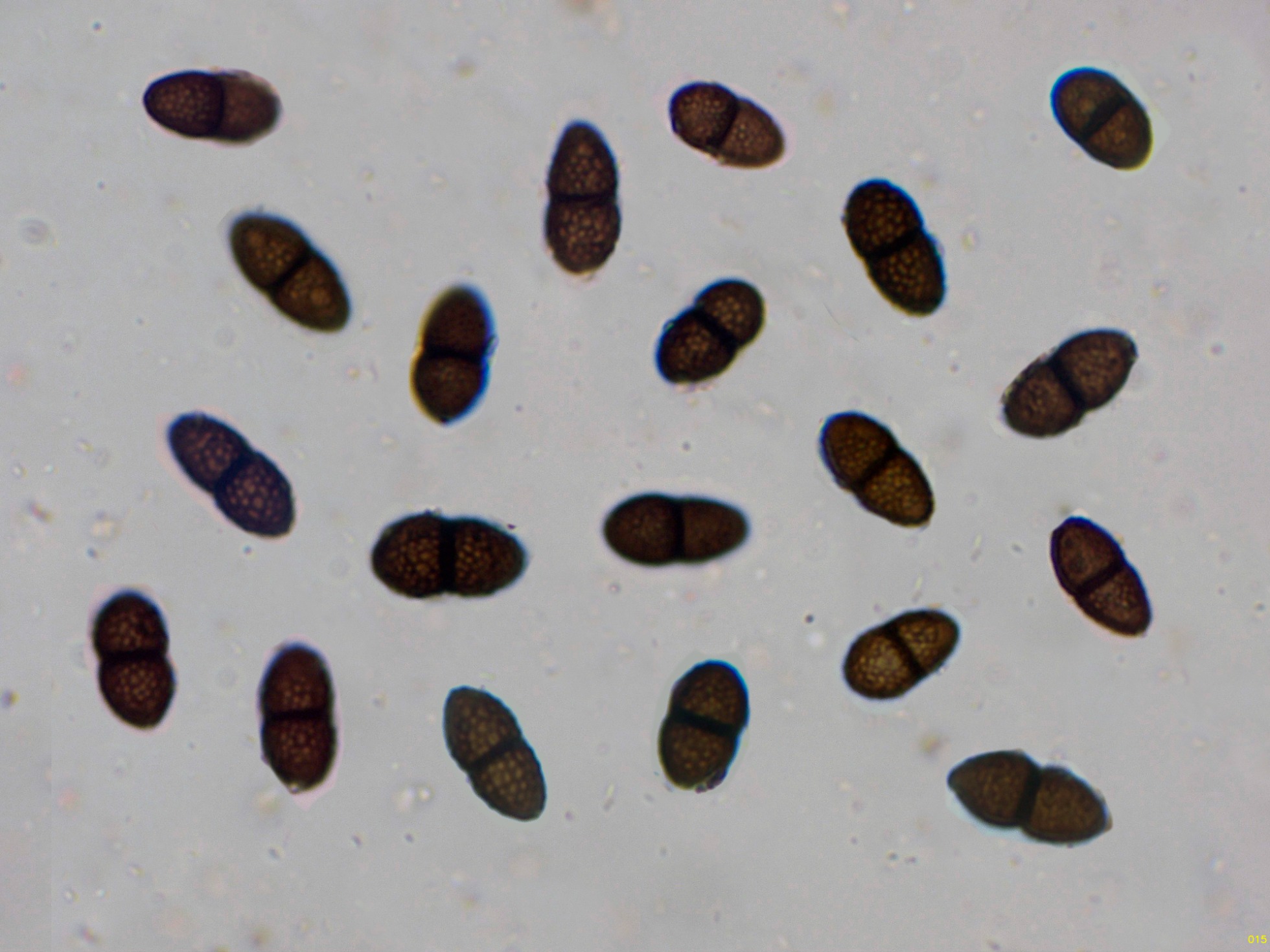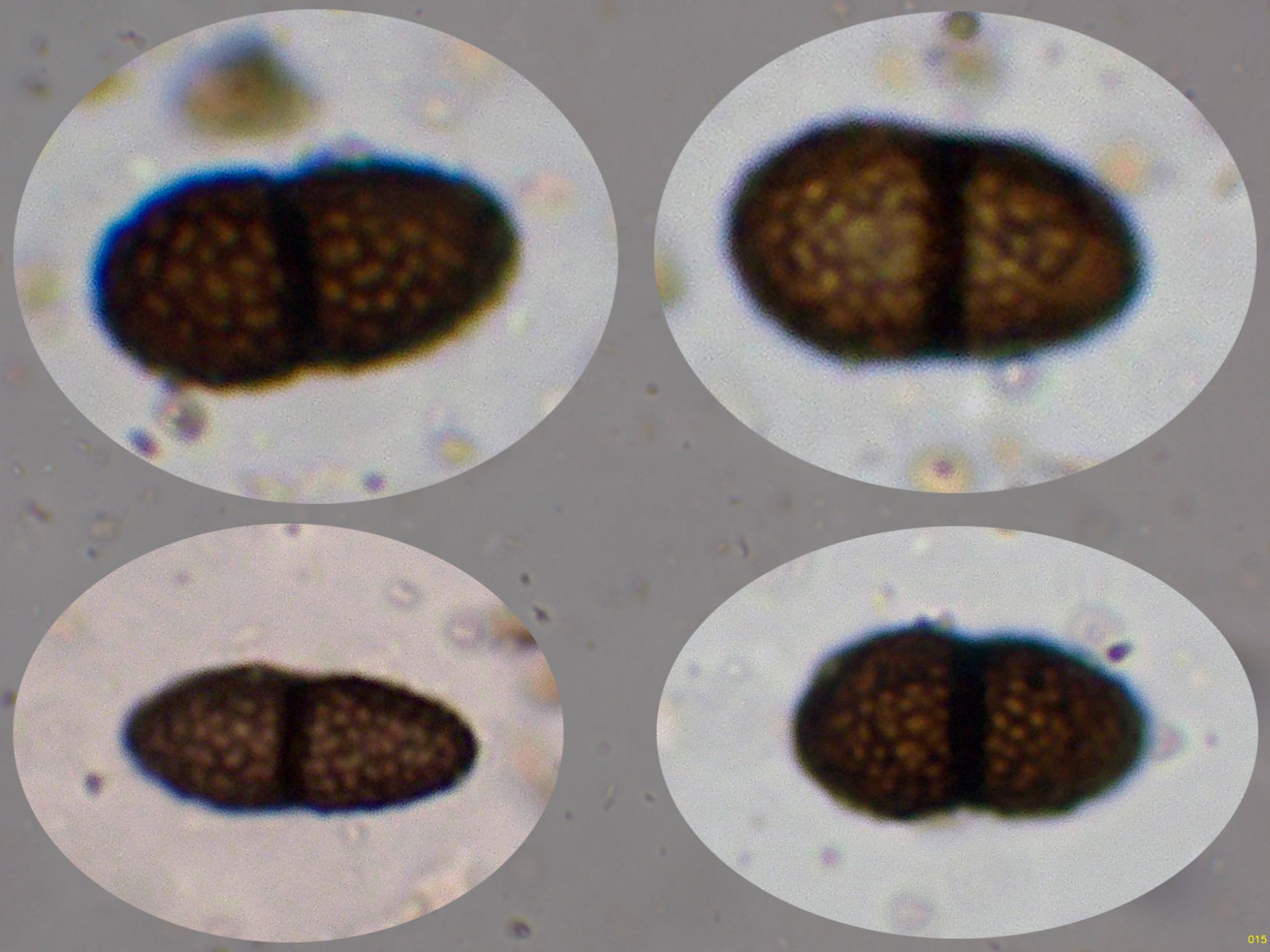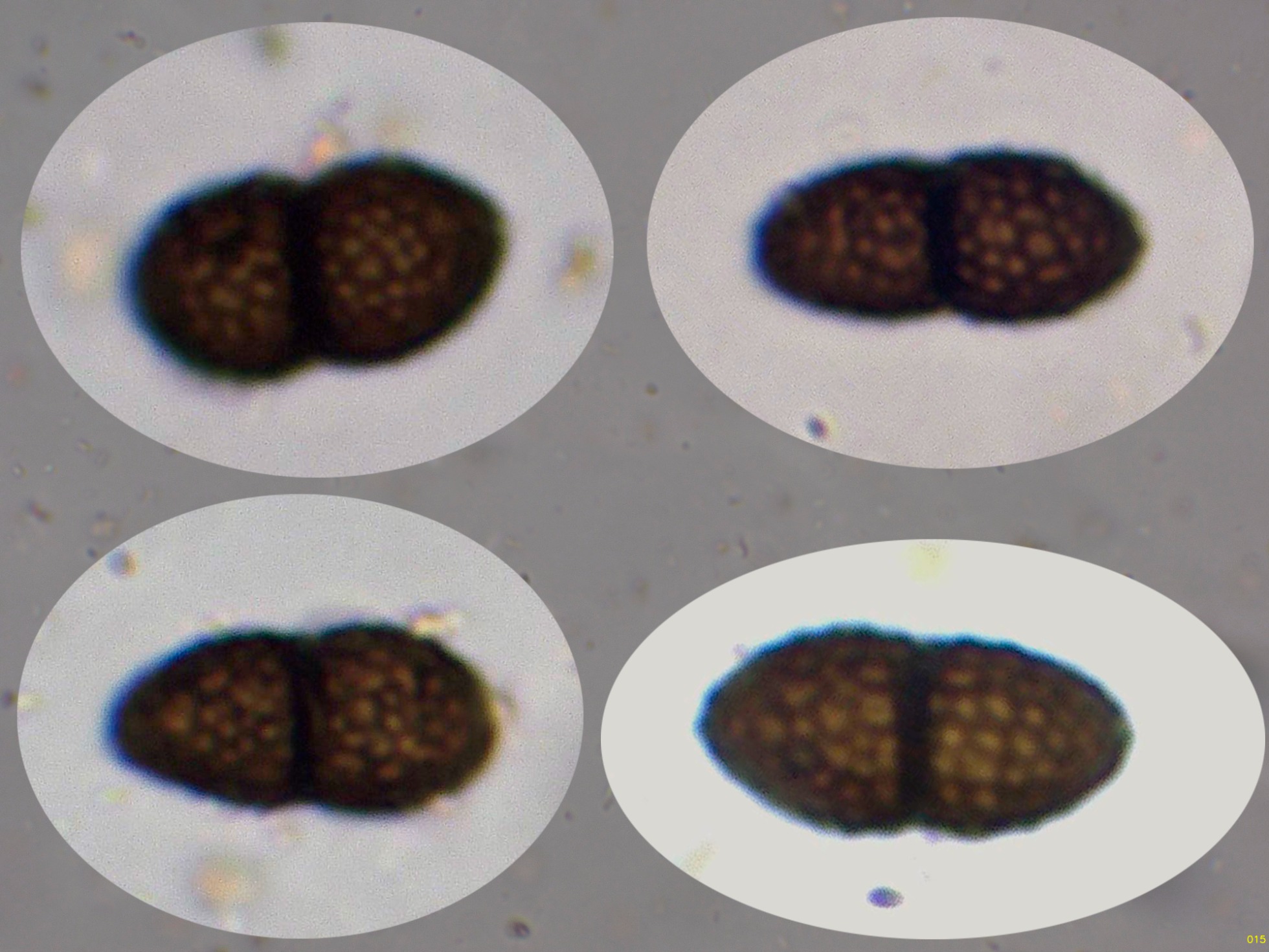 Un par de ampliaciones de estas esporas, en las que se aprecia mejor su superficie reticulada y su muy mascado septo central, con un constreñimiento en el mismo.