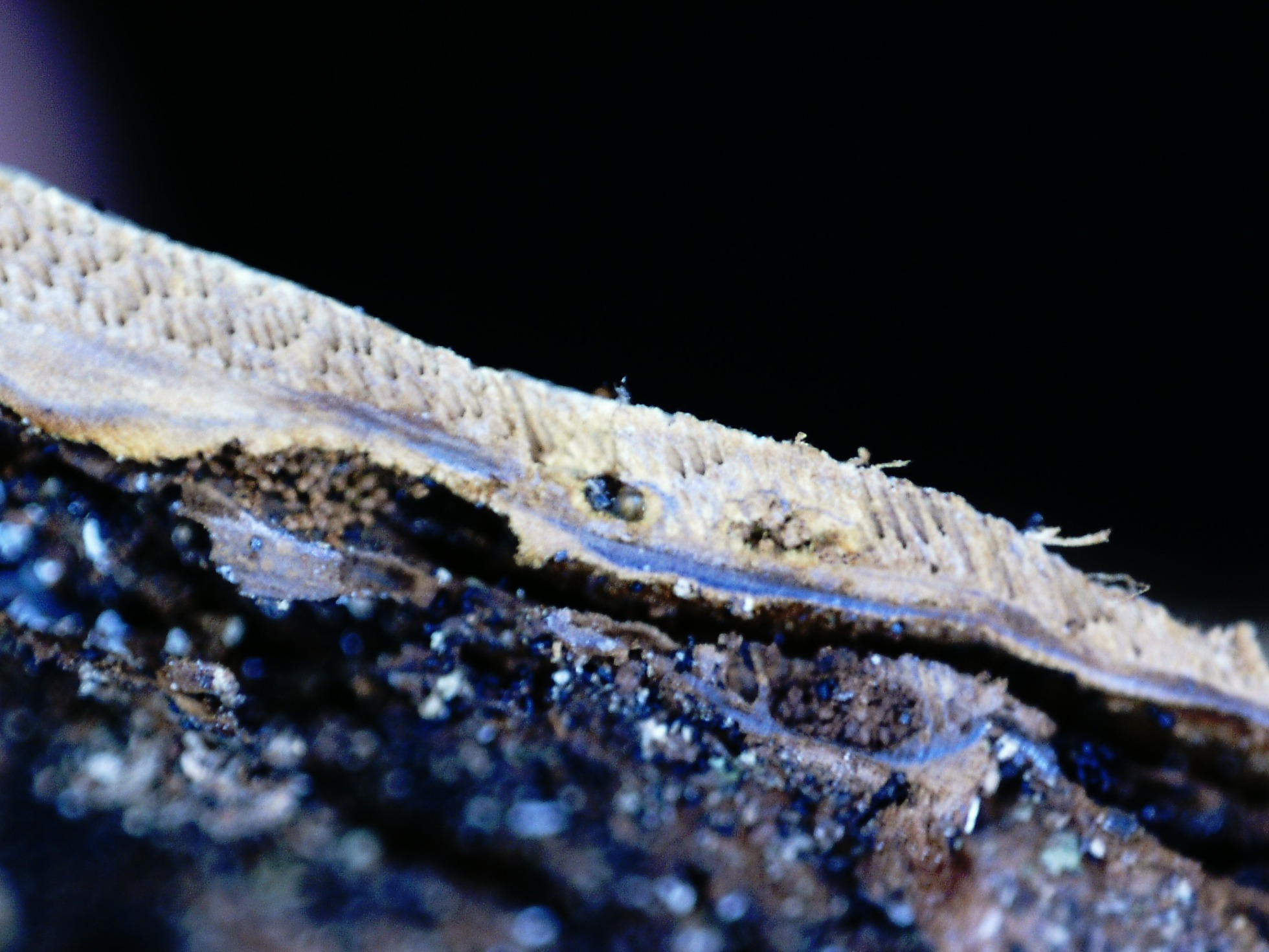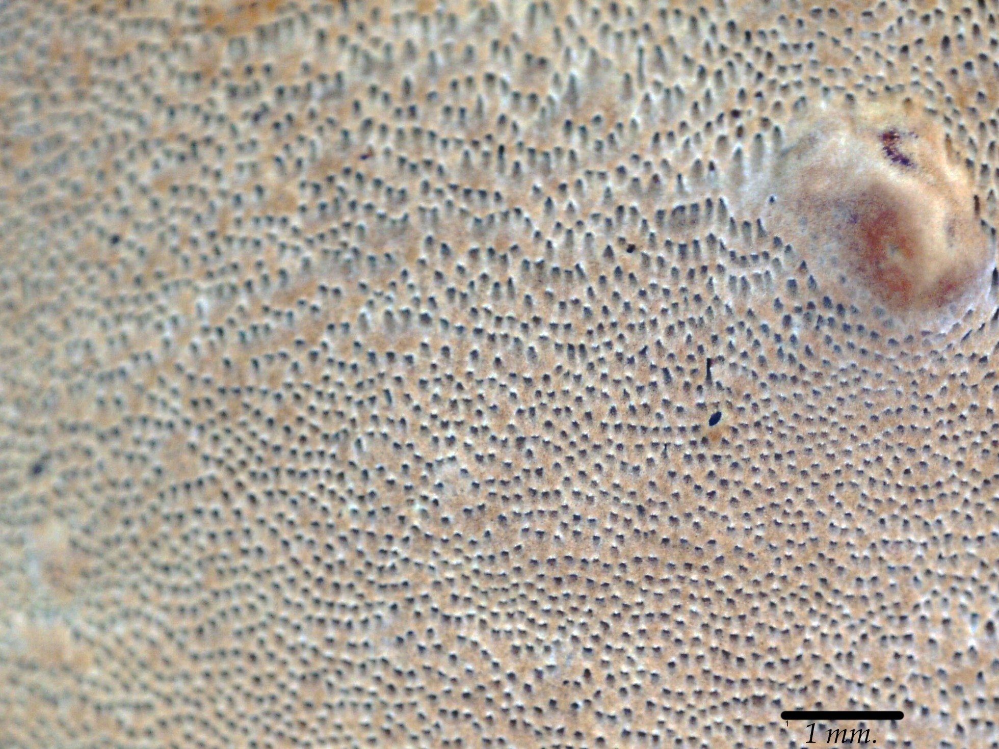 Las características tanto macroscópicamente como microscópicamente parecen coincidir bastante bien con la especie, salvo el número de poros por milímetro, según el documento de 3 a 5 por milímetro y en mi caso de 5 a 7 por milímetro y el tamaño esporal en mi caso de (3.3) 3.6 - 4 (4.2) × (2.4) 2.5 - 3 µm. y según el mismo documento de 5-5.5 × 4-4.5 μm., por estos detalles lo dejo abierto como "cf"