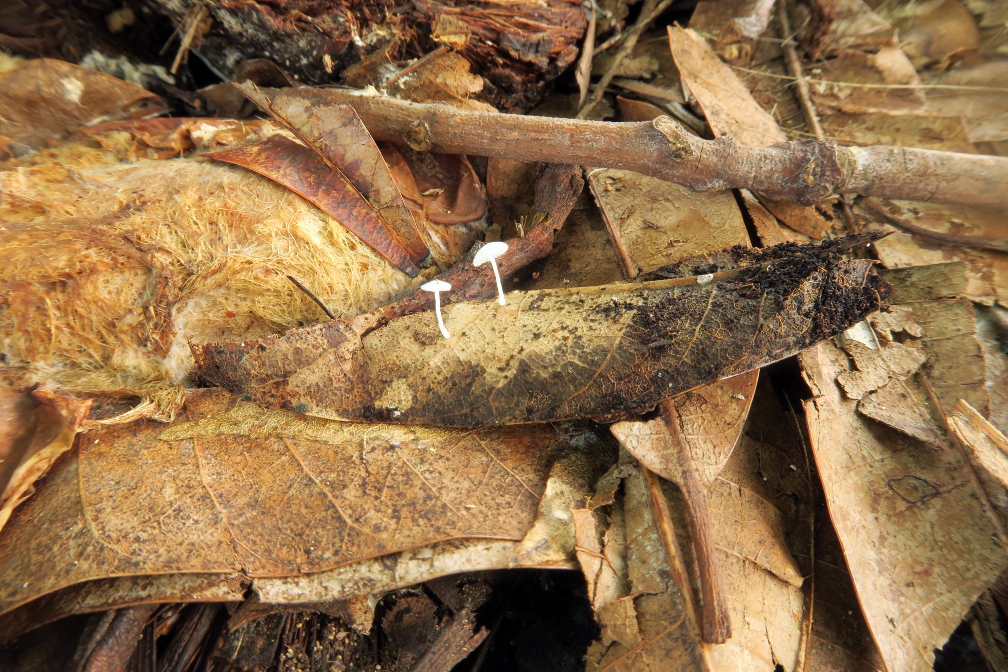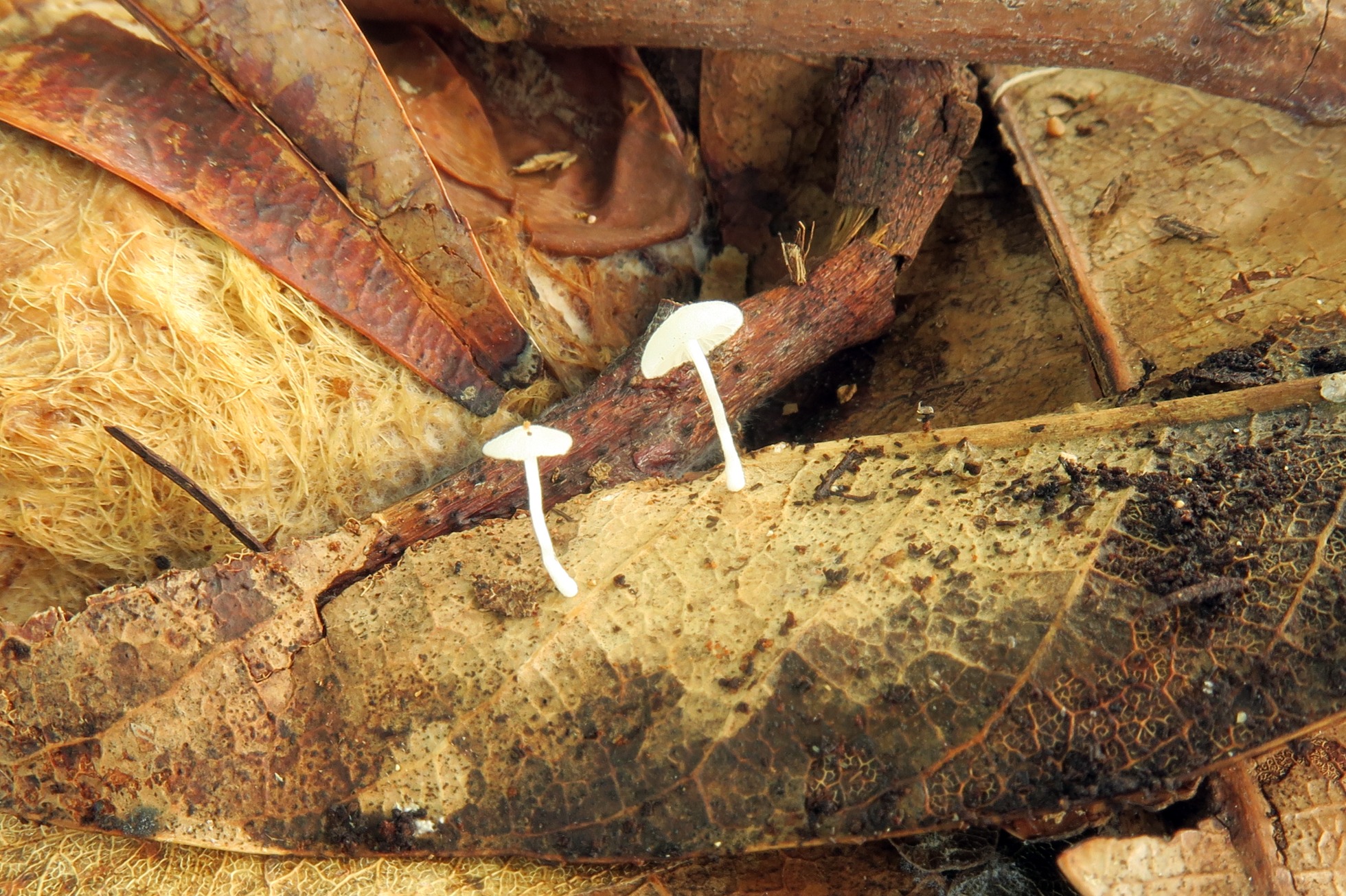 Un par de ejemplares de un hongo Marasmioide, brotando sobre una hoja de mango del suelo (Mangifera indica), fotografiados el 4 de agosto de 2023 en zona ajardinada de Bávaro (Punta Cana).
