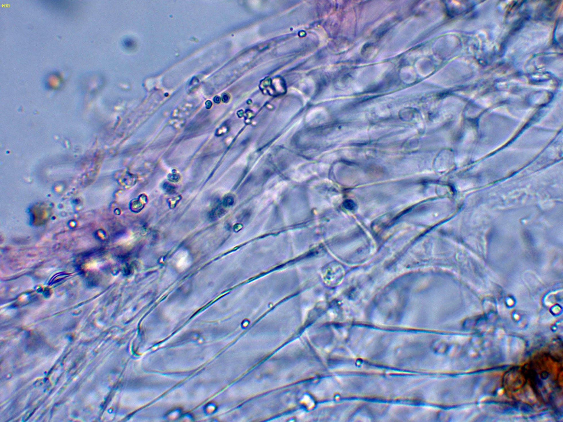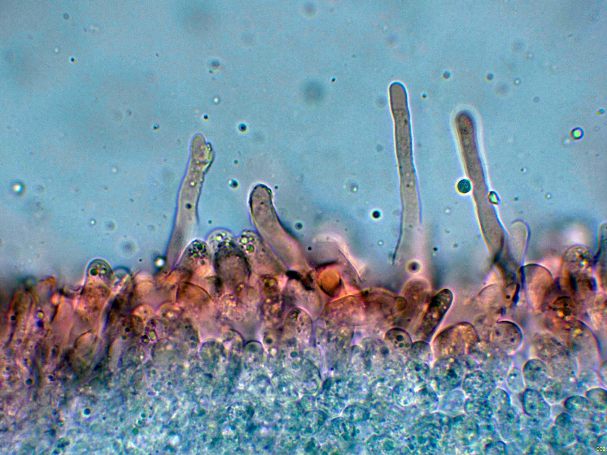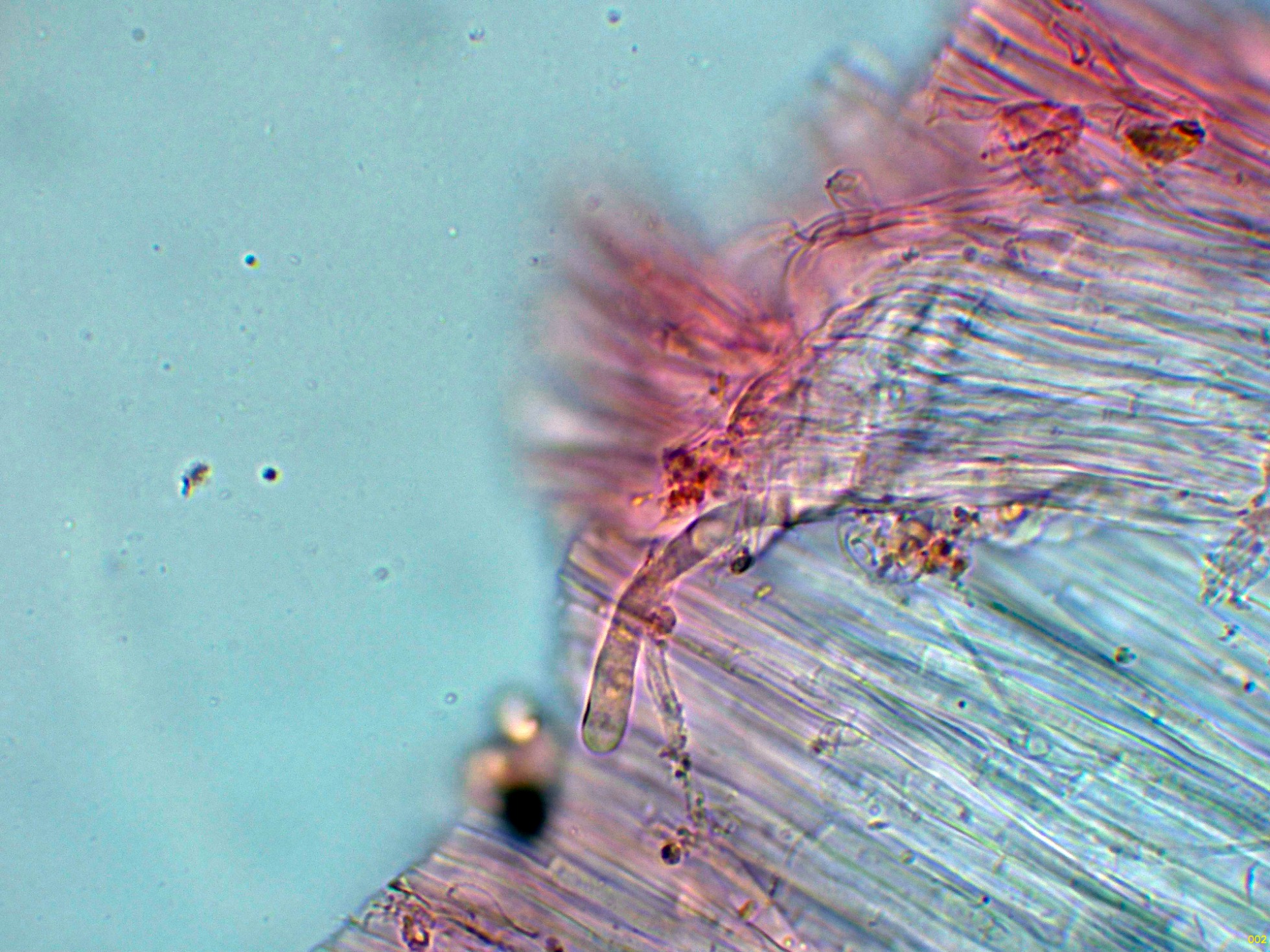 En el margen del sombrero presenta una gran cantidad de hifas terminales a modo de pileocistidios, en la imágen de las láminas ya se puede observar su borde piloso.