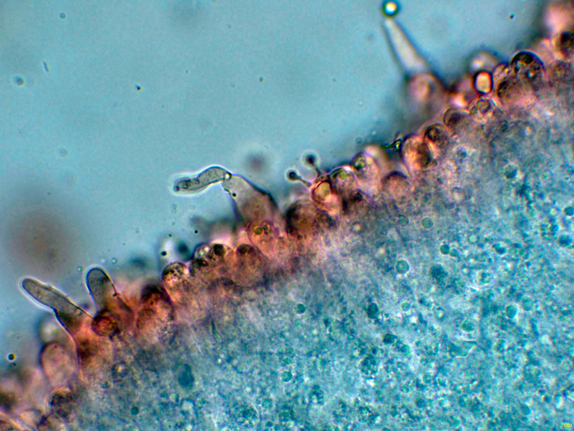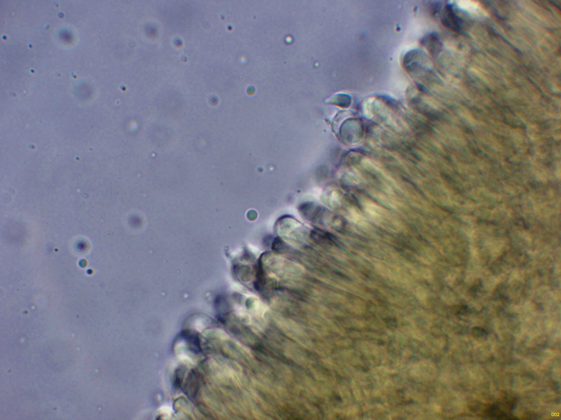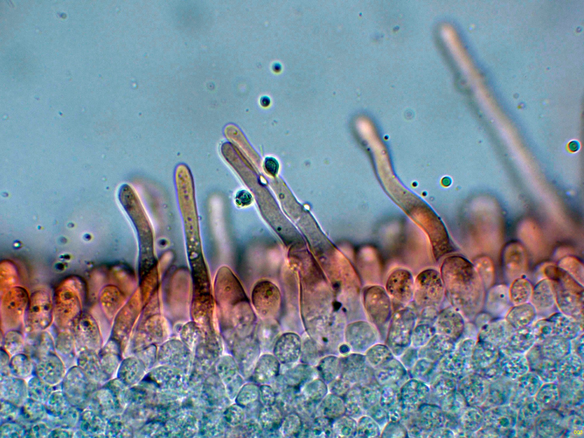 En el margen del sombrero presenta una gran cantidad de hifas terminales a modo de pileocistidios, en la imágen de las láminas ya se puede observar su borde piloso.