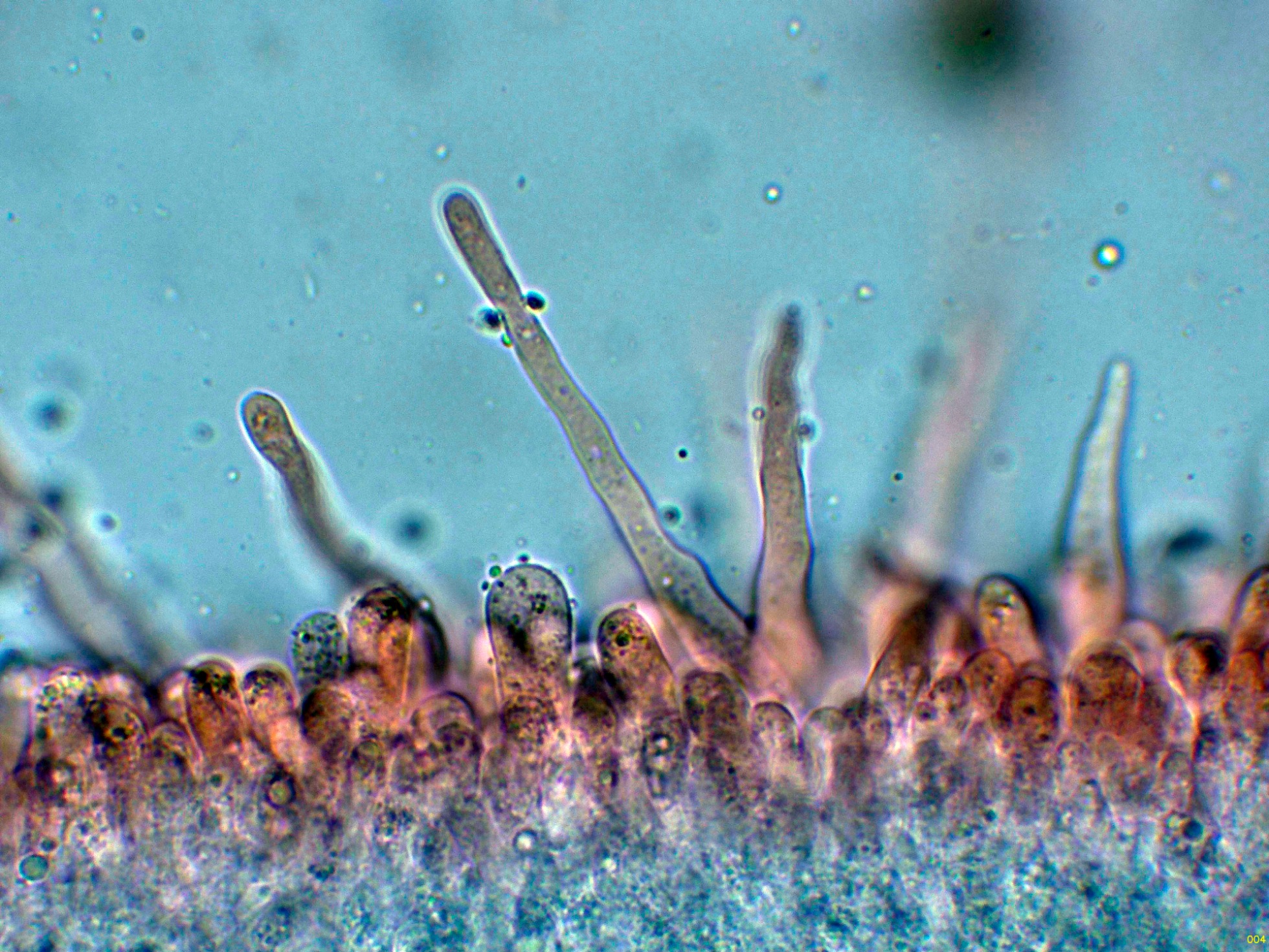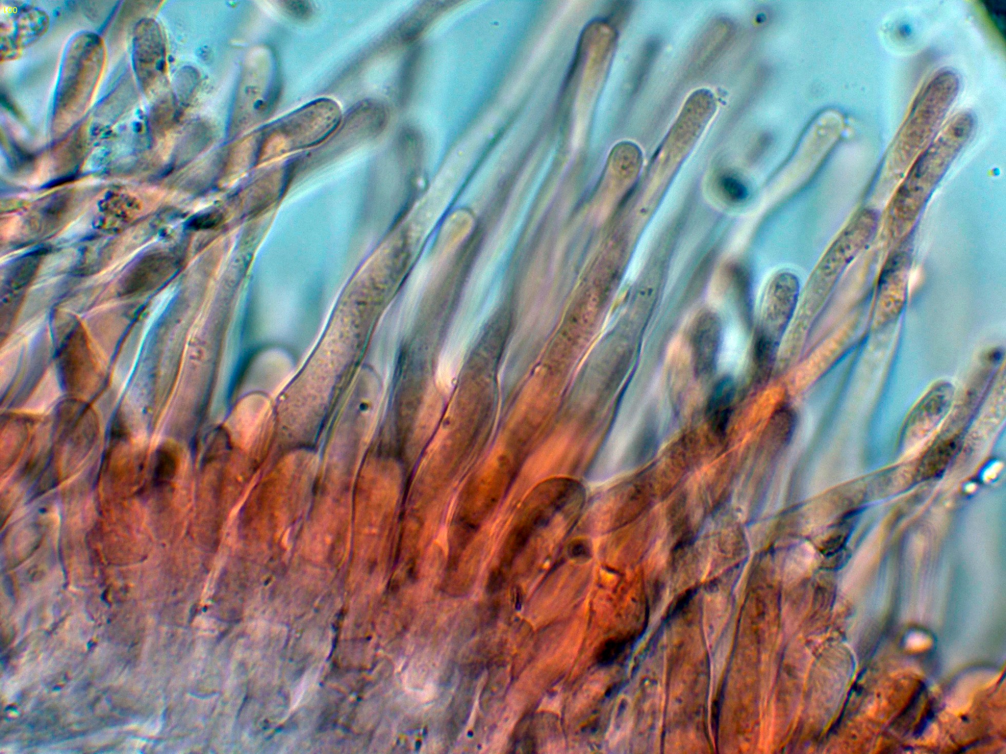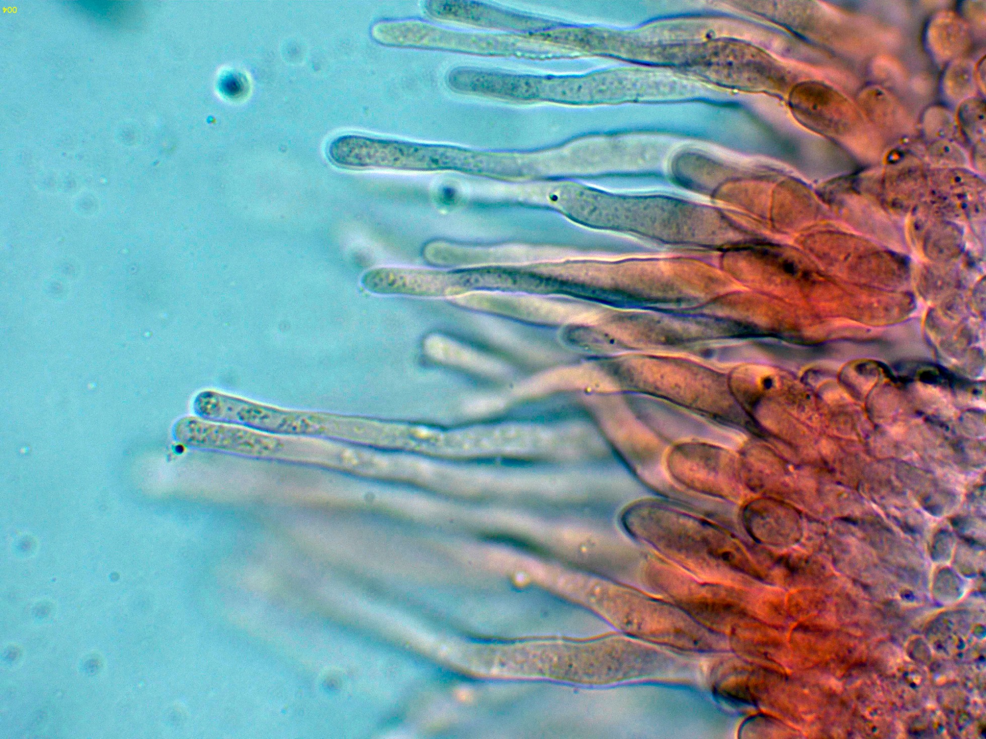 Queilocistidios en Rojo Congo a 1000 aumentos.