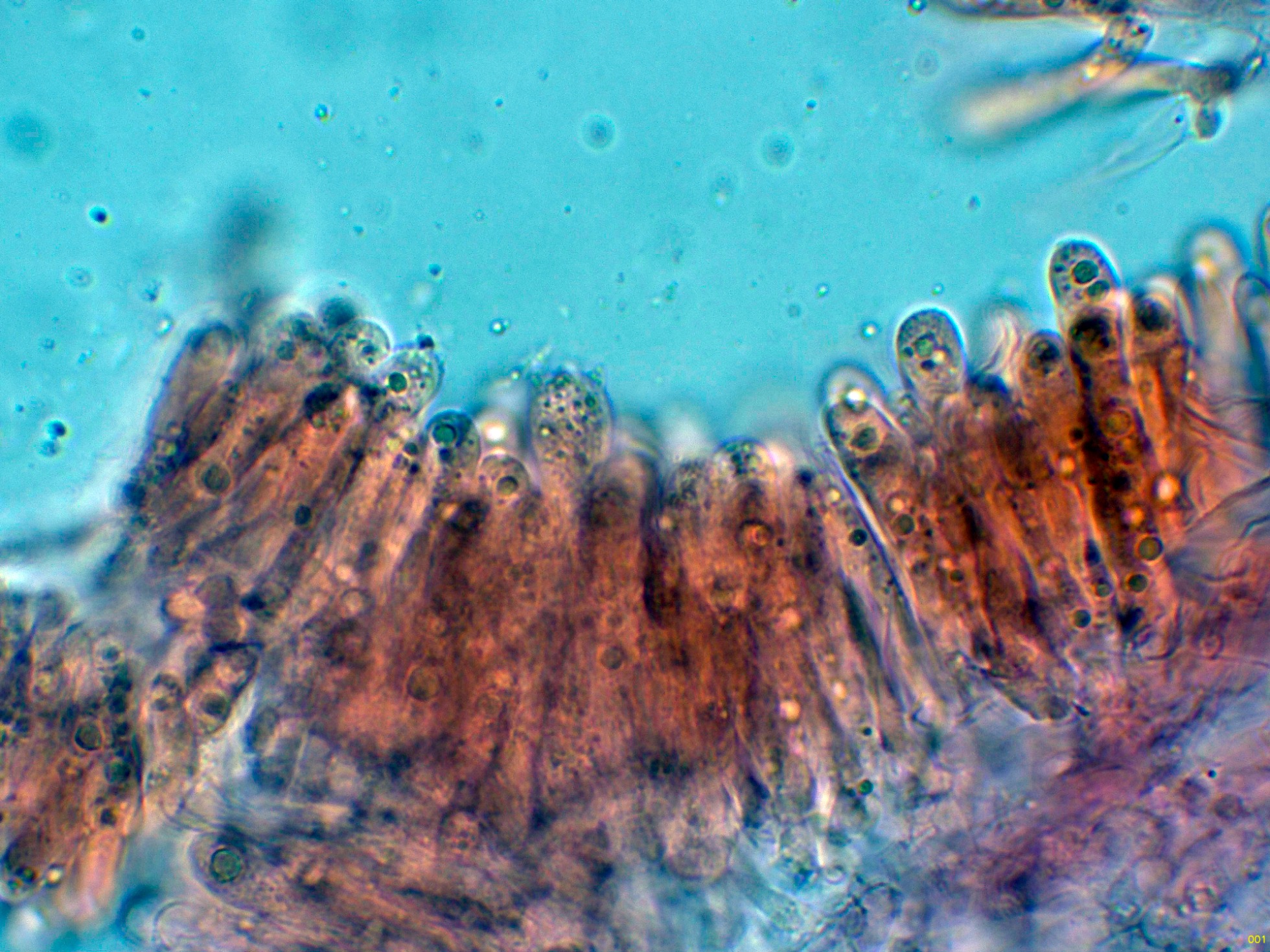 Basidios de la cara laminar con unas medidas de (33.1) 33.7 - 42.8 (47.4) × (6.7) 7 - 9.3 (9.6) µm.