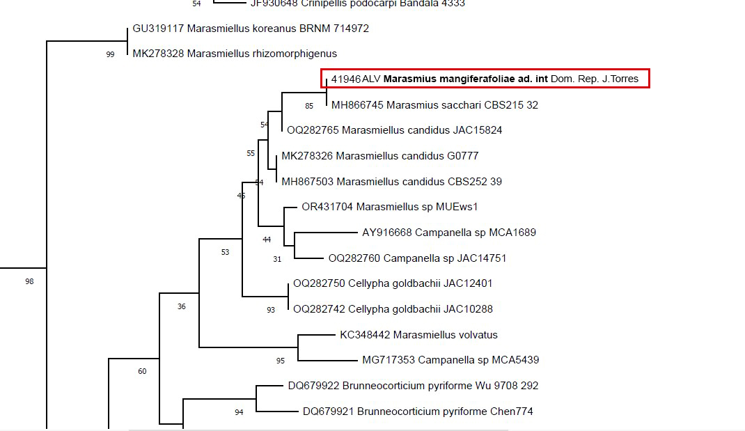 Evidentemente en este caso una coincidencia a nivel molecular del 99,55% no resulta para nada determinante, y hasta que alguien no me demuestre lo contrario, debo considerar este estudio como una nueva especie aún no descrita, así que queda de momento como Marasmius mangiferafoliae ad. int., aunque el resultado del análisis molecular es el de Marasmiellus sacchari MH866745, en la filogénesis ya aparece como Marasmius, y según el criterio de Index Fungorum, su nombre actual sería el de Marasmius sacchari, de ahí lo de "Marasmius". lo de mangiferafoliae haría referencia al sustrato en el que lo encontré (hoja de mango).