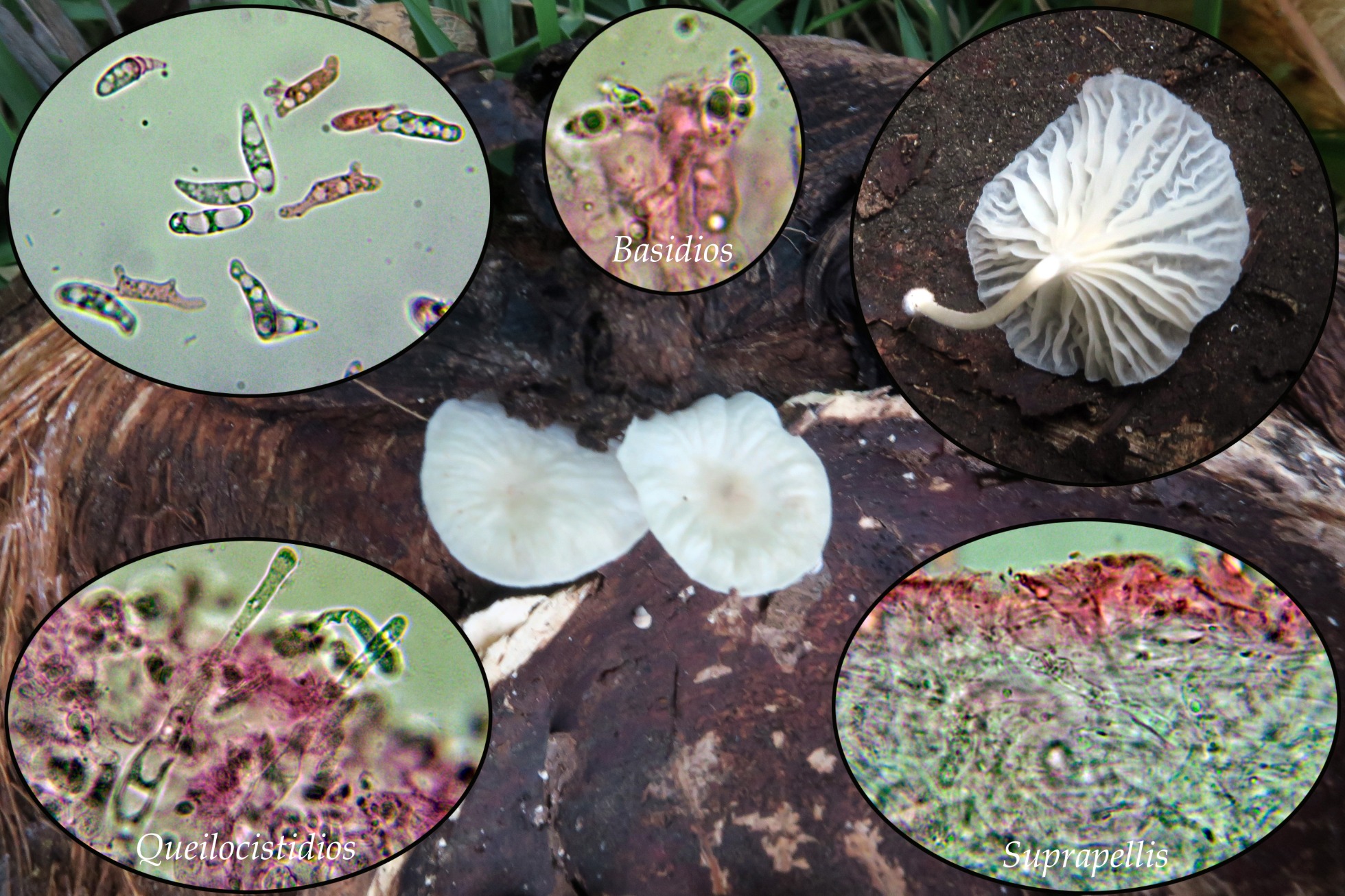 Conclusión: Como con los datos microscópicos no pude llegar a ninguna conclusión medianamente convincente, recurrir como de costumbre al análisis molecular, en un primer intento con el gen ITS, el resultado fue de 100% Marasmiellus sp. MZ997209, como este dato no nos aclaraba nada decidimos probar con el gen LSU, con el resultado de 99.55% Marasmiellus sacchari MH866745, M. candidus OQ282740, 99.10% Campanella sp.OQ282760, Cellypha goldbachii OQ282750, este dato tampoco aclaraba mucho, aunque ya apuntaba a que se trataba de una especie nueva aún no secuenciada, los cuatro otros genes analizados complicaron aún más la cosa, dejo aquí los resultados SSU = ok, 100% Campanella sp. AY916675, 99.47% Tetrapyrgos, Brunneocorticium, RPB1 = 95% Campanella sp. AY916671, RPB2 = ok, sin afinidades, 78% Myxoderma, Agaricus, TEF1 = ok, 89% Campanella sp. AY916672.