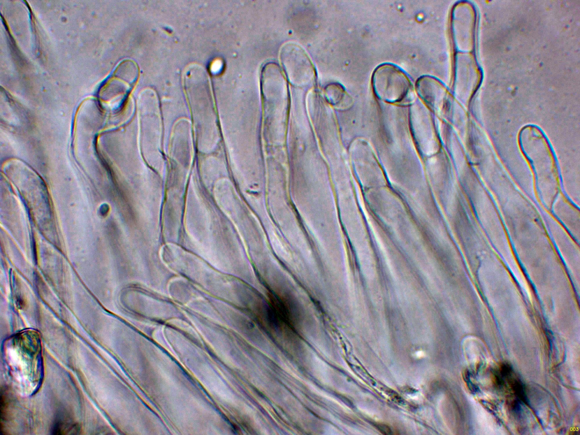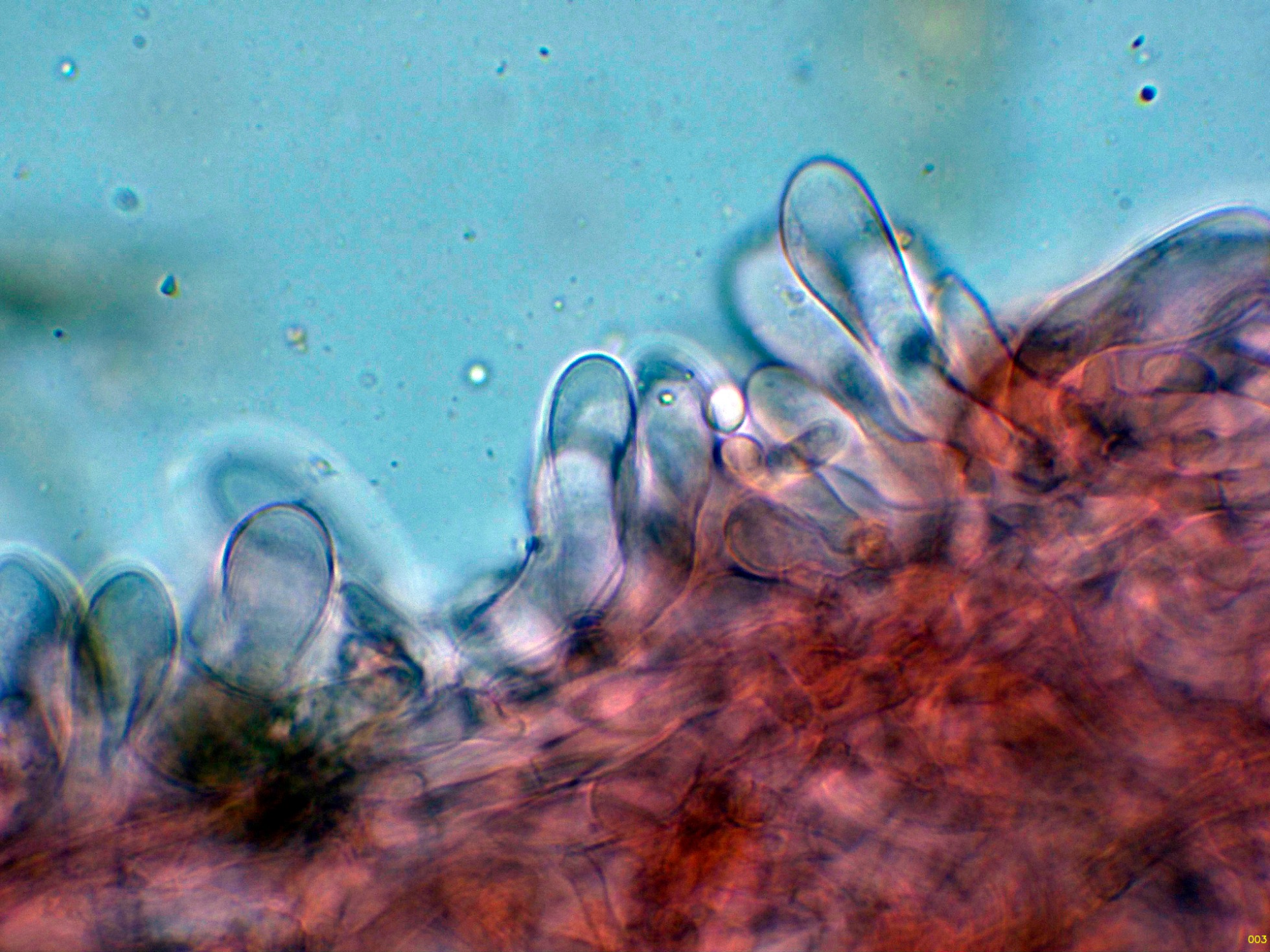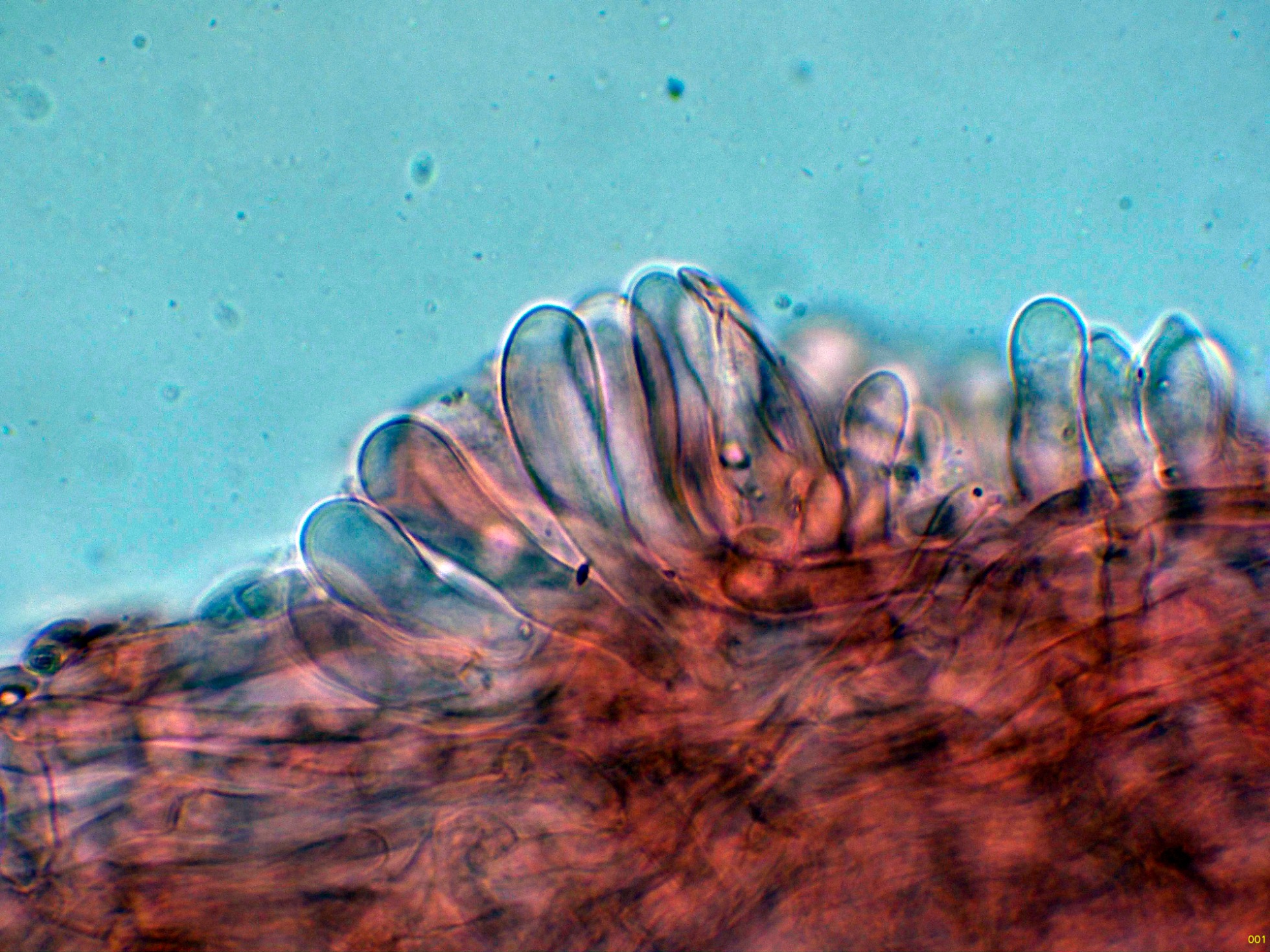 Queilocistidios de gran tamaño y muy abundantes en la arista laminar.