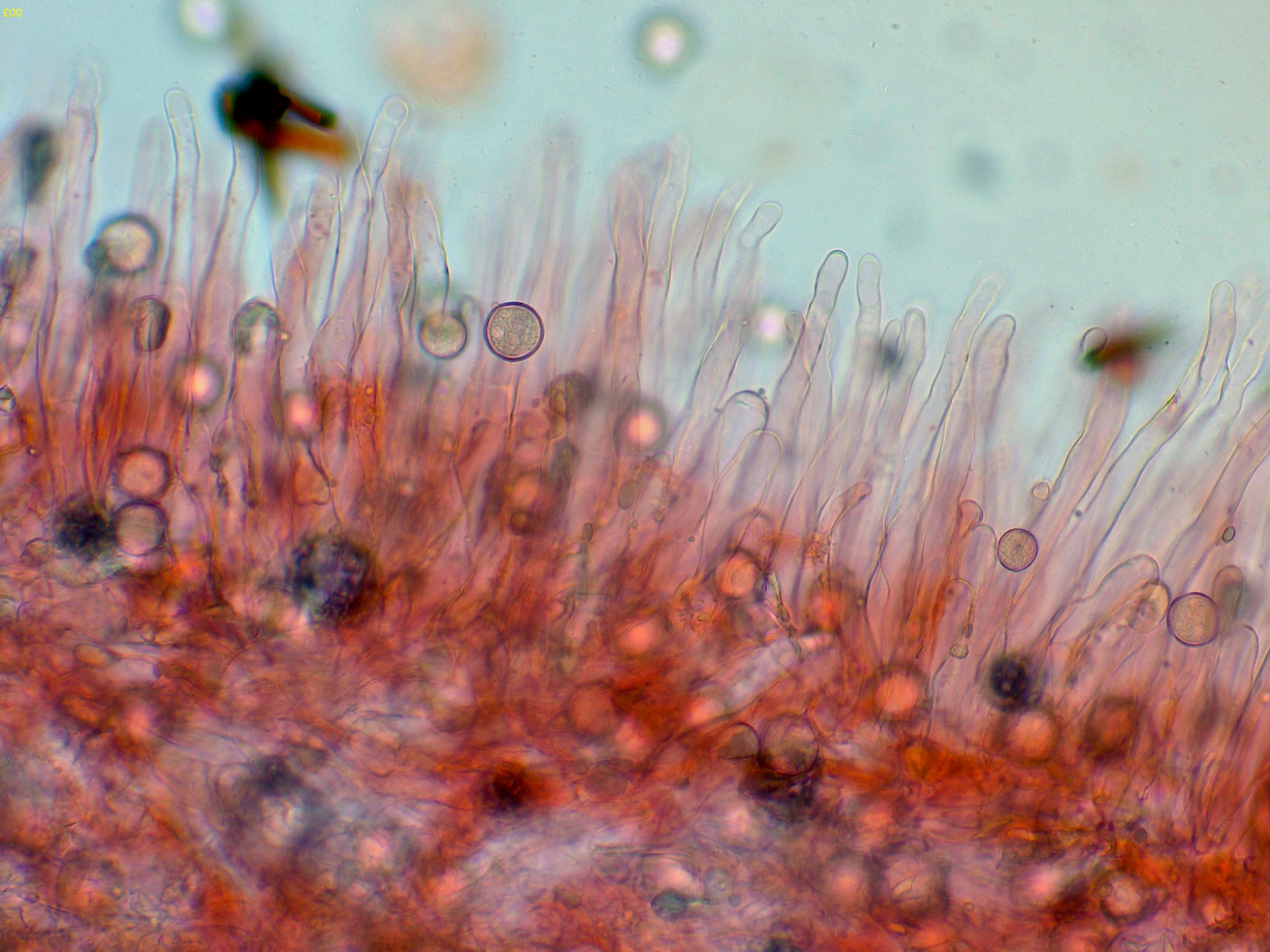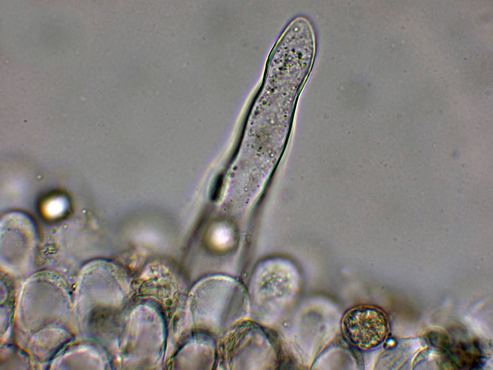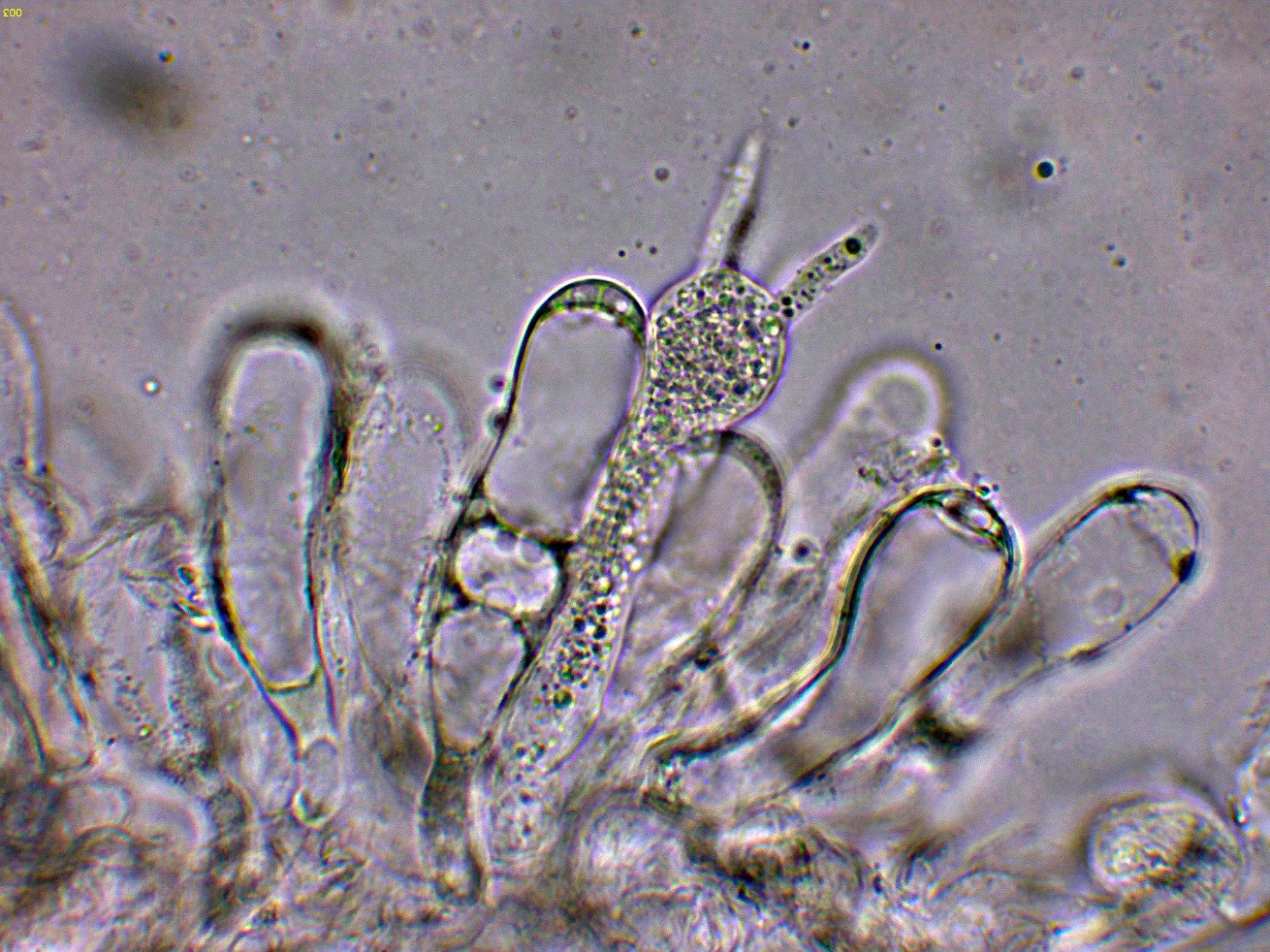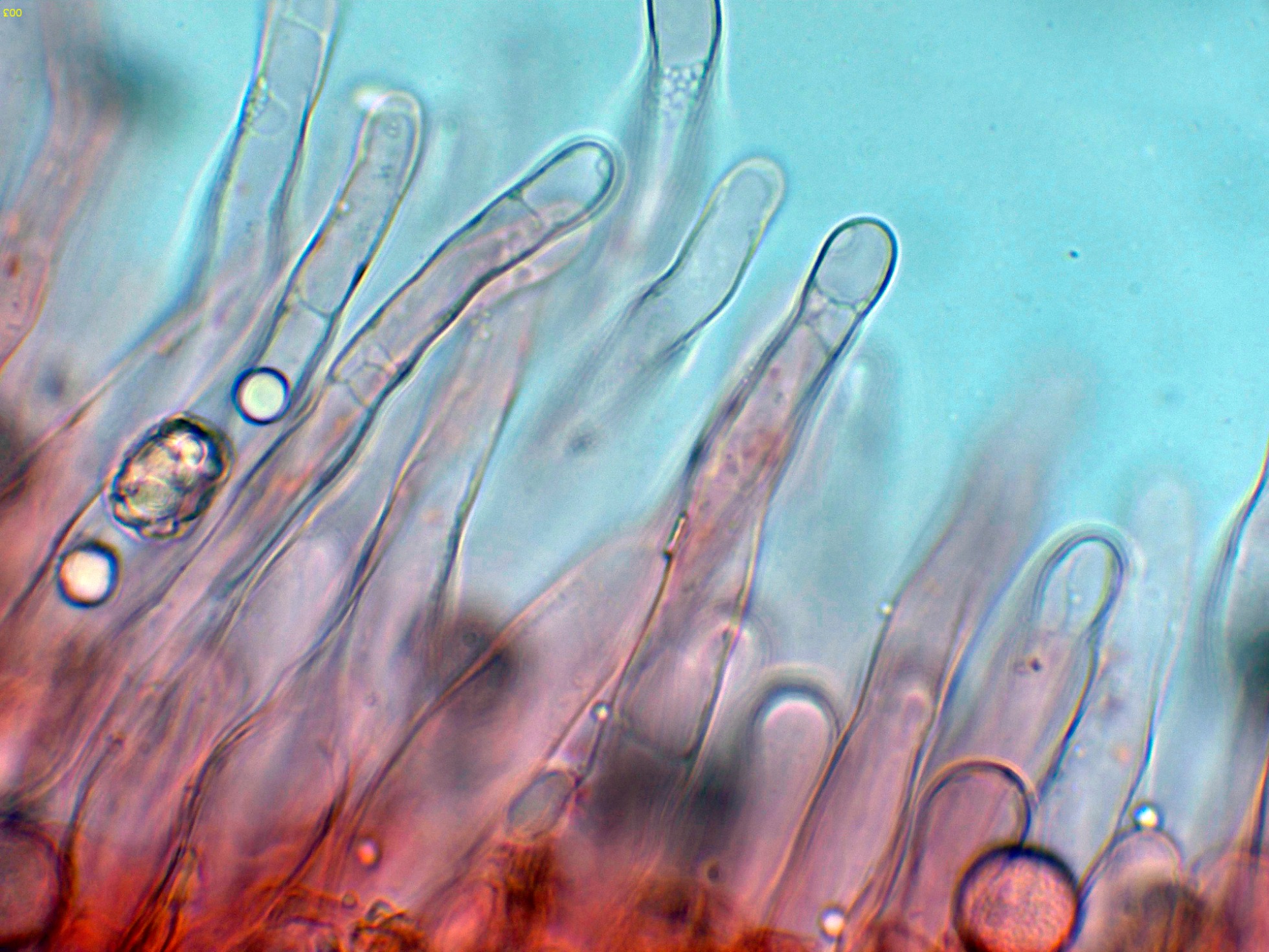 Queilocistidios de gran tamaño y muy abundantes en la arista laminar.
