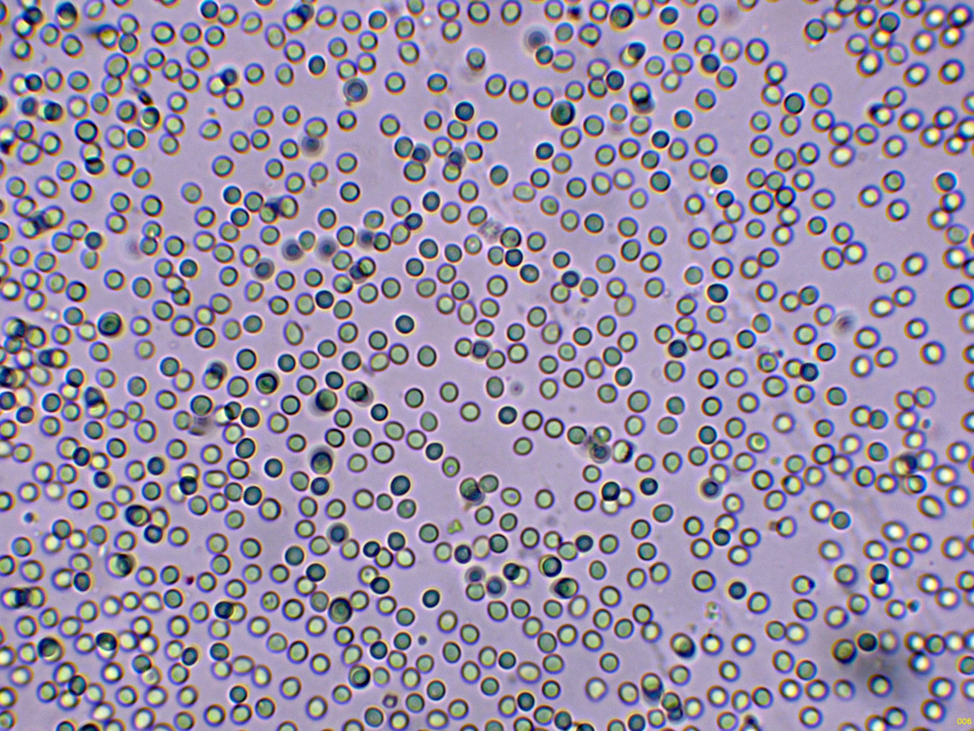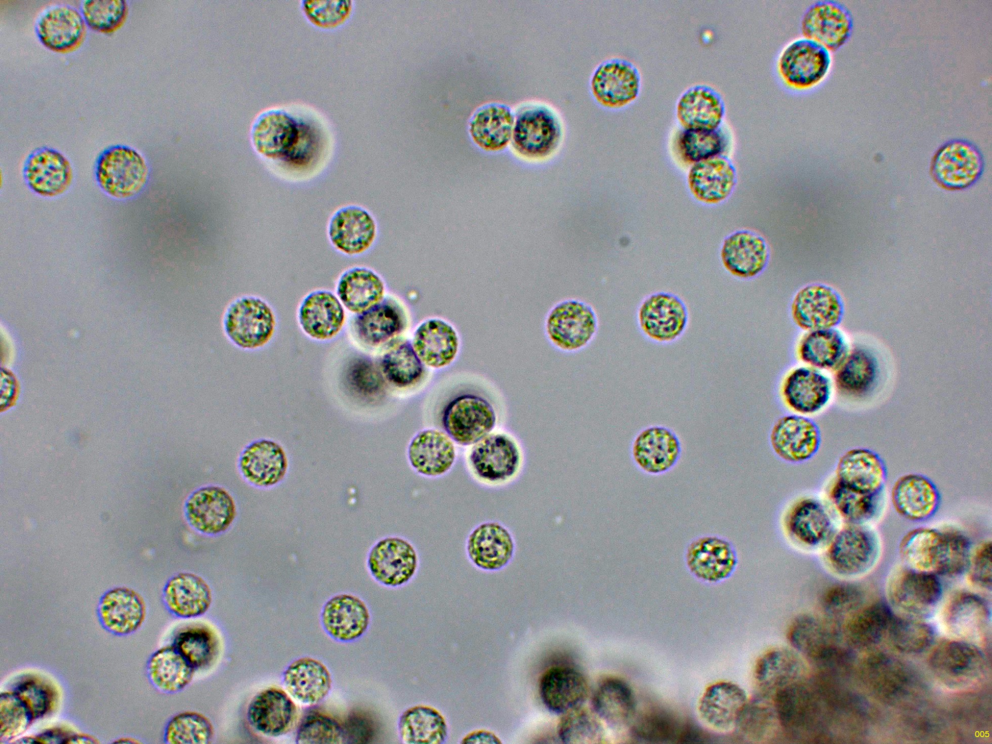 La superficie de los poros a 20 aumentos, con unas manchas verdosas del Trichoderma.