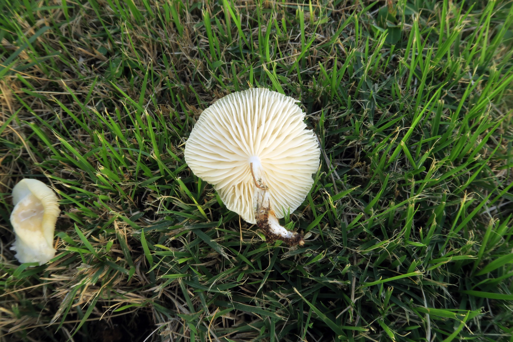 Una Oundemansiella, que aunque parece brotar del suelo lo hace asociada a unas raíces.