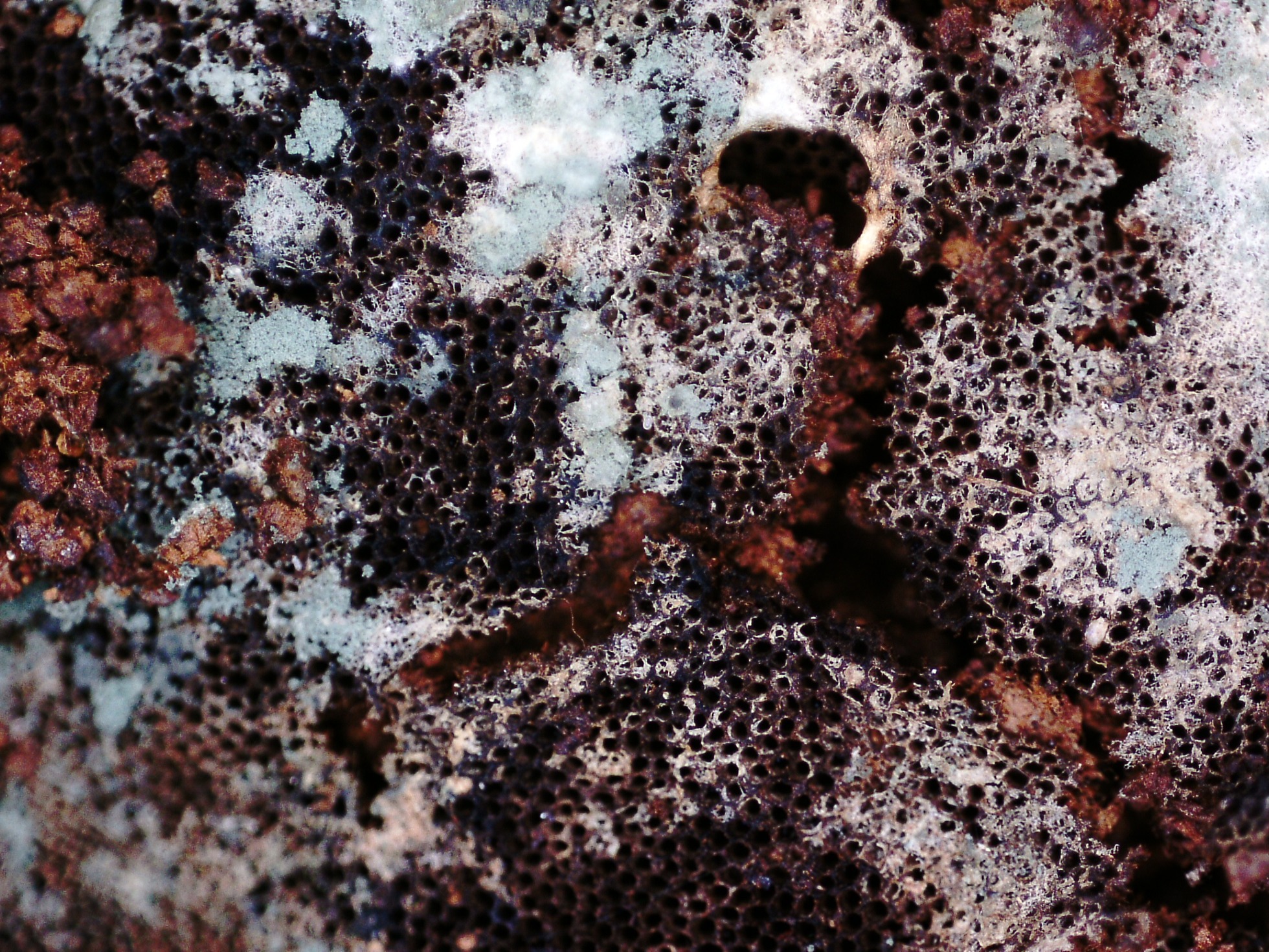 Un Trichoderma sobre el himenio de un ejemplar ya bastante degradado de Cerrena caperata.