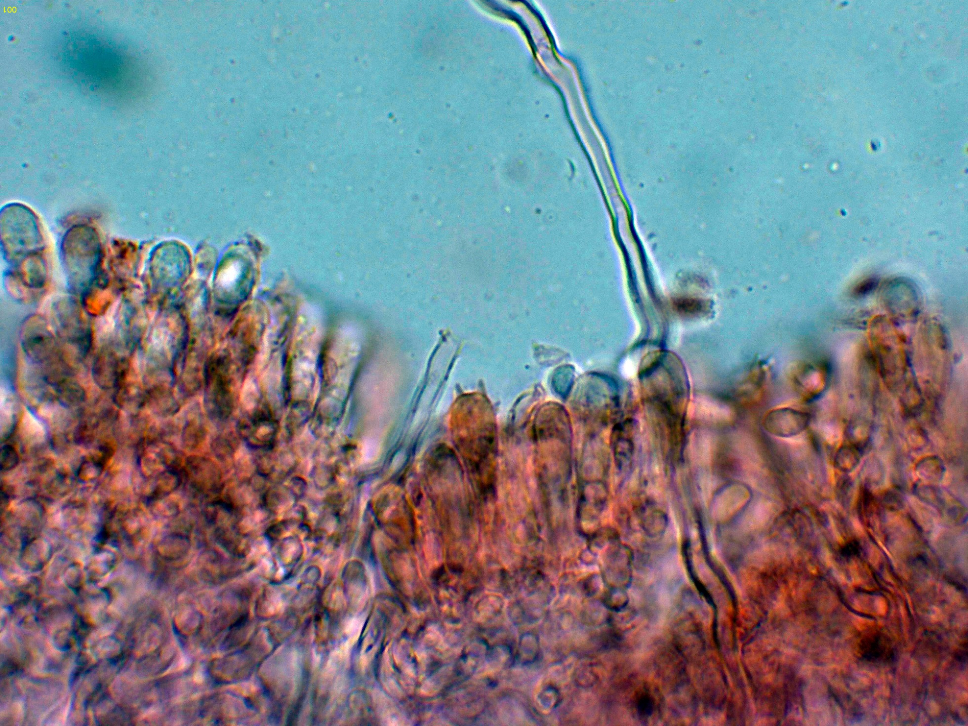 Queilocistidios a 400 aumentos, con unas medidas de (69.7) 92.3 - 153.3 (156.6) × (6.5) 7.4 - 9.3 (11.8) µm.