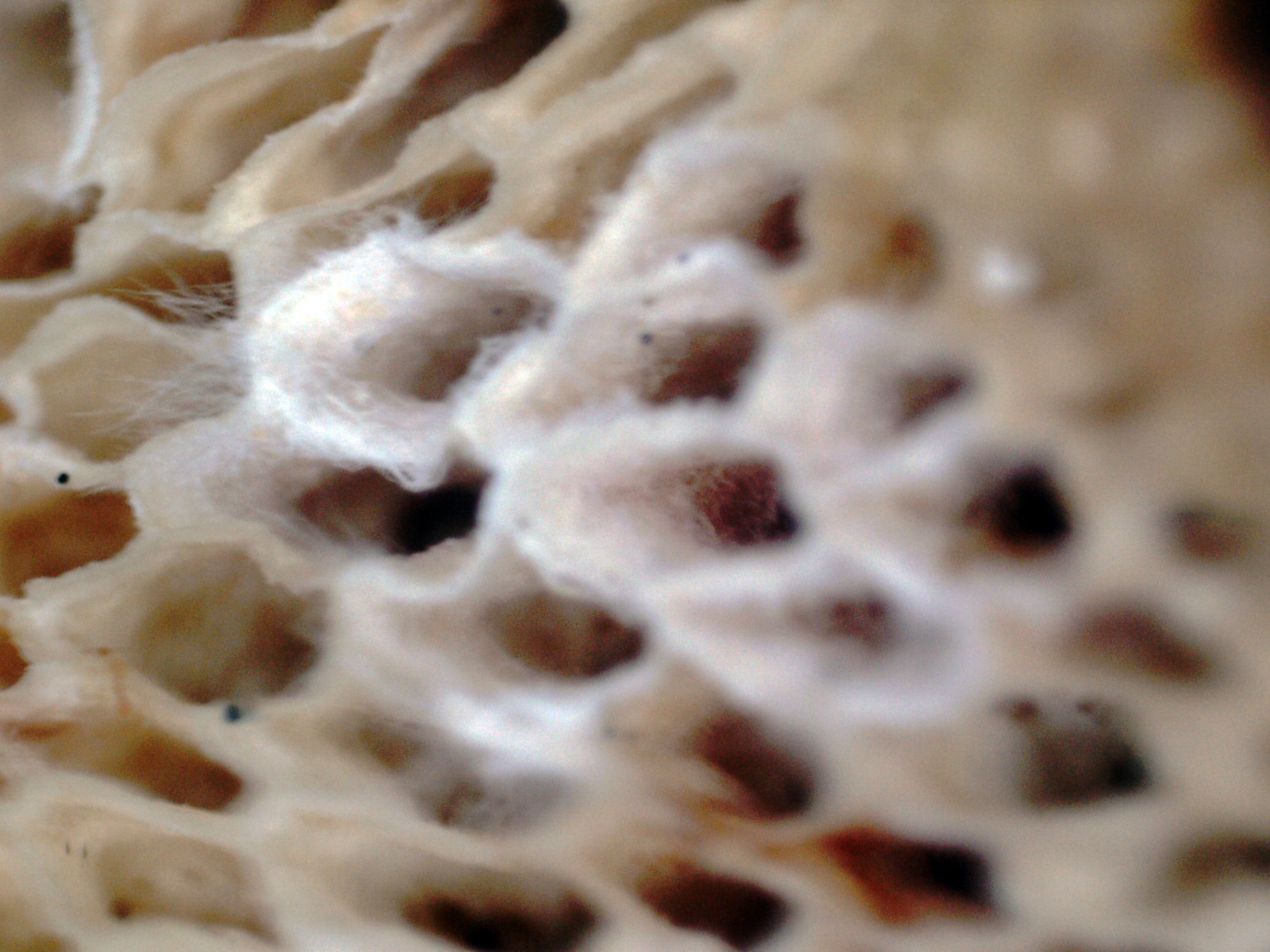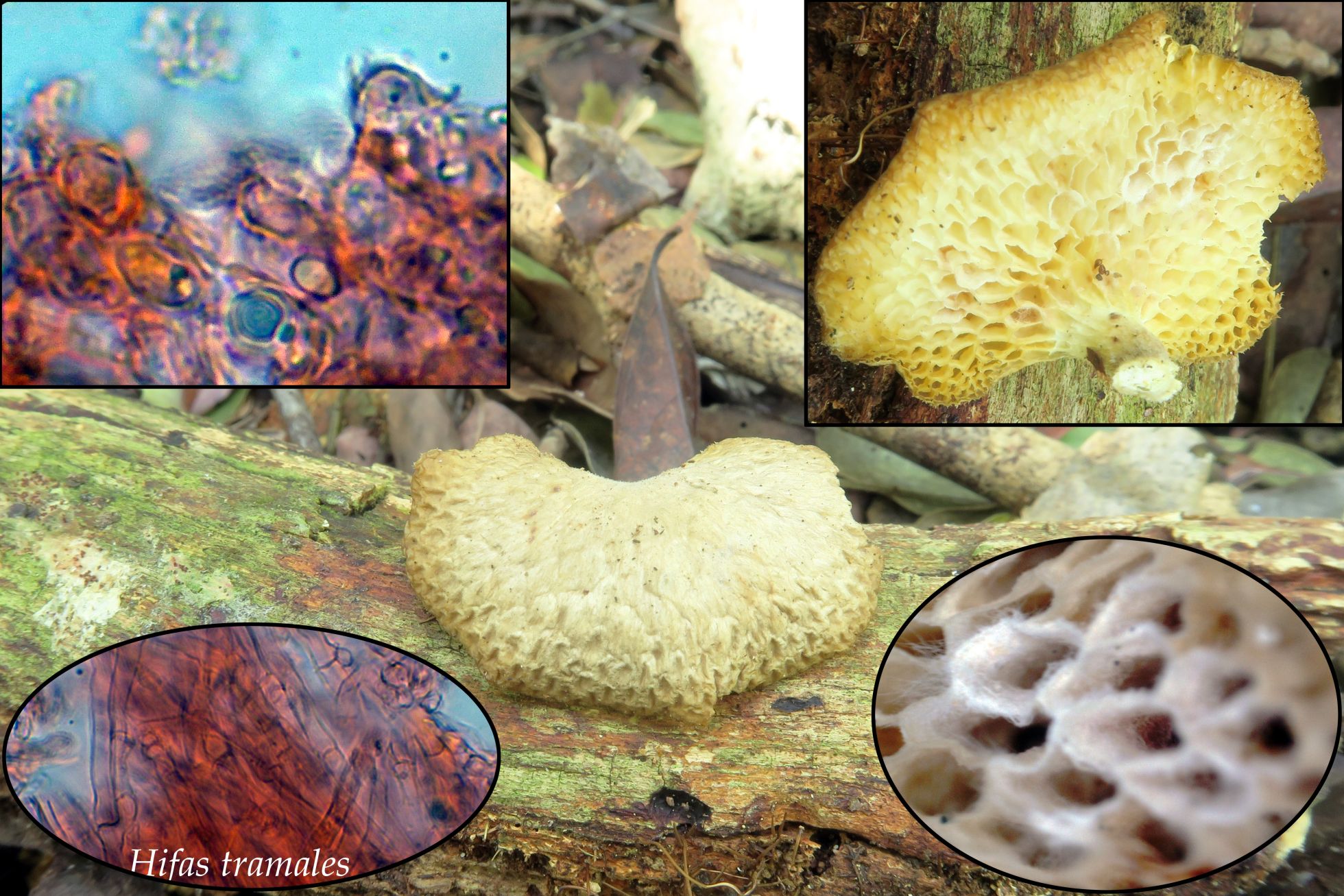 Aunque dado su estado no pude obtener esporas, su identidad me parece bastante clara, se trata de Favolus tenuiculus, muy parecido al Europeo Polyporus alveolaris = Neofavolus alveolaris, pero de ámbito tropical, de color blanco y carne prácticamente inexistente.
