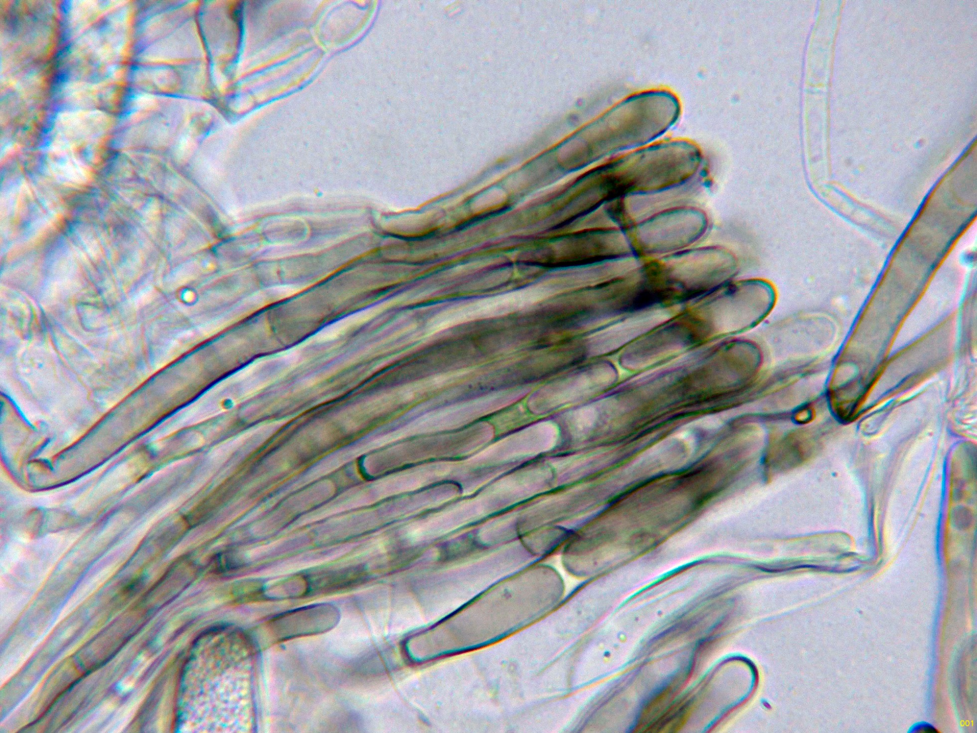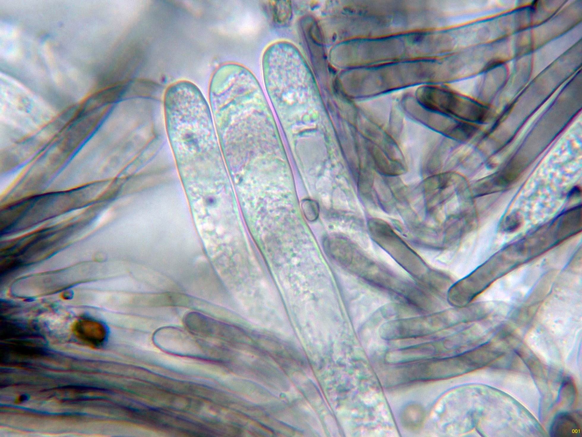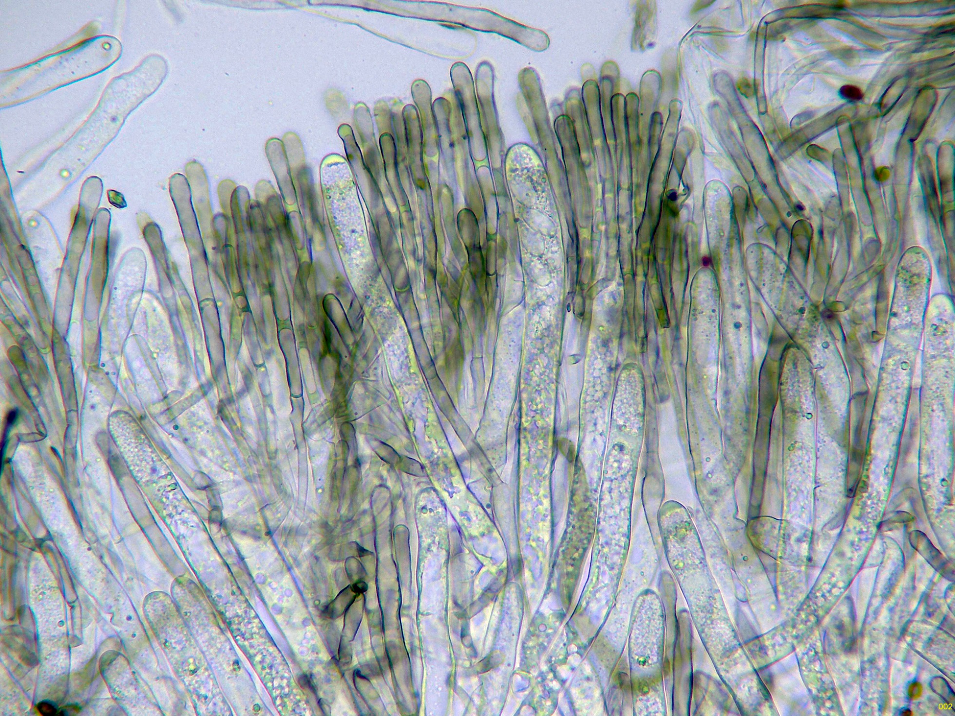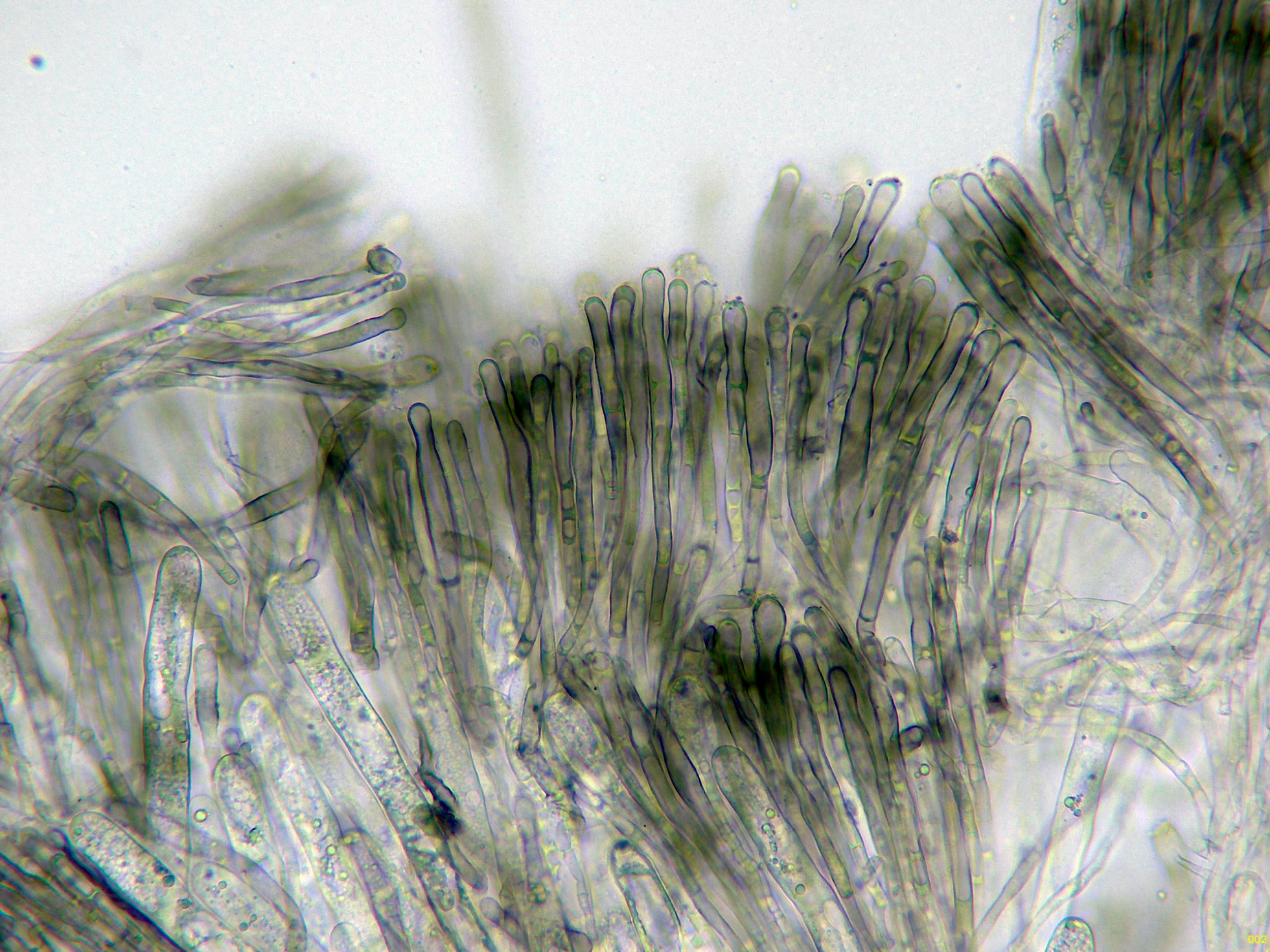 Paráfisis filiformes, septadas, muchas de ellas ramificadas, ligeramente ensanchadas en el ápice y con pigmento intracelular marrón.