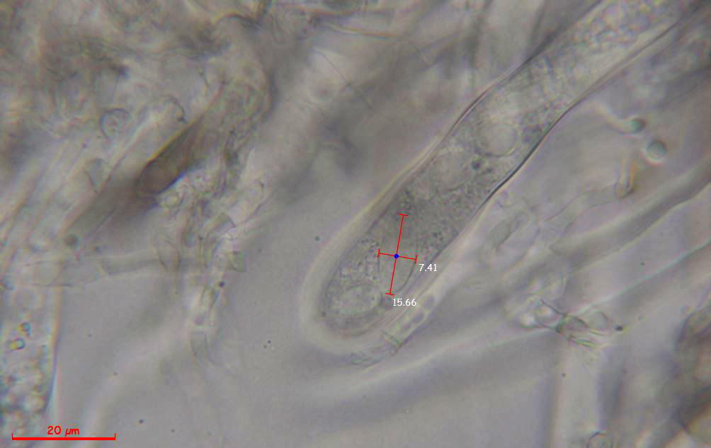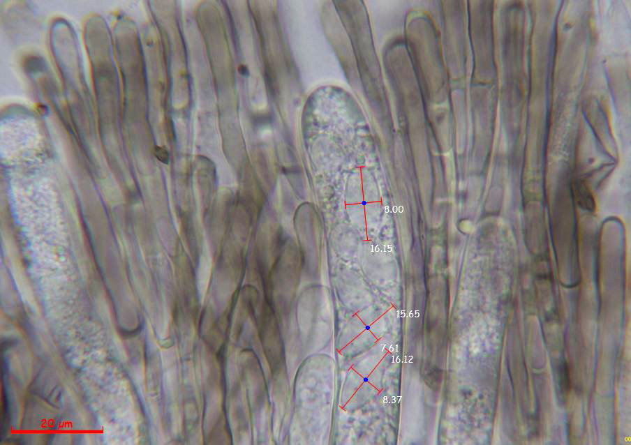 Ascosporas inmaduras dentro del asco, al parecer lisas, con unas medidas de (13.6) 13.64 - 16.15 (16.2) × 7.4 - 8.37 (8.4) µm. Q = 1.9 - 2.1 ; Qe = 2.