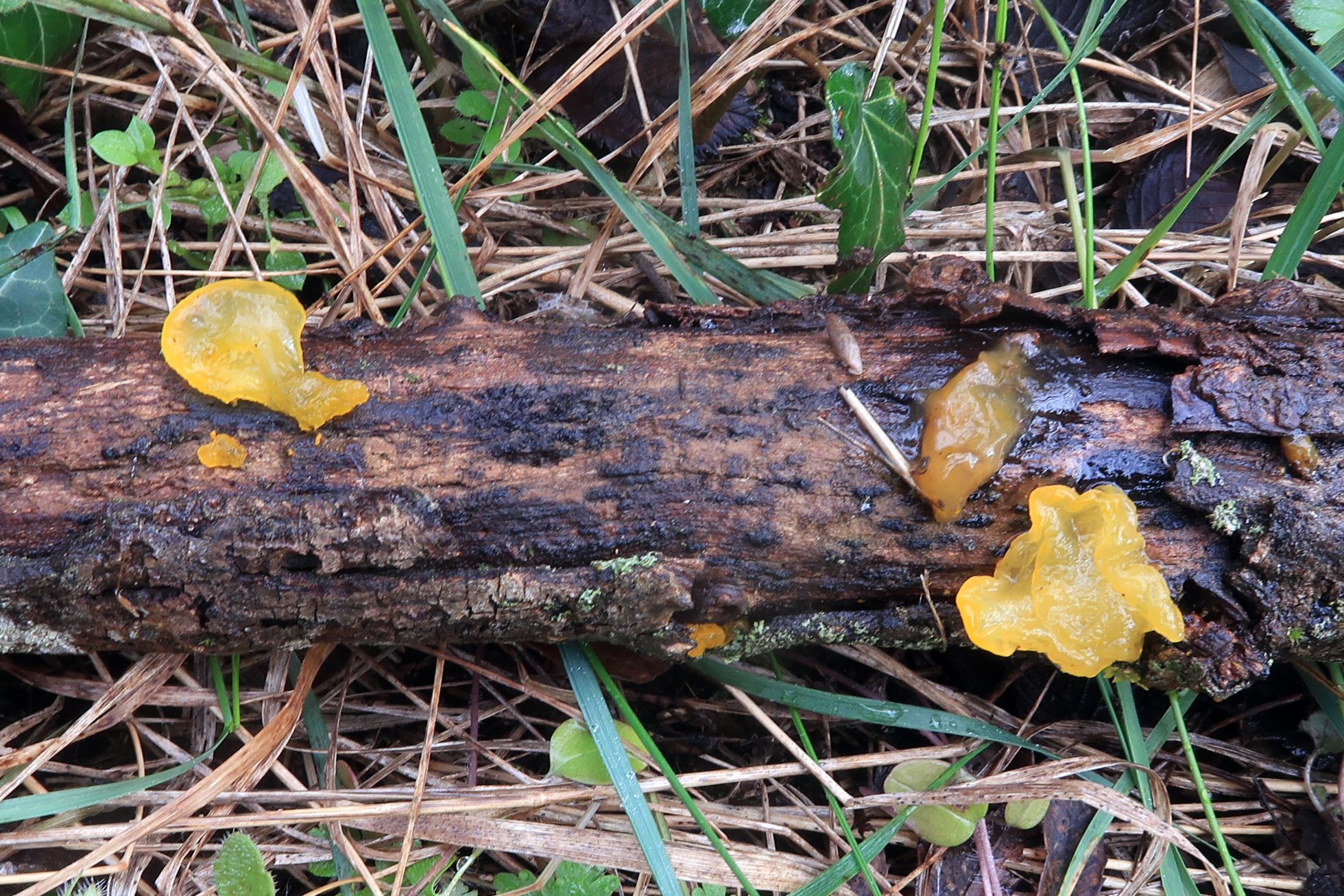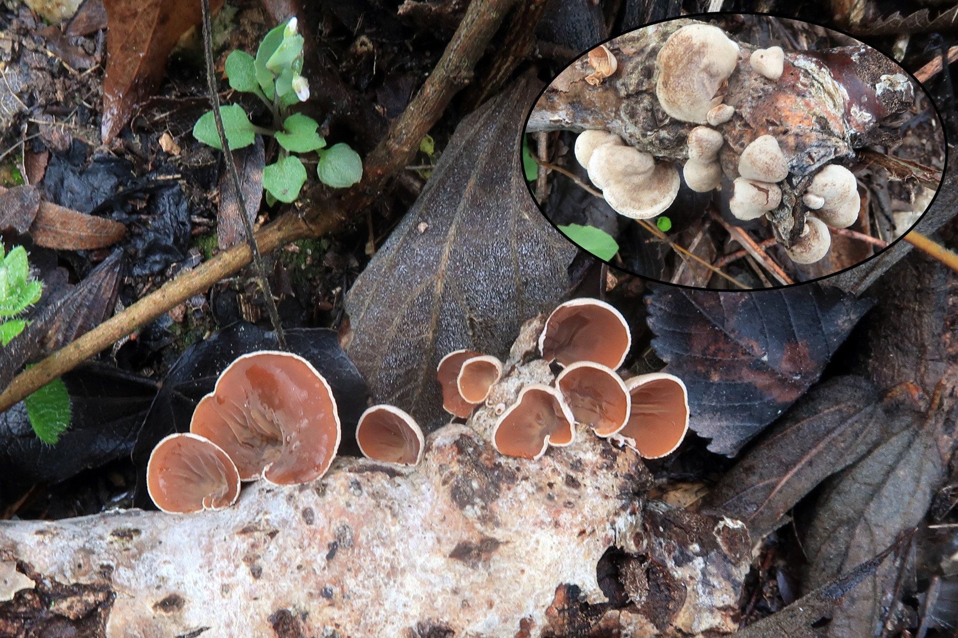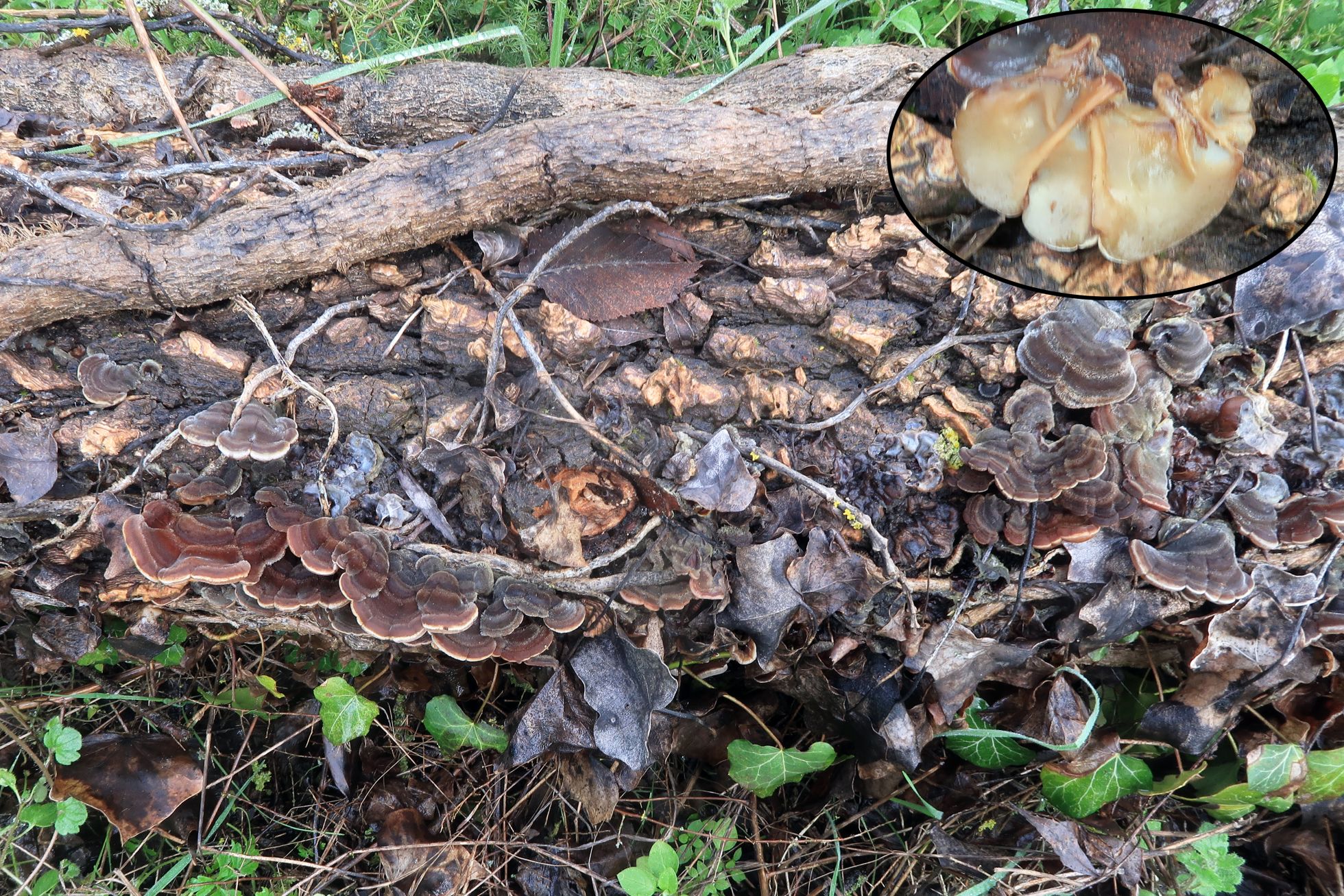 Muy abundante y colonizando todos los troncos del suelo, la Auricularia mesenterica.