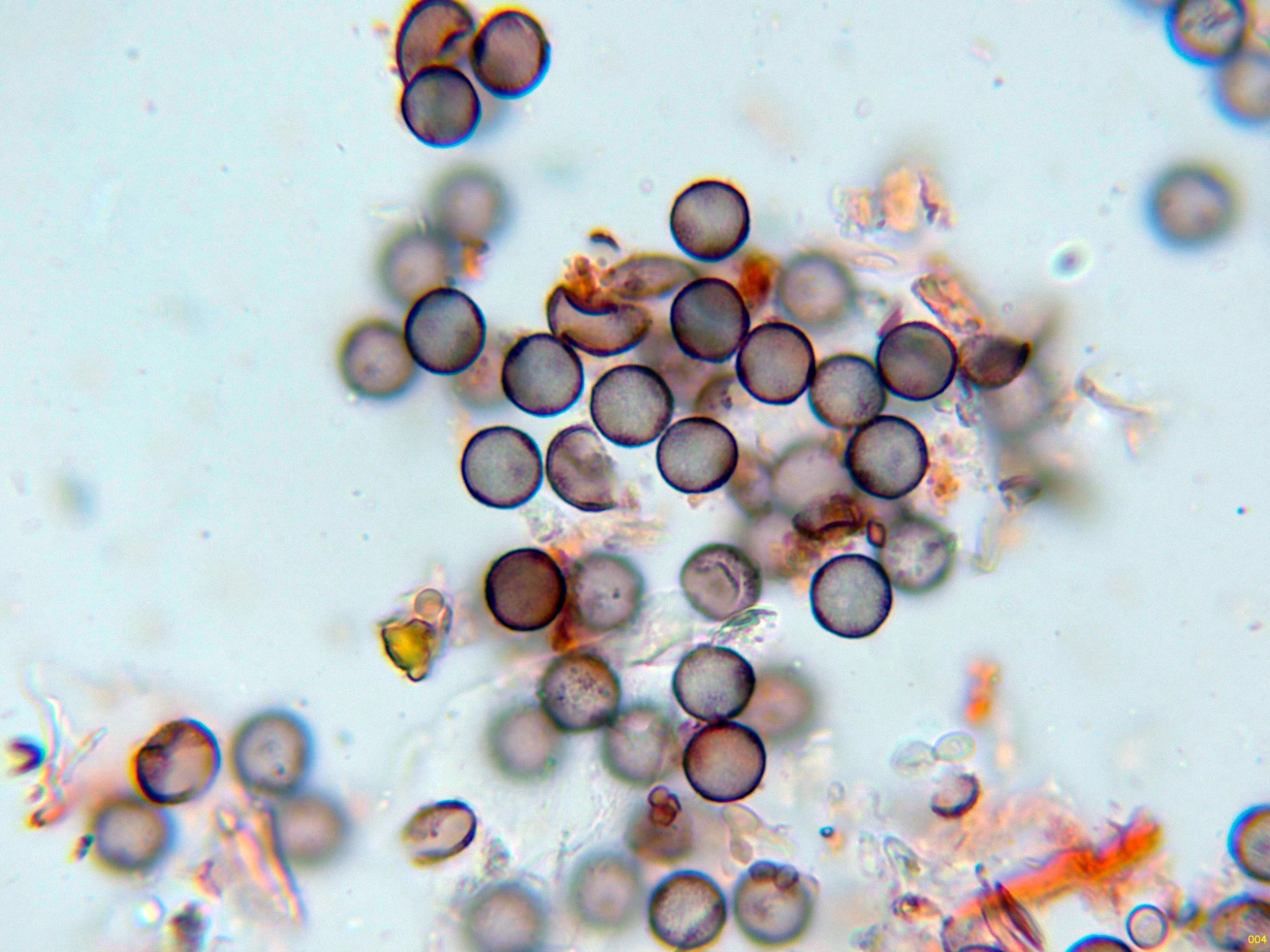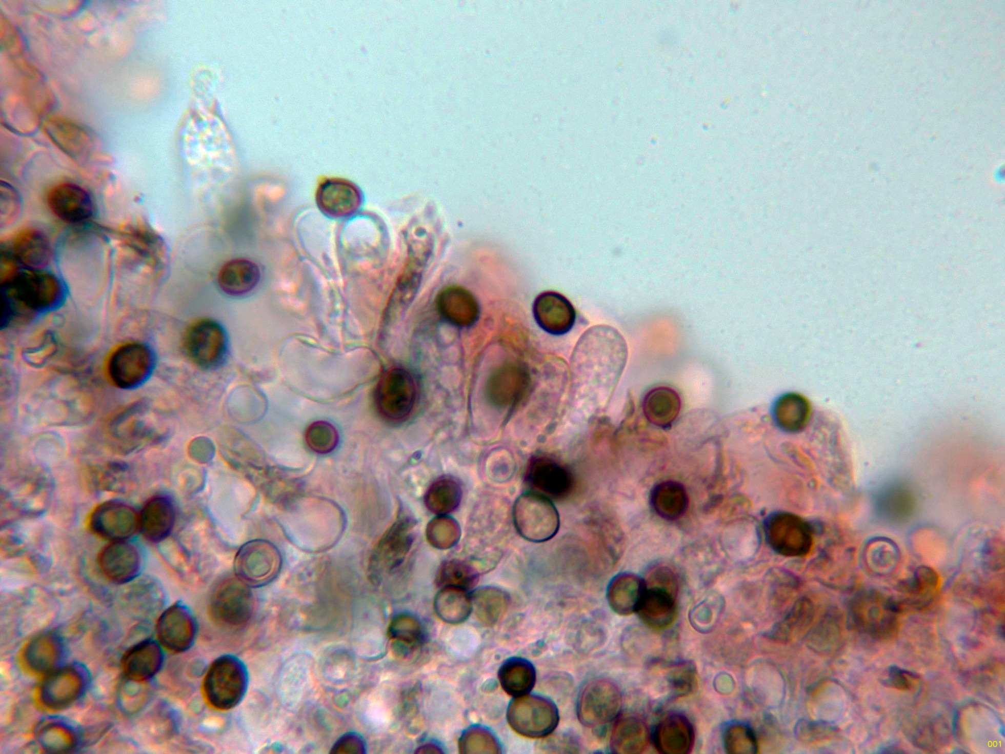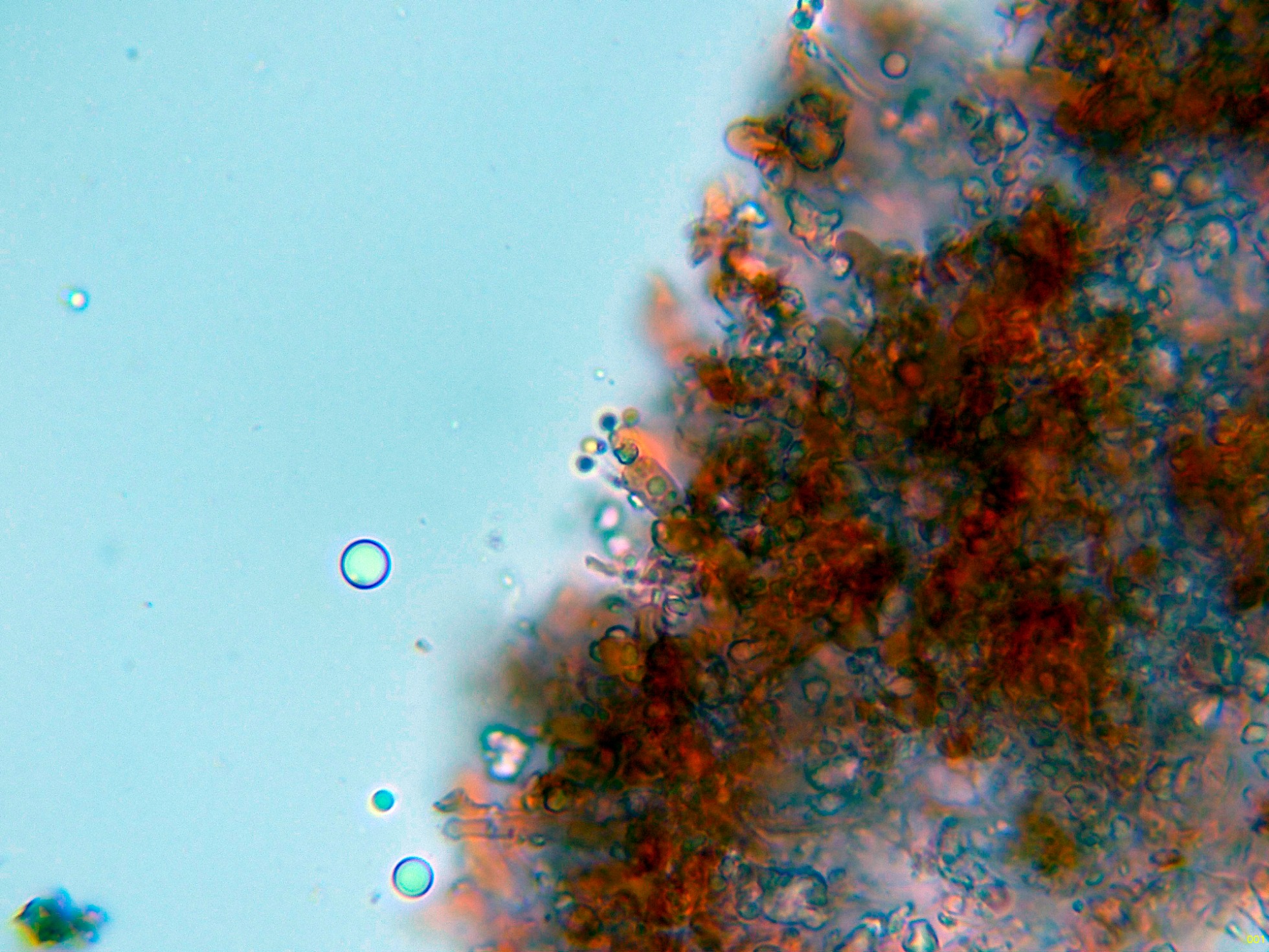 Un Crepidotus, con esporas entre esféricas y subglobosas, tímidamente verrucosas, el Crepidotus cesatii, cuarto estudio que realizo a la especie.