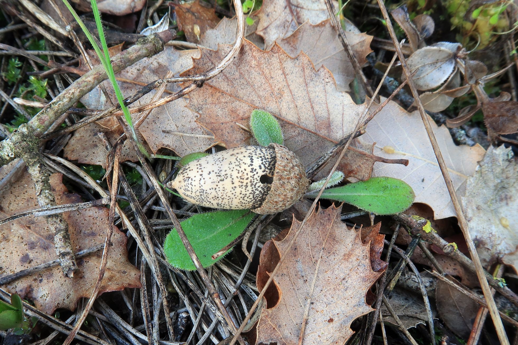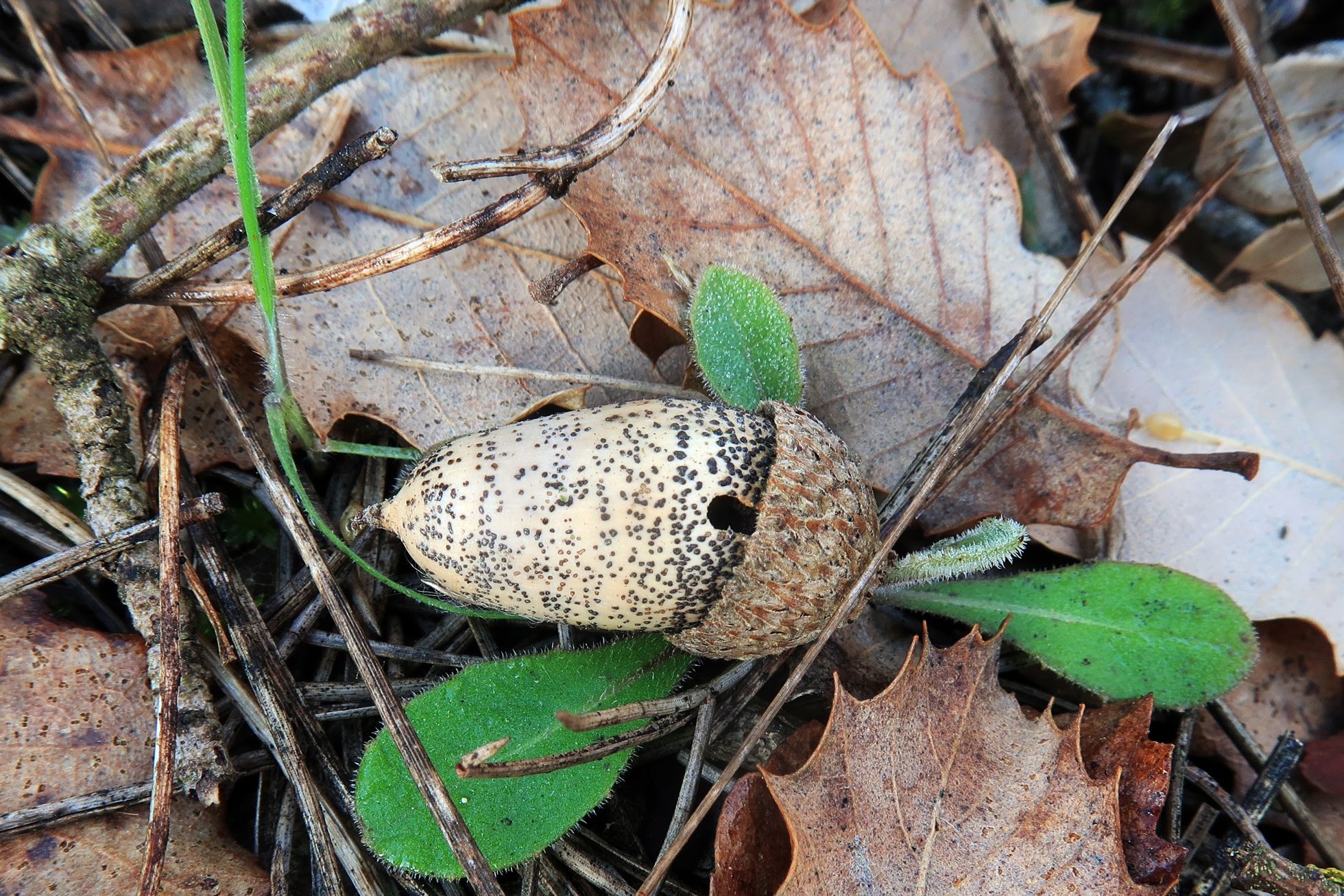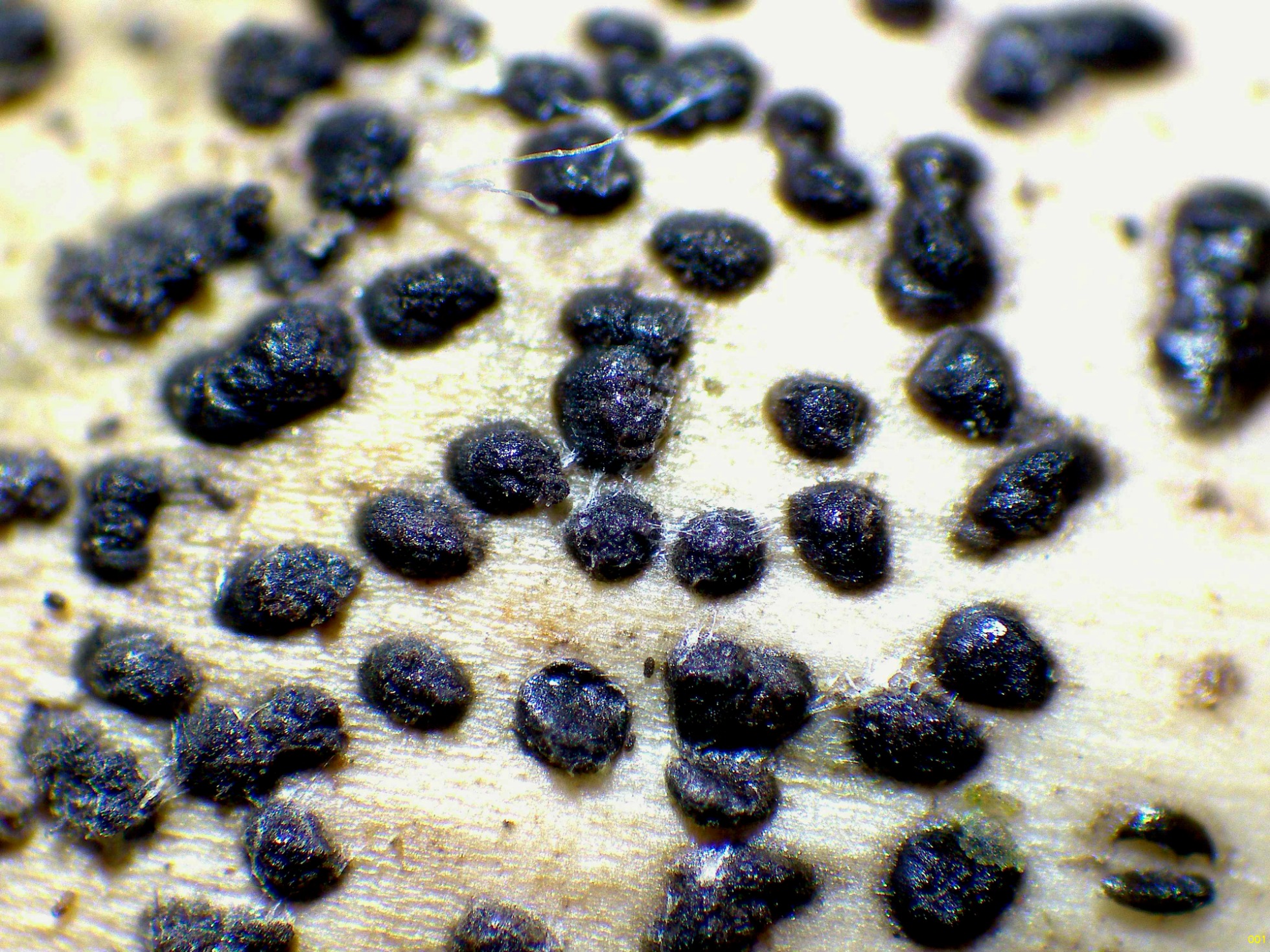 Unos pequeños picnidios brotando de manera abundante sobre una bellota del suelo. Agradecer a Tony Hardware su ayuda en la determinación de la especie.