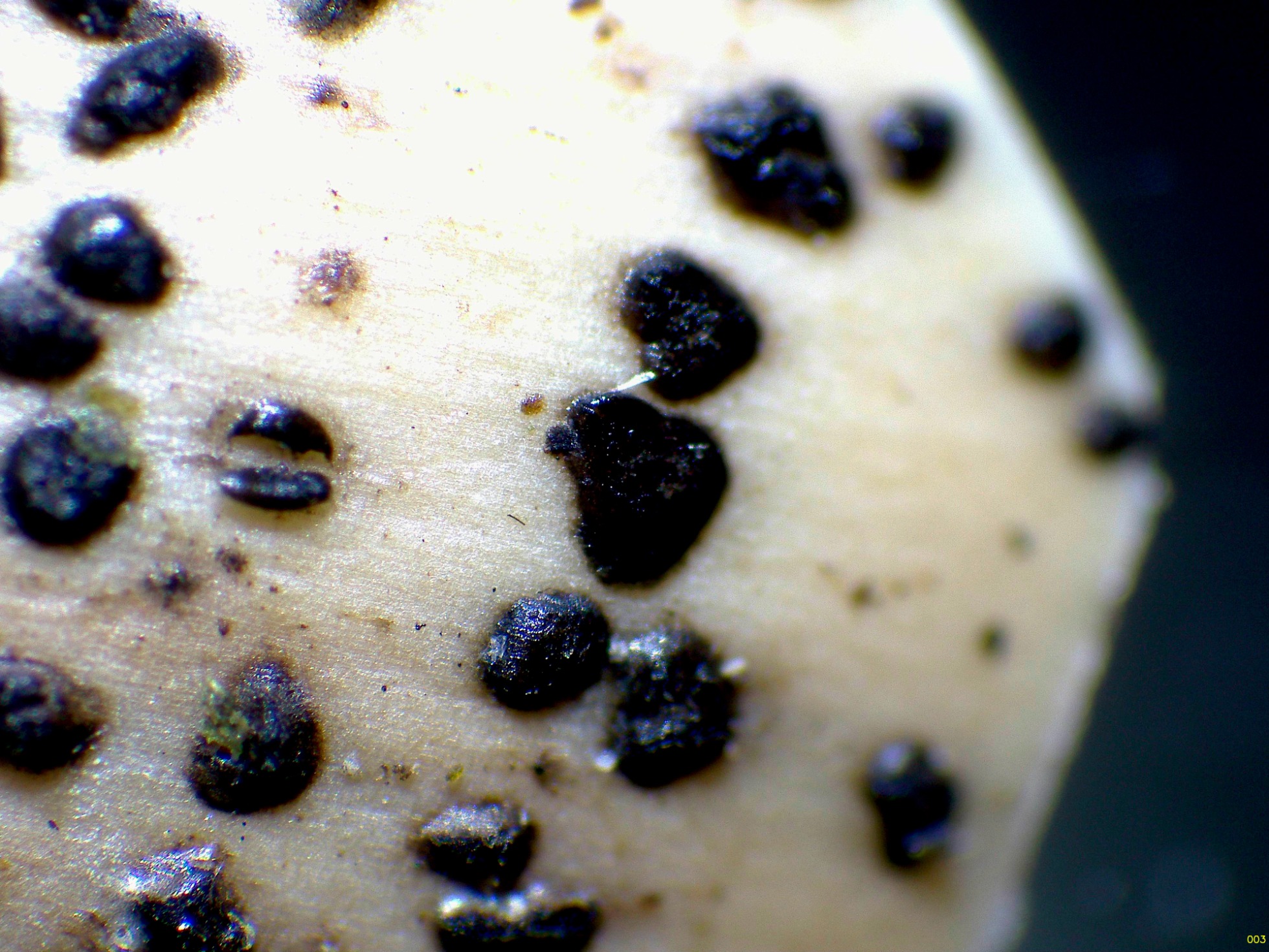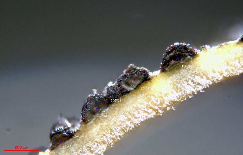 De color negruzco a modo de granos, muy superficiales, poco adheridos al sustrato, con un tamaño de entre 154.54 a 219.7 µm. de ancho y con una altura de entre 70.74 y 123 µm.