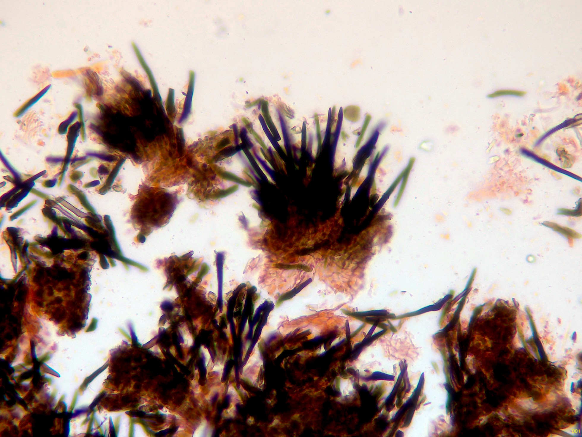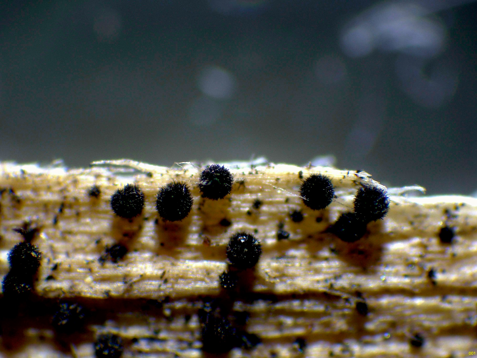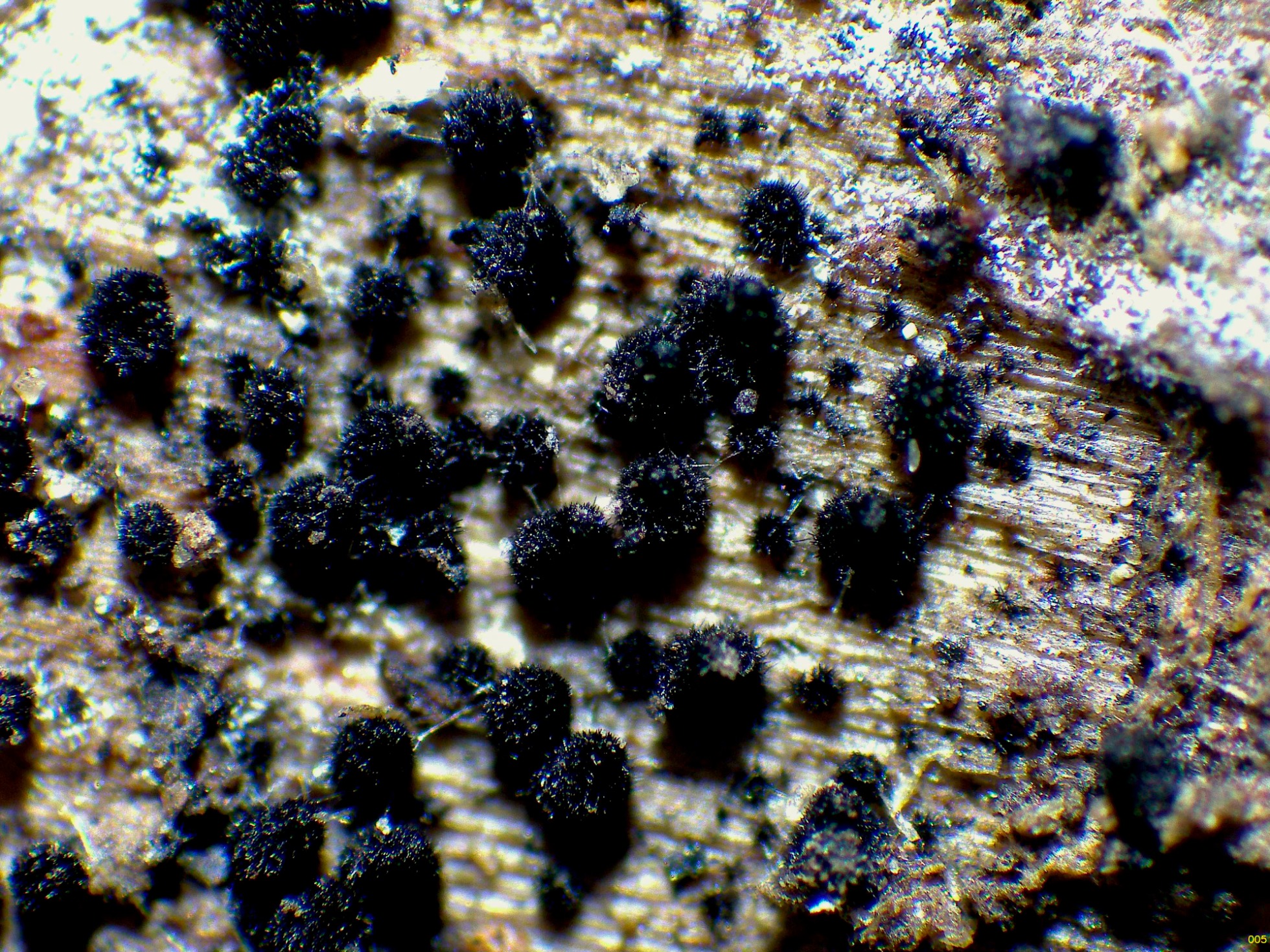 Sus peritecios, globosos, hirsutos y de color negro a 20 aumentos.