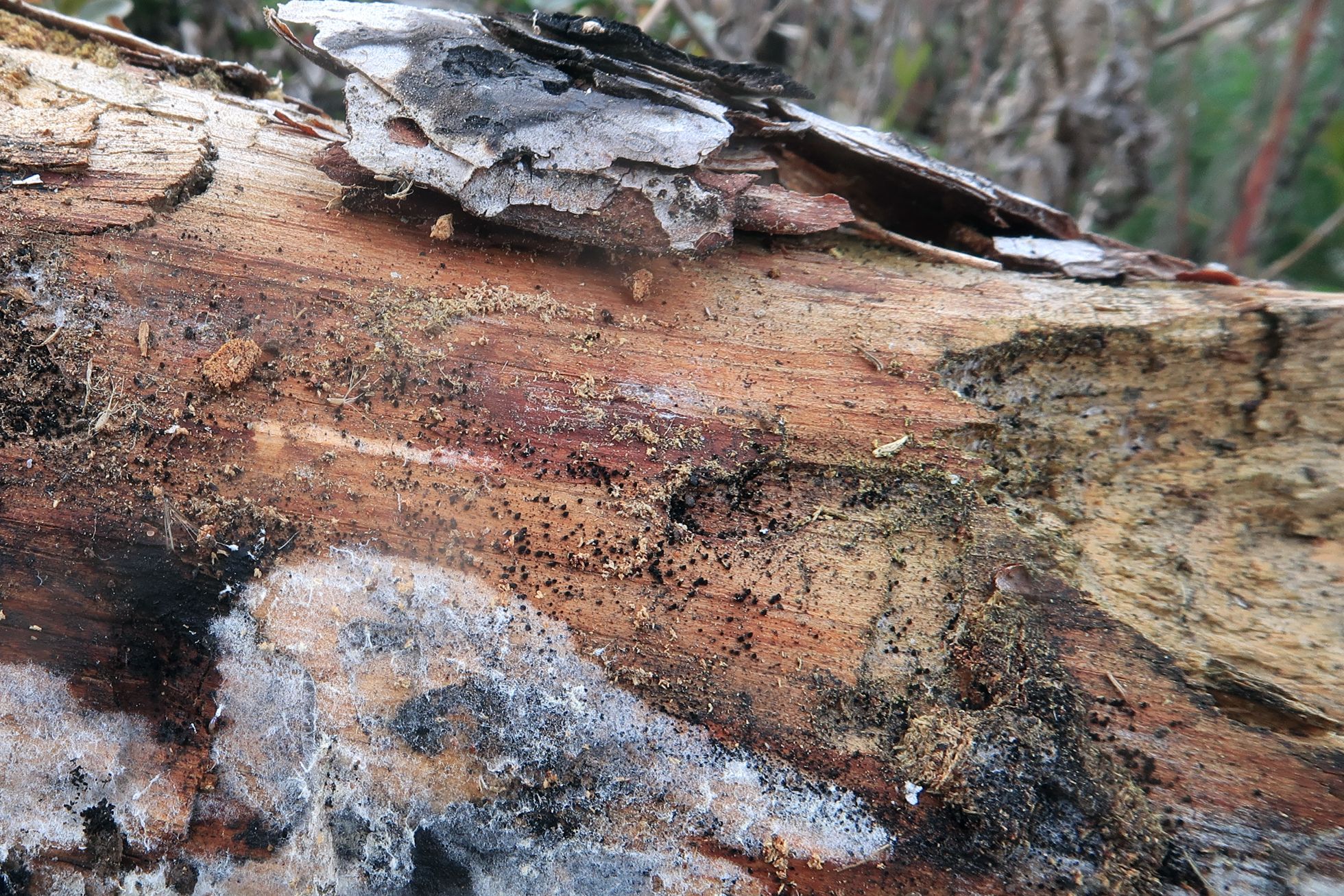 Un muy diminuto hongo de estos que siempre se nos pasan desapercibidos, fotografiado el 29 de marzo (viernes santo) apareciendo sobre la superficie de un tronco descortezado de pino, en una zona de quemado.