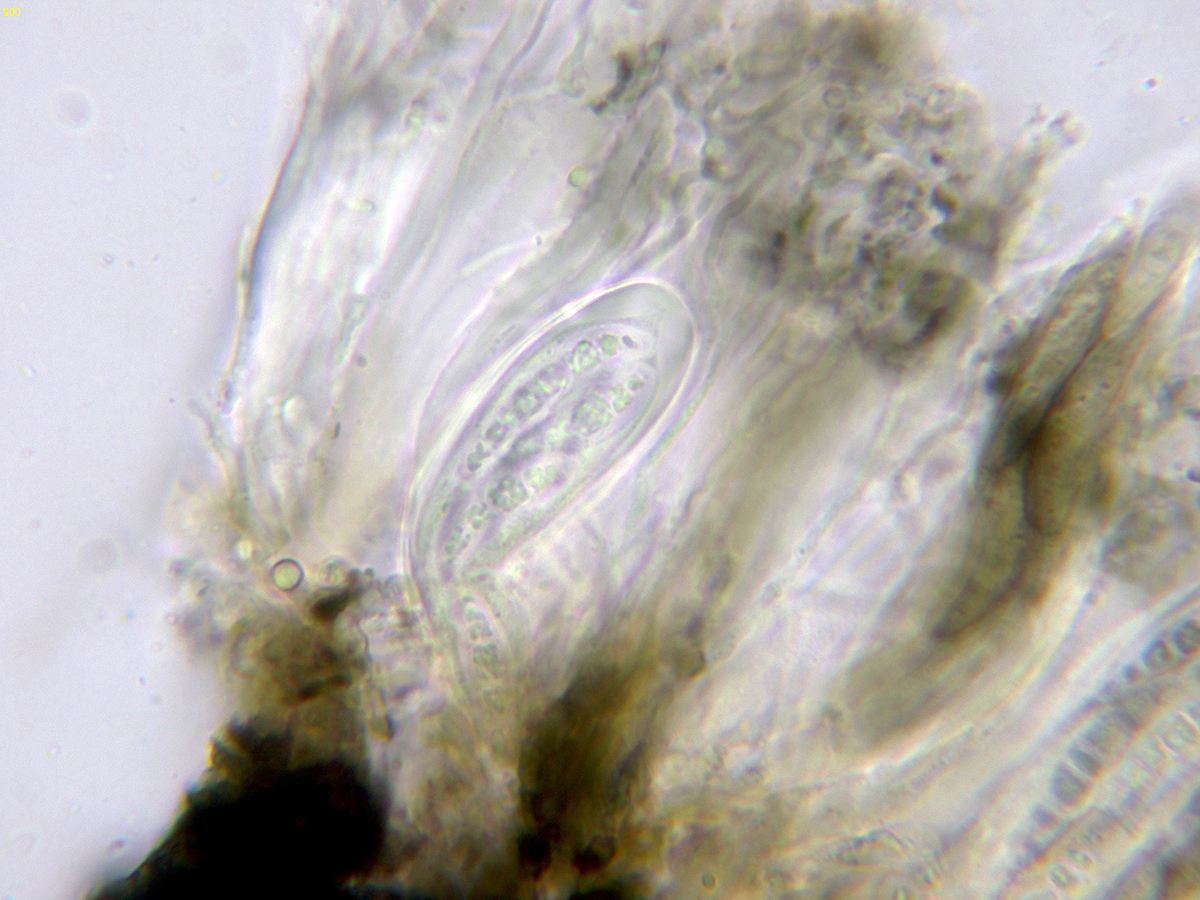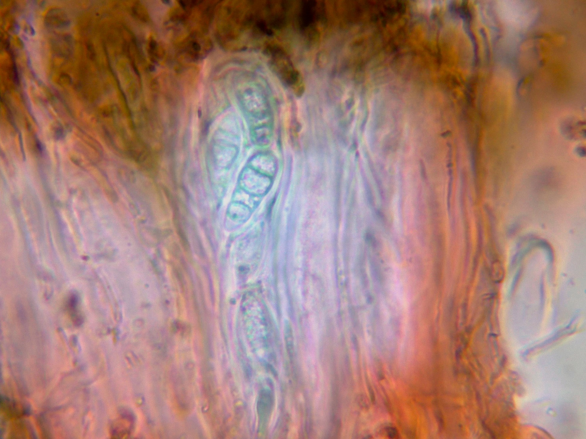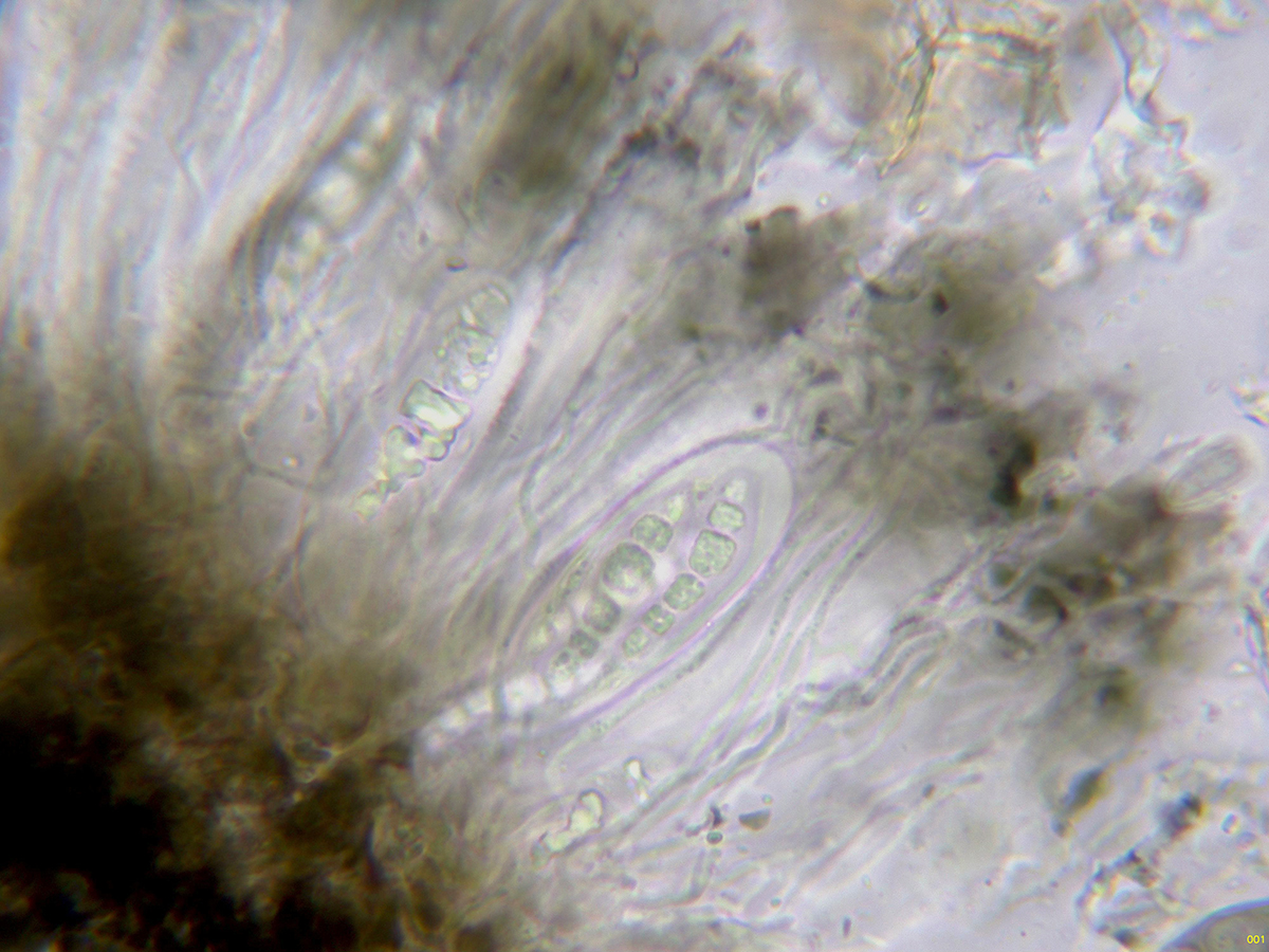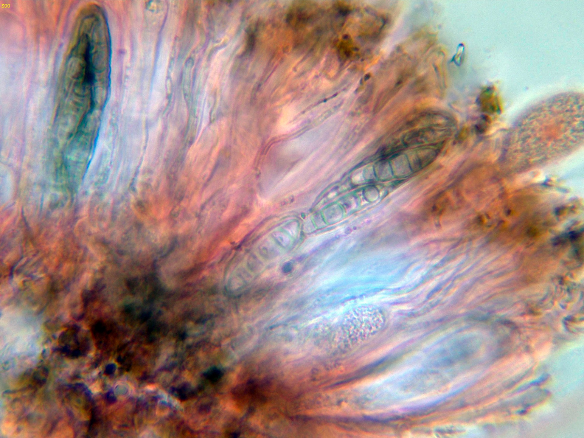 Sin embargo si aplicamos Lugol, previo tratamiento por espacio de 6 horas con KOH, el himenio adquiere un color rojizo, característica bastante común dentro de los Arthoniomycetes.
