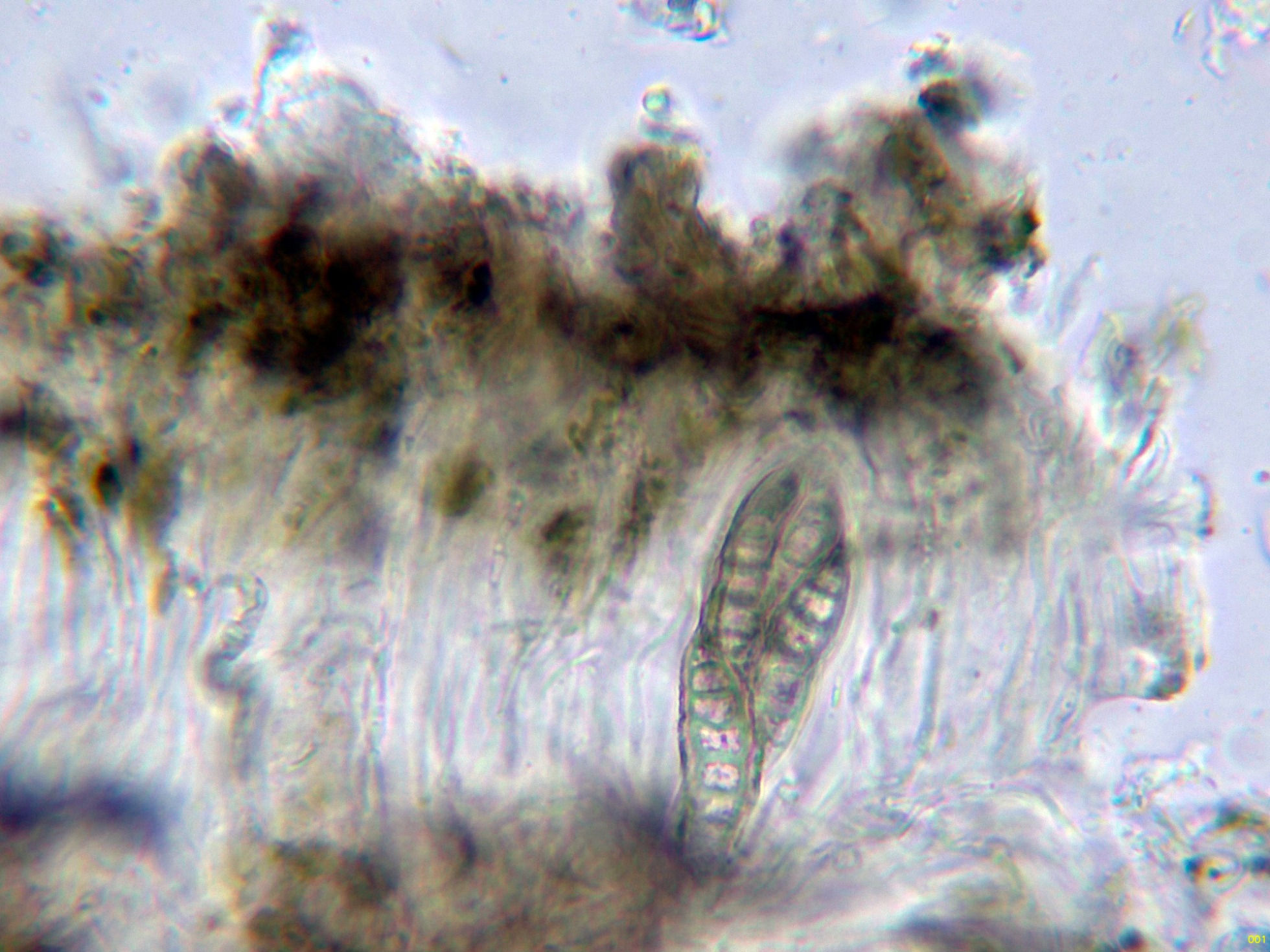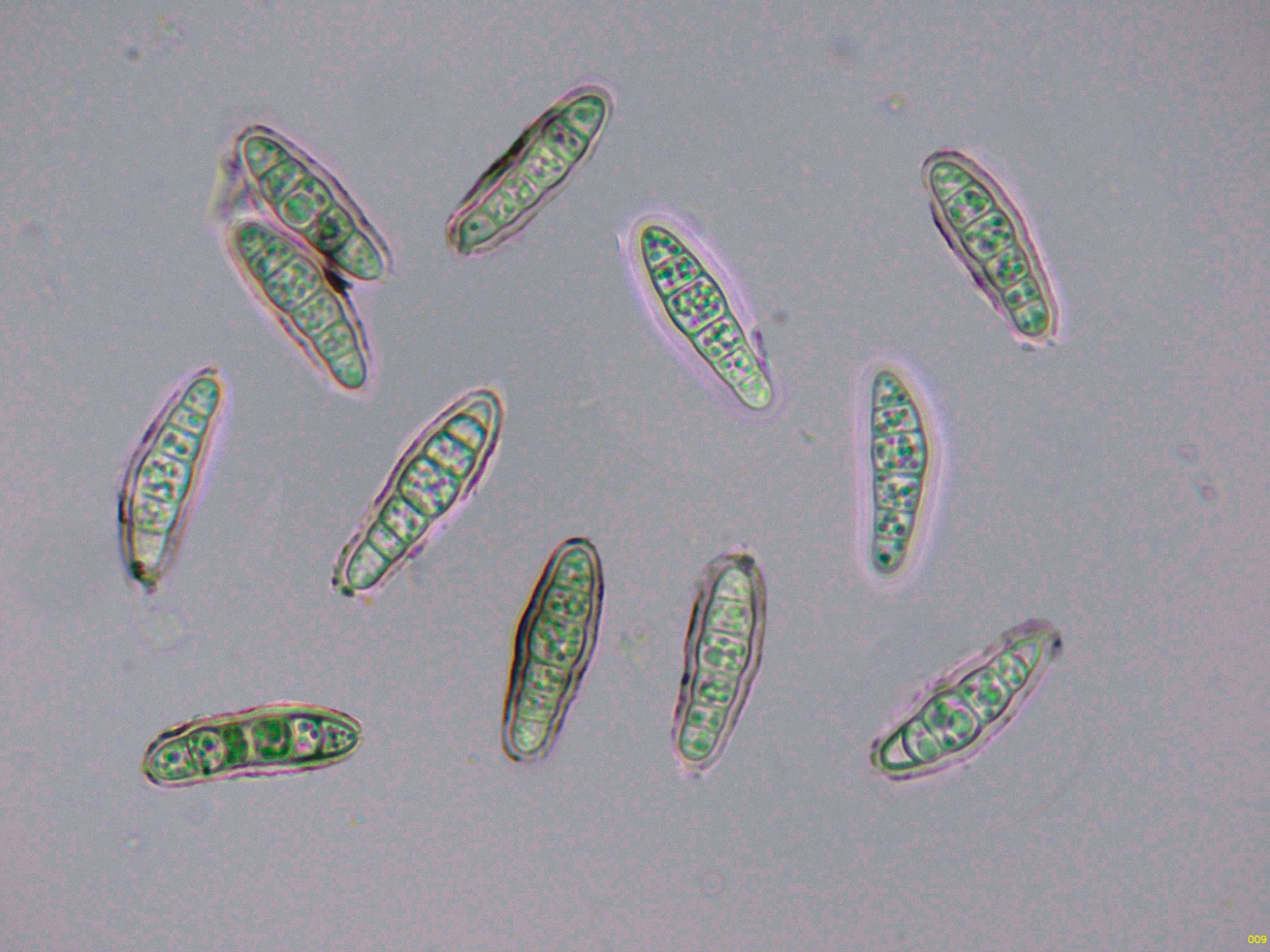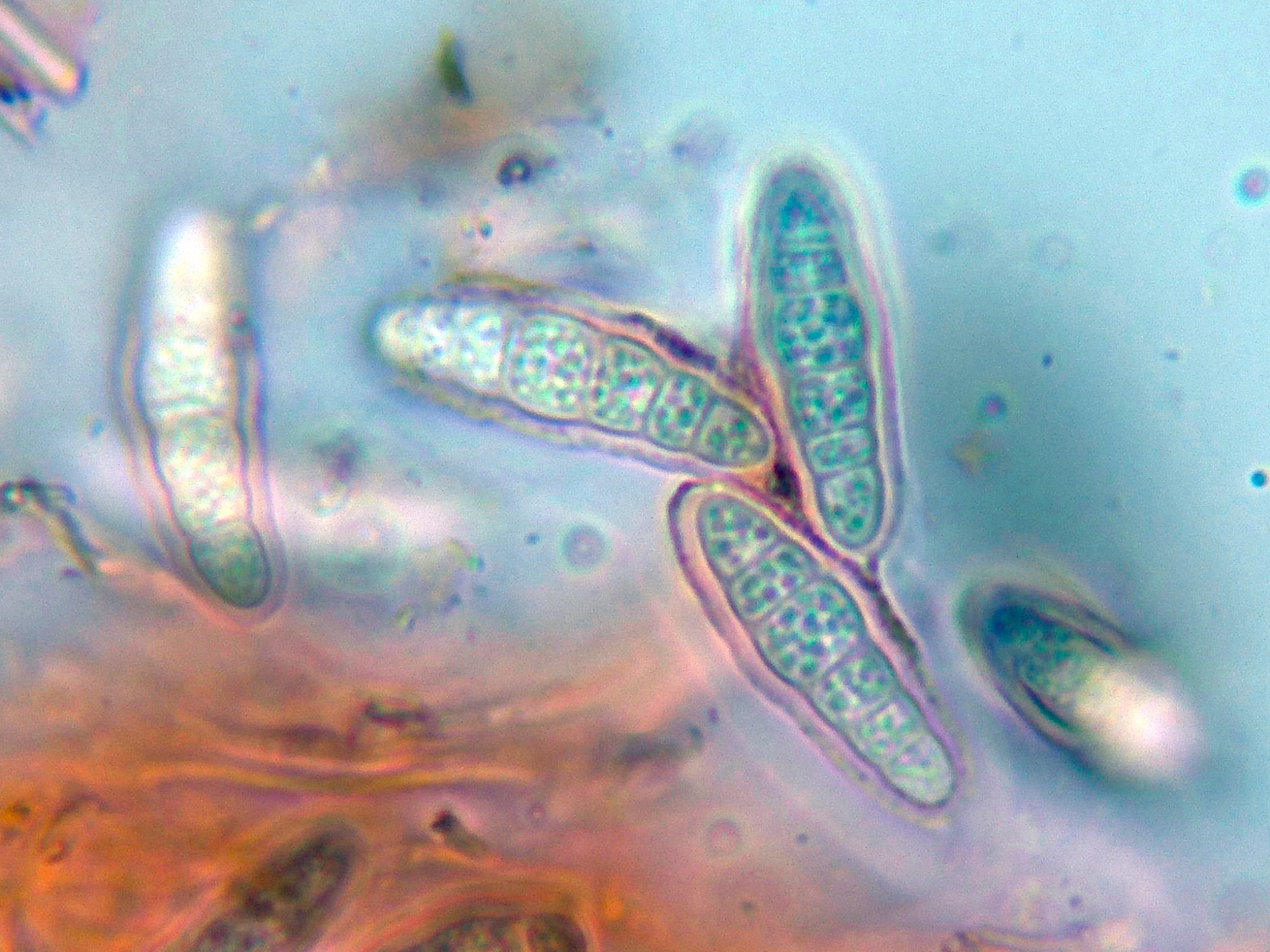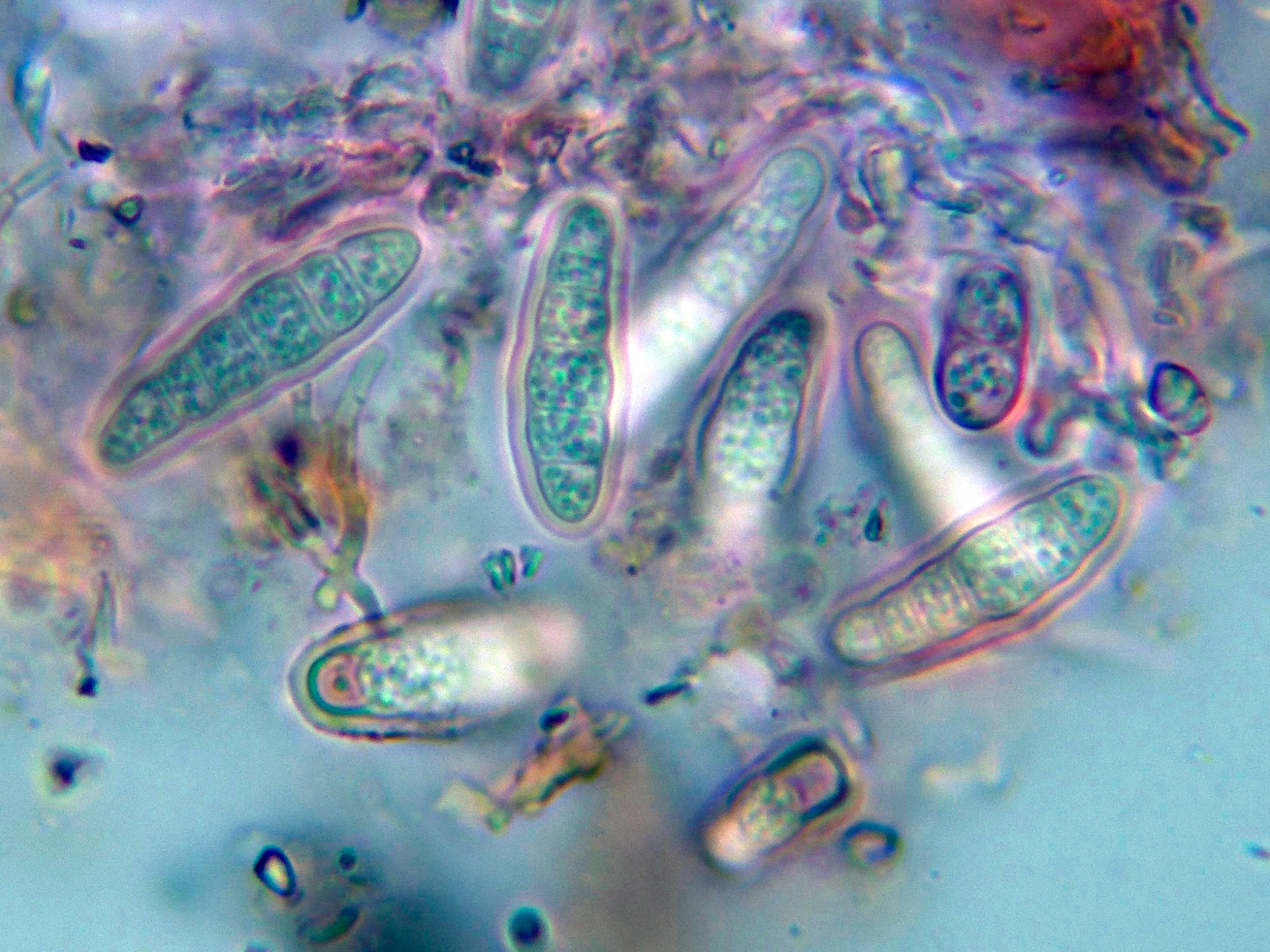 Ascosporas fusiformes, mayoritariamente con 5 septos (según bibliografía de 4 a 6) con constreñimiento en los mismos, y con una vaina mucilaginosa muy regular en toda su superficie, con unas medidas de las esporas libres sin contar esta vaina de: