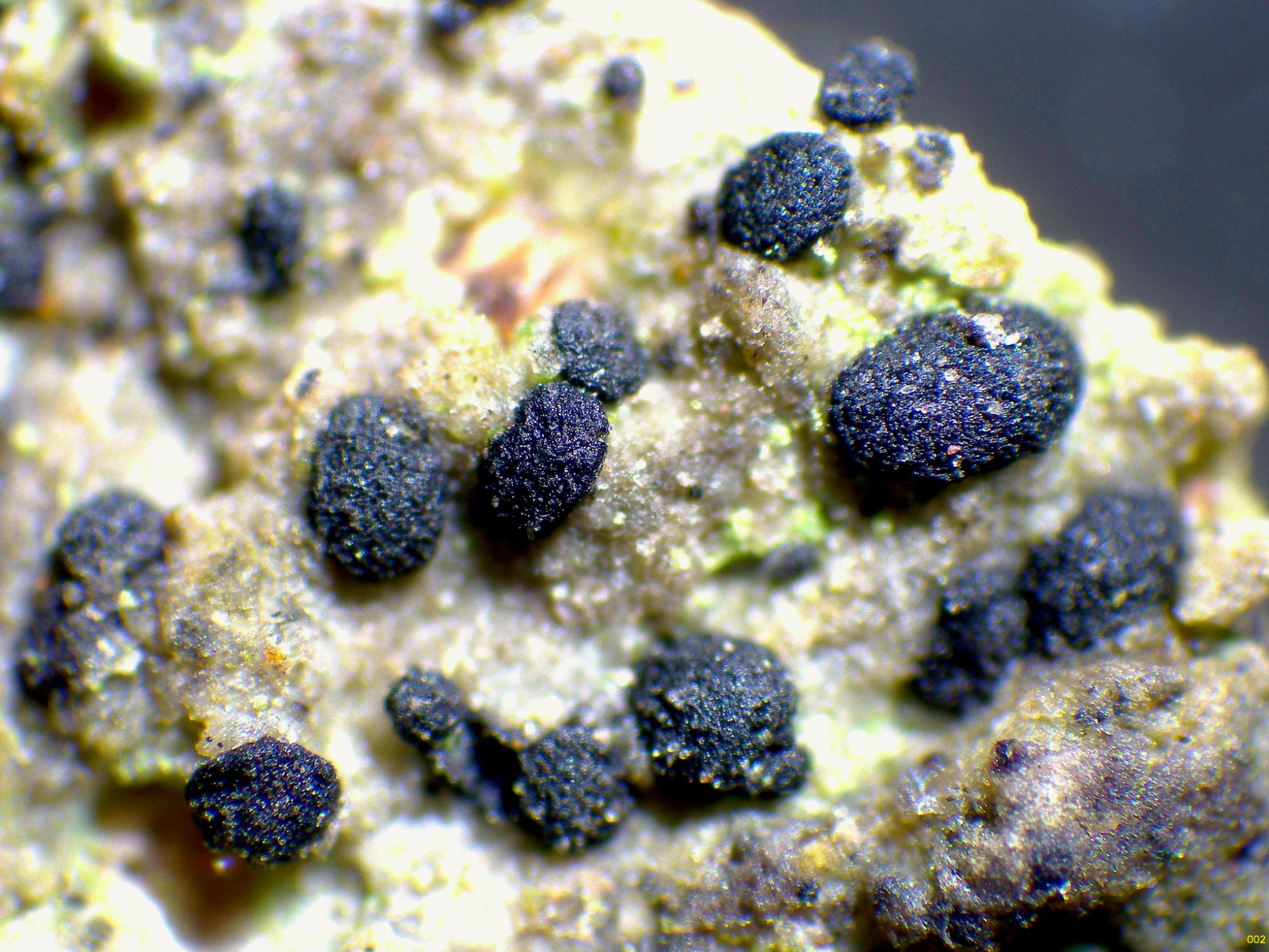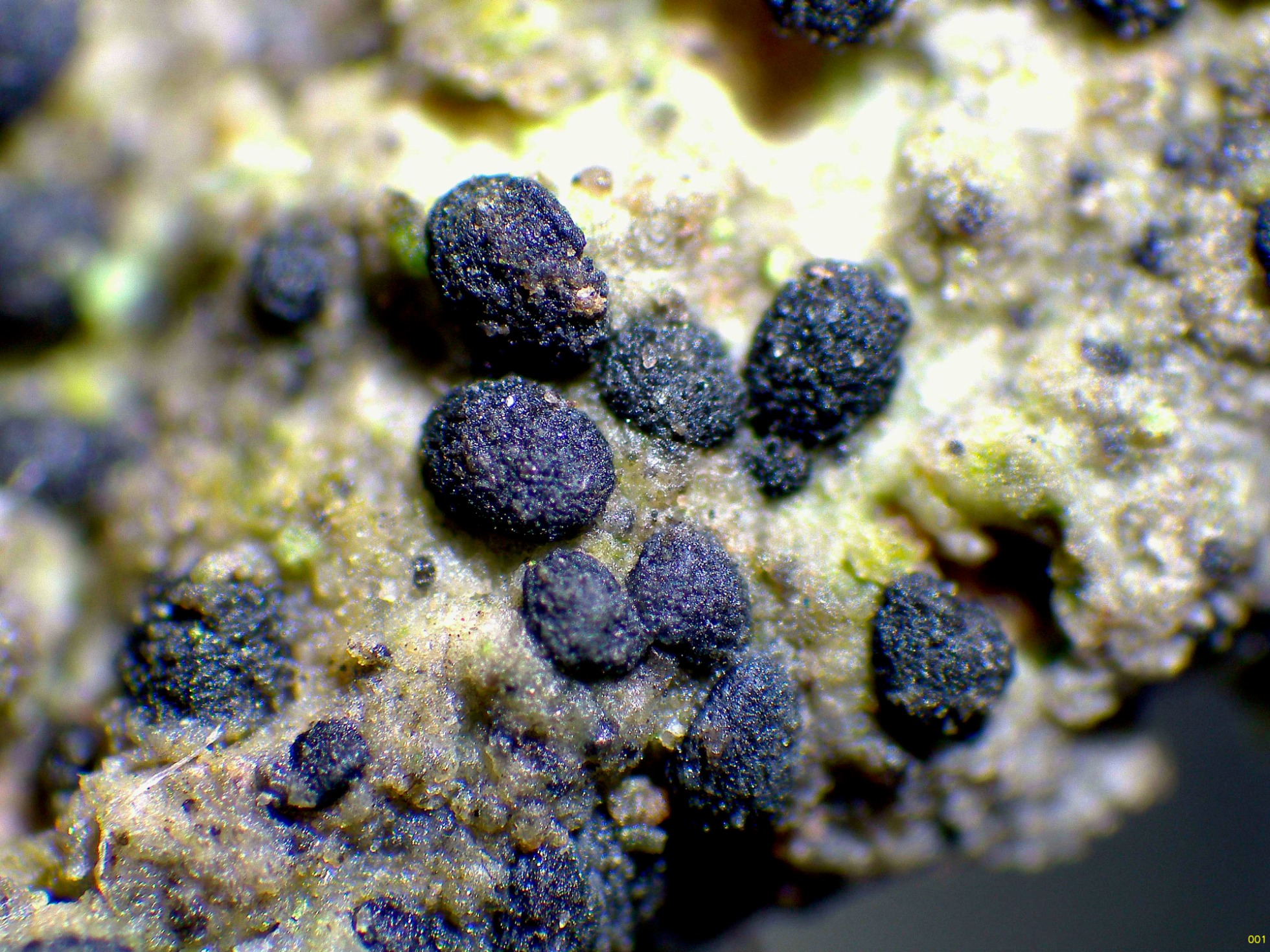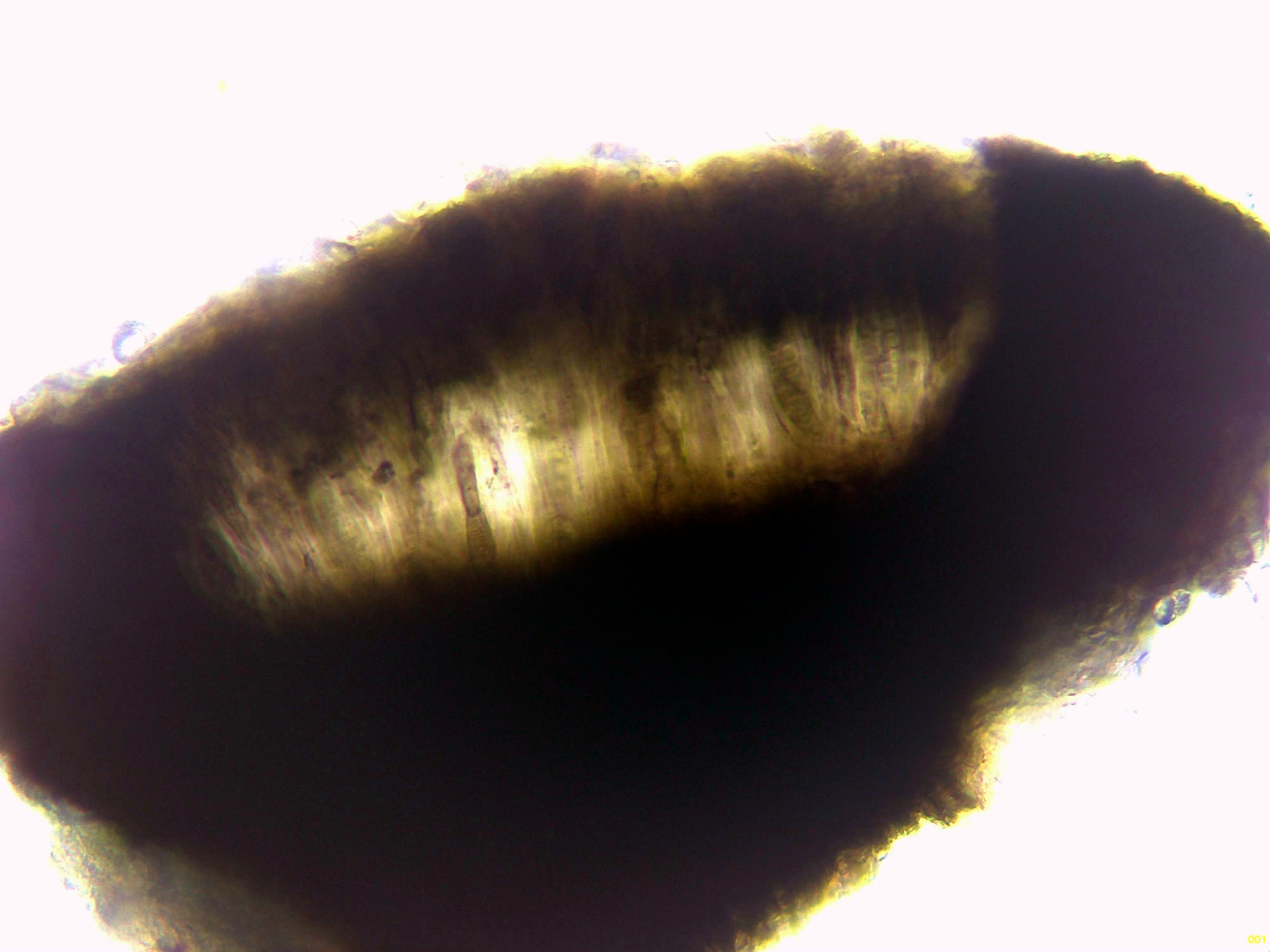 La sección de los apotecios con ya luz directa y a 400 aumentos, donde se puede apreciar su borde carbonoso, este detalle lo separa de su posible confusión, la Arthonia reniformis, que carece de este borde carbonoso.