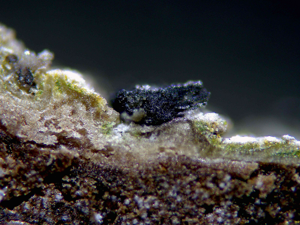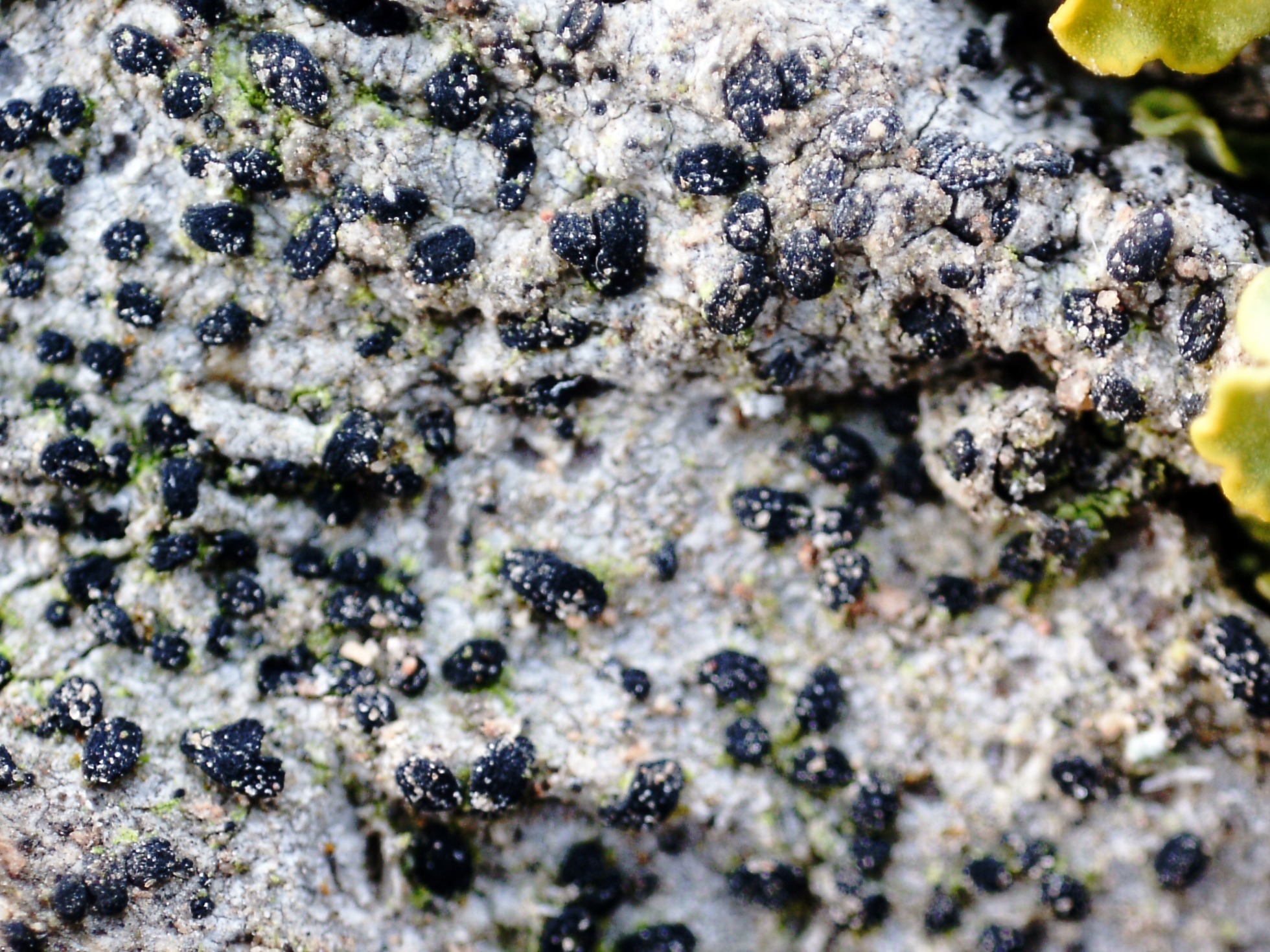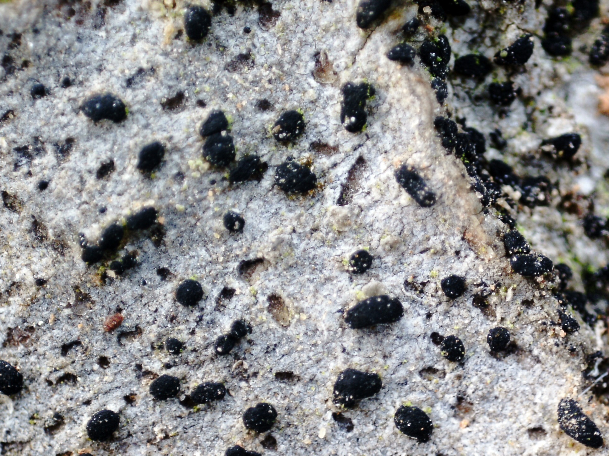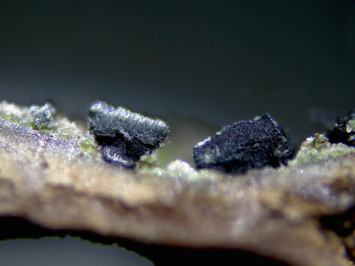 La sección de los apotecios con ya luz directa y a 400 aumentos, donde se puede apreciar su borde carbonoso, este detalle lo separa de su posible confusión, la Arthonia reniformis, que carece de este borde carbonoso.