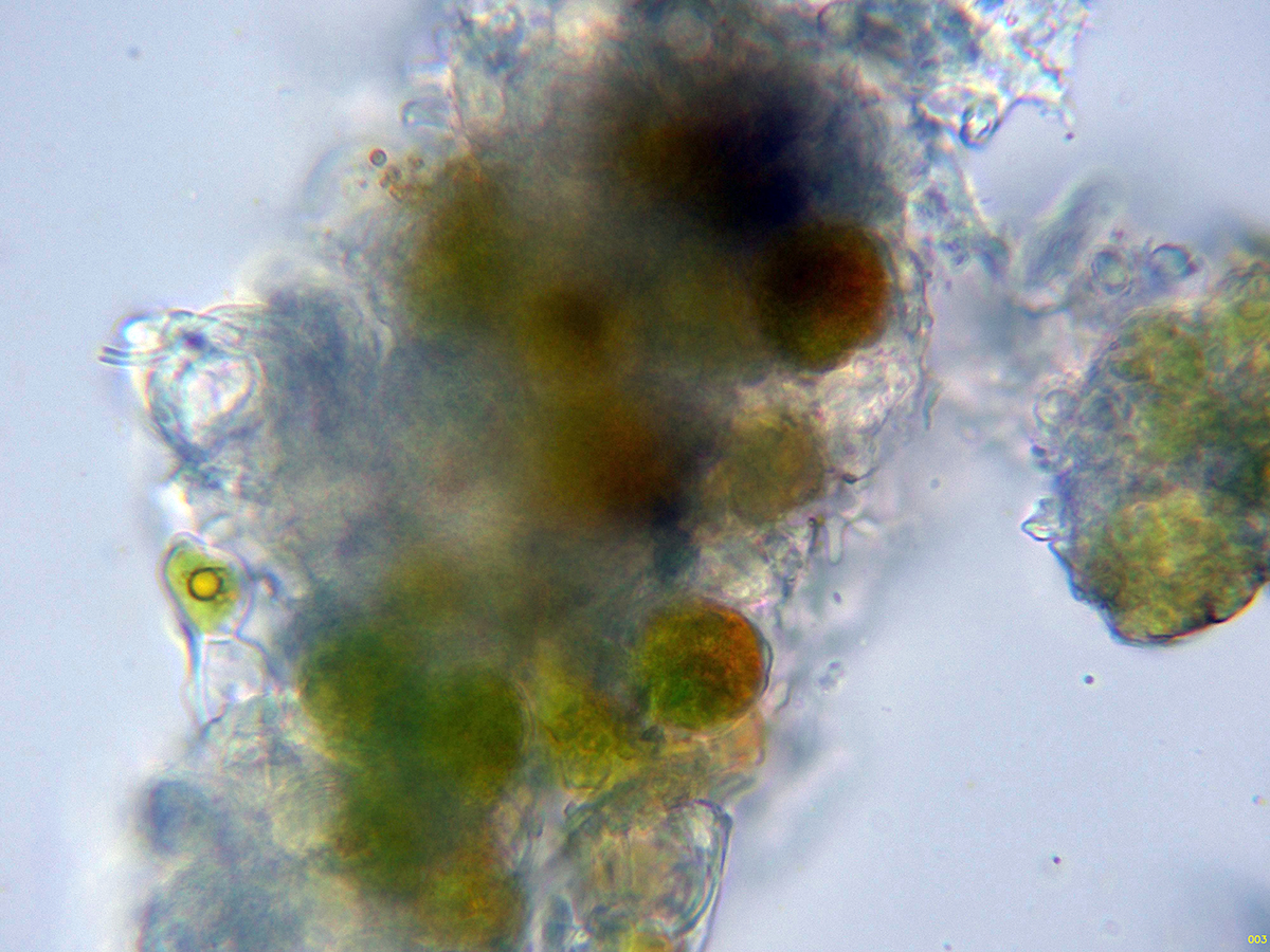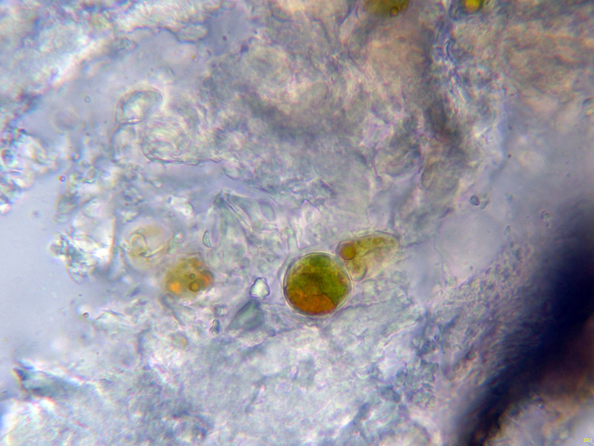 Un par de imágenes del alga fotobionte (Trentepohlia) con carotenos naranjas.