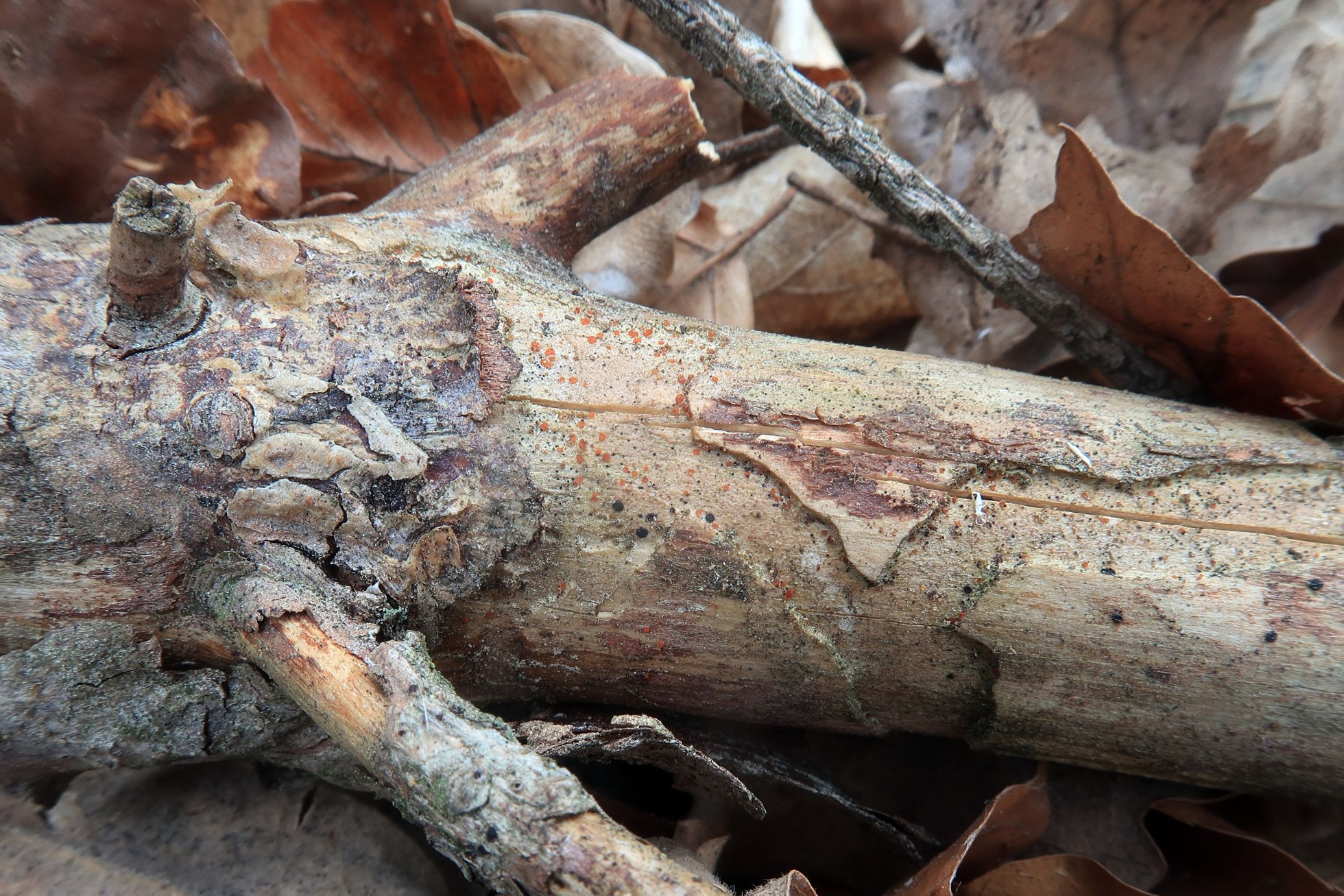 Unos pocos apotecios recolectados el domingo 7 de abril, bajo hayas y robles, sobre la superficie descortezada de un tronco tumbado del suelo, compartiendo espacio con lo que parece ser Orbilia eucalypti.