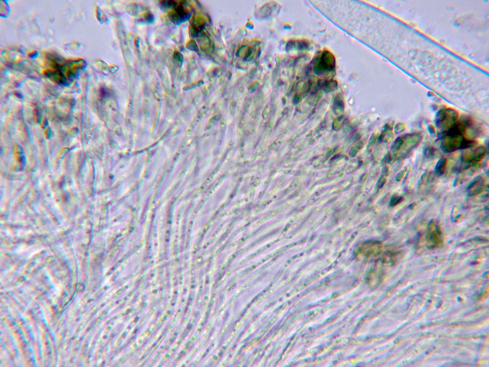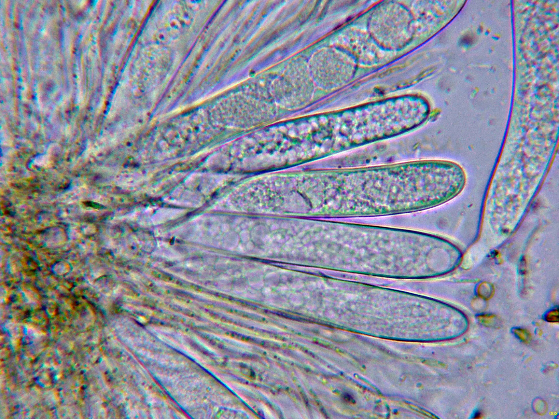 Materia interascal a modo de paráfisis, filiformes, con una anchura de apenas 1 µm., con sustancia amorfa oscura en el ápice y que sobresalen ligeramente por encima del nivel de los ascos.
