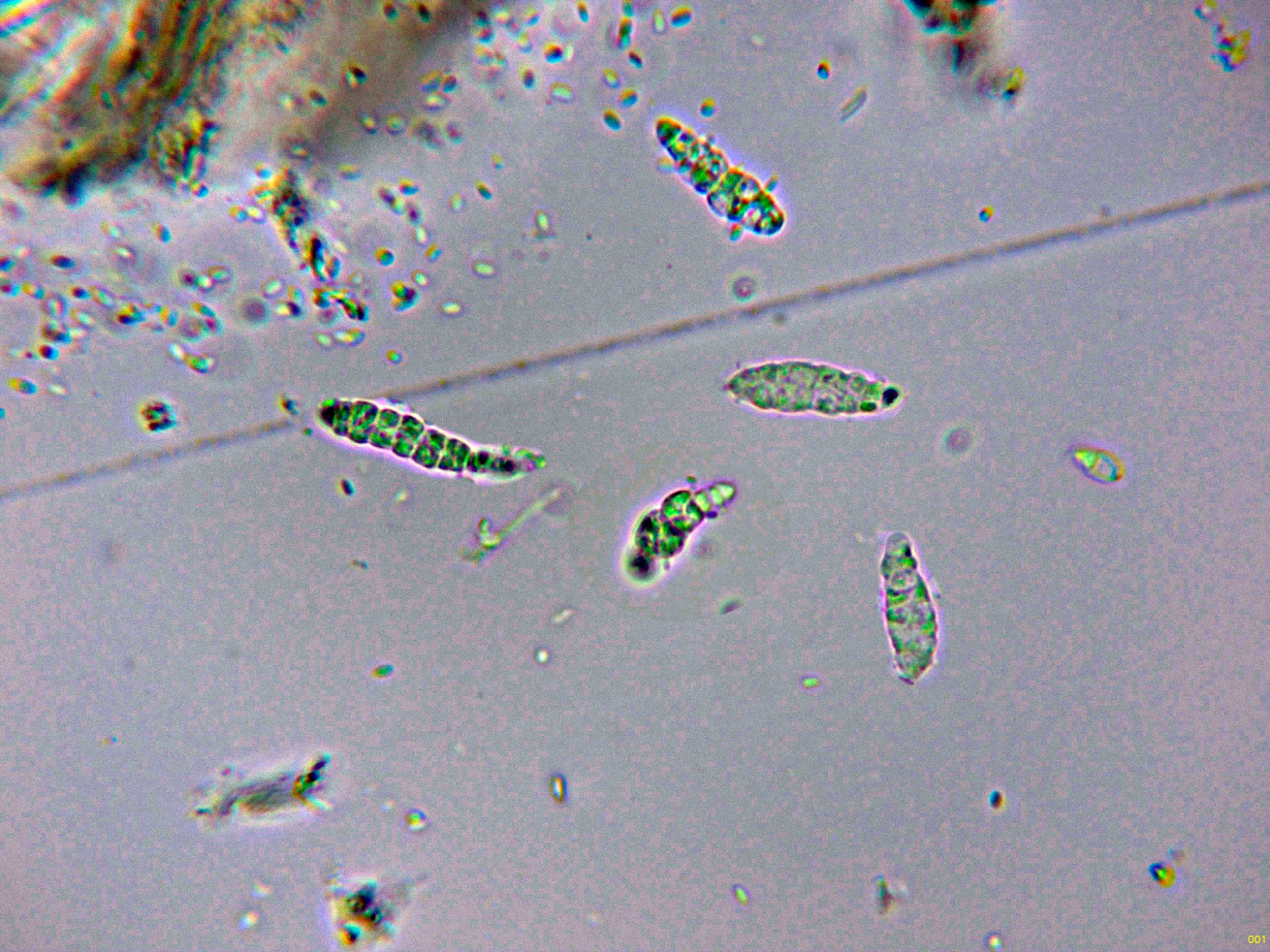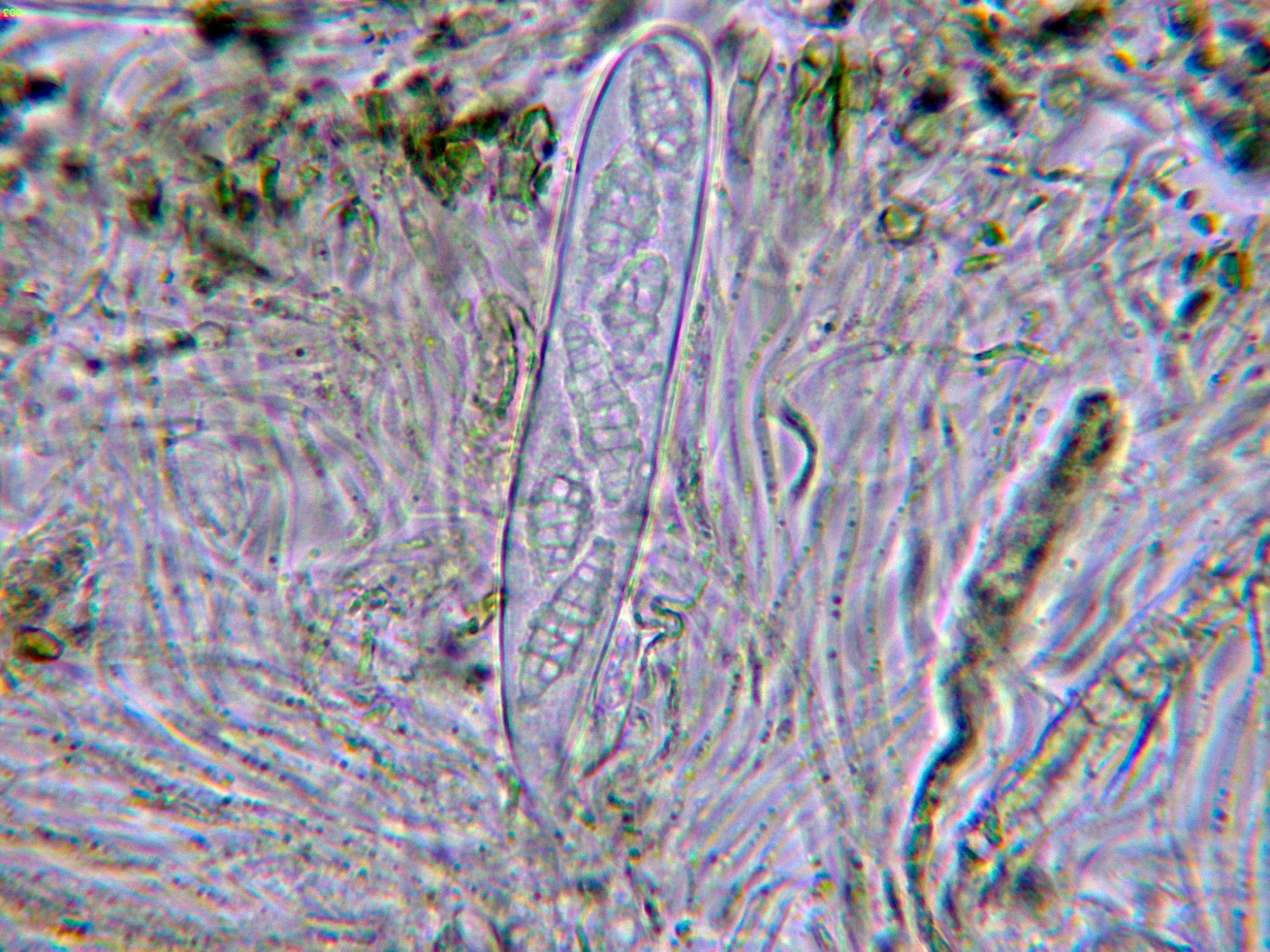 Ascosporas libres muy escasas en las muestras, estas ascosporas entre fusiformes y moriformes, con un extremo algo más apuntado, con 8 a 10 septos transversales y algunos septos longitudinales, con unas medidas de 15.1 - 21.1 × 4.8 - 5.4 µm.