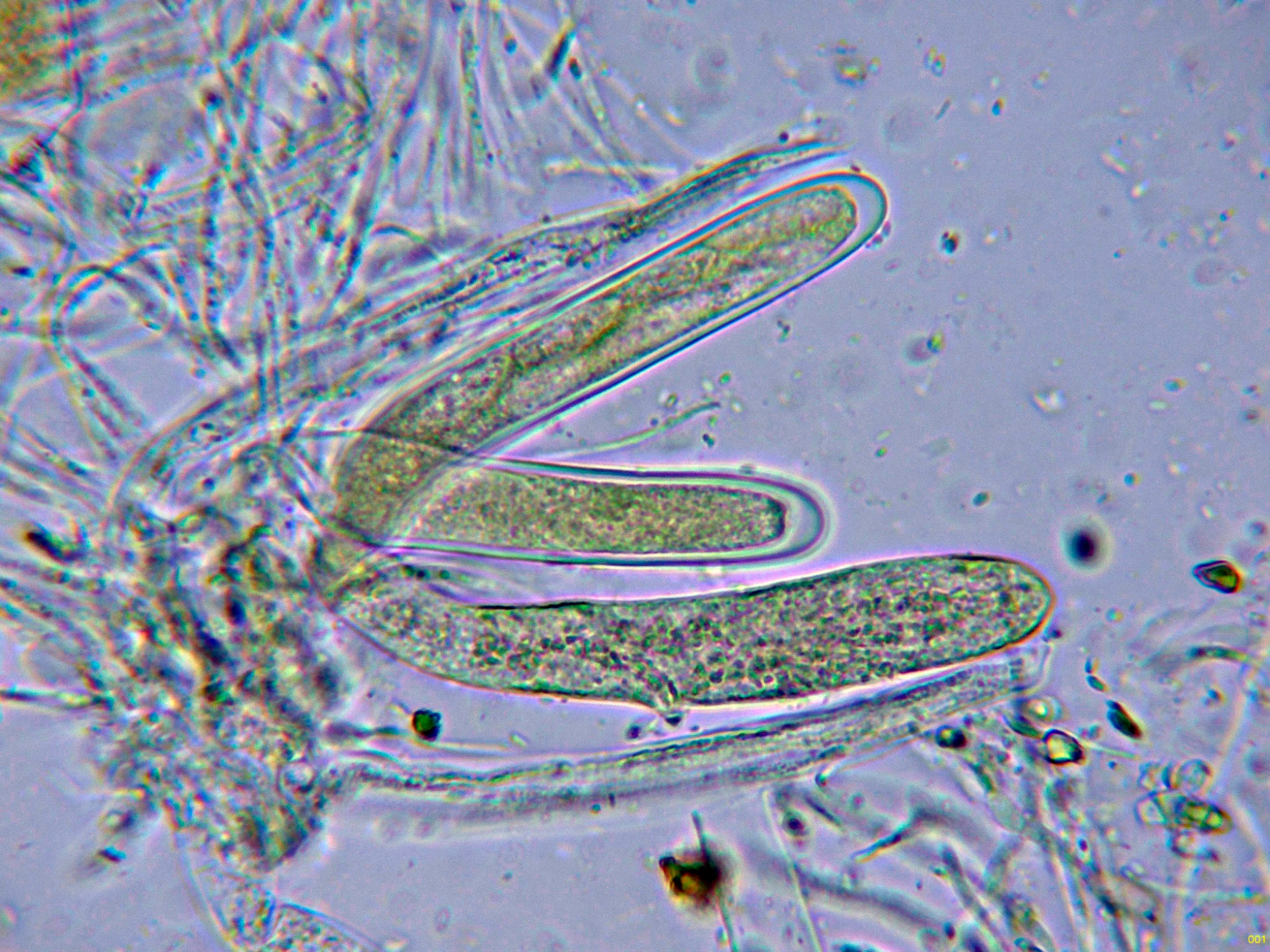 Ascos octospóricos, aparentemente bitunicados, aunque esta característica nunca la he podido observar con claridad, con unas medidas de (75.8) 78.9 - 96.8 (101.9) × (11) 11.1 - 14.4 (16.1) µm. con una media de Me = 89 × 12.9 µm., sin ninguna reacción considerable frente al Lugol.