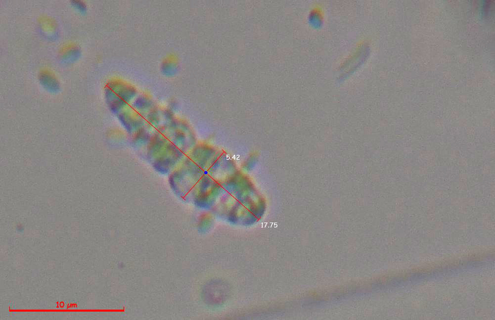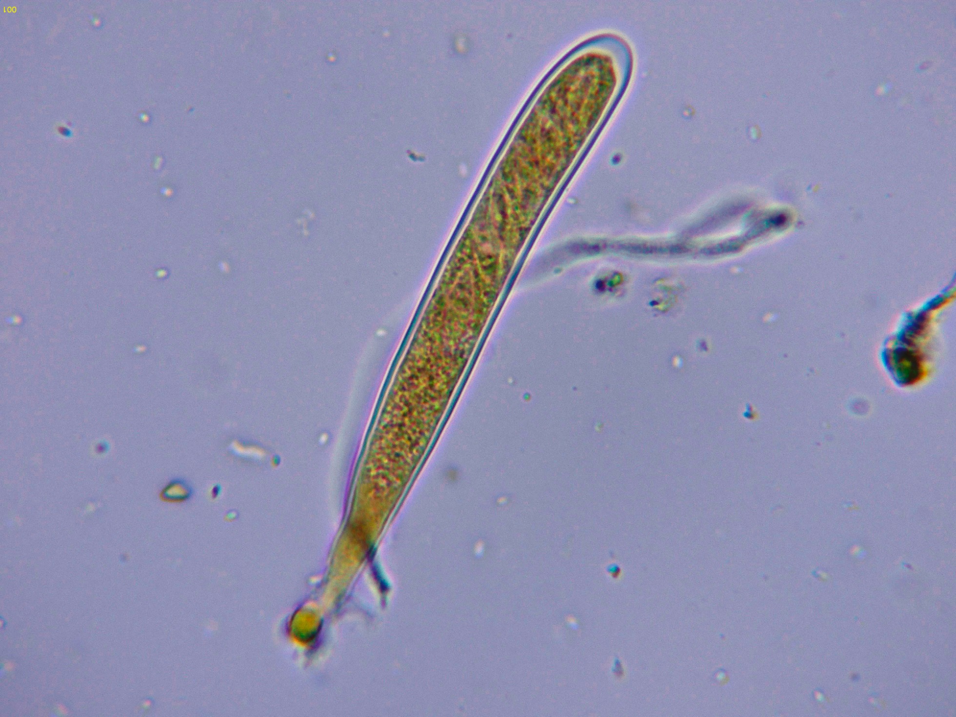 Las ascosporas en agua y en la parte superior izquierda de la imágen los ascoconidios elipsoidales.