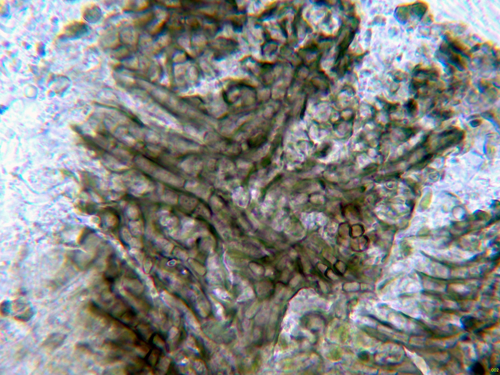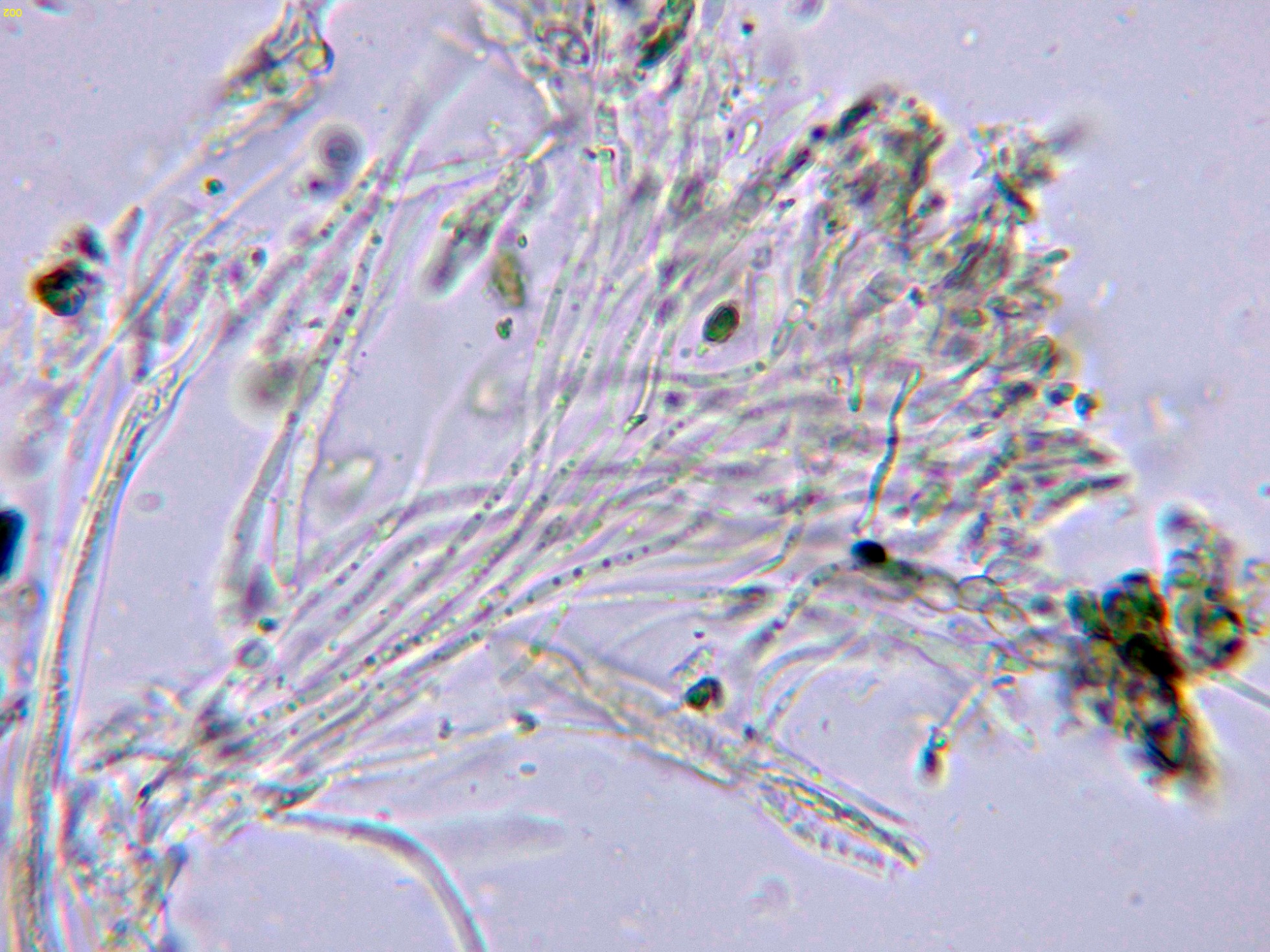 Las hifas del excípulo en agua con pigmento intracelular marrón.